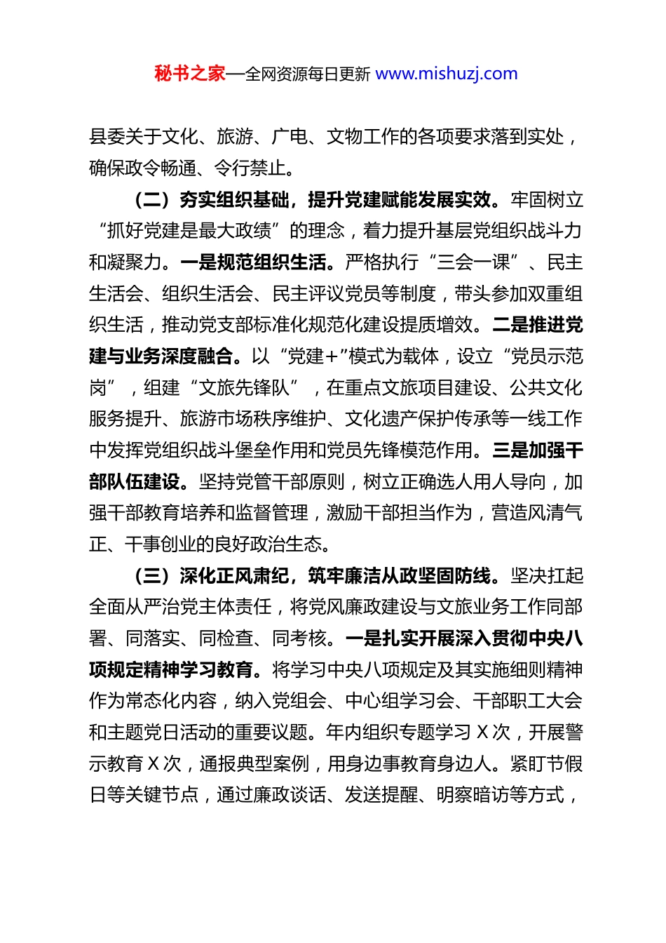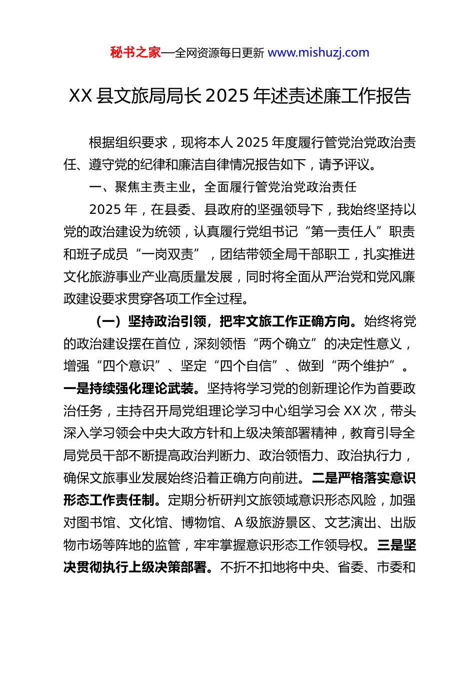 秘书之家—全网资源每日更新 www.mishuzj.comXX 县文旅局局长 2025 年述责述廉工作报告根据组织要求,现将本人 2025 年度履行管党治党政治责任、遵守党的纪律和廉洁自律情况报告如下,请予评议。一、聚焦主责主业,全面履行管党治党政治责任2025 年,在县委、县政府的坚强领导下,我始终坚持以党的政治建设为统领,认真履行党组书记“第一责任人”职责和班子成员“一岗双责”,团结带领全局干部职工,扎实推进文化旅游事业产业高质量发展,同时将全面从严治党和党风廉政建设要求贯穿各项工作全过程。(一)坚持政治引领,把牢文旅工作正确方向。始终将党的政治建设摆在首位,深刻领悟“两个确立”的决定性意义,增强“四个意识”、坚定“四个自信”、做到“两个维护”。一是持续强化理论武装。坚持将学习党的创新理论作为首要政治任务,主持召开局党组理论学习中心组学习会 XX 次,带头深入学习领会中央大政方针和上级决策部署精神,教育引导全局党员干部不断提高政治判断力、政治领悟力、政治执行力,确保文旅事业发展始终沿着正确方向前进。二是严格落实意识形态工作责任制。定期分析研判文旅领域意识形态风险,加强对图书馆、文化馆、博物馆、A 级旅游景区、文艺演出、出版物市场等阵地的监管,牢牢掌握意识形态工作领导权。三是坚决贯彻执行上级决策部署。不折不扣地将中央、省委、市委和秘书之家—全网资源每日更新 www.mishuzj.com县委关于文化、旅游、广电、文物工作的各项要求落到实处,确保政令畅通、令行禁止。(二)夯实组织基础,提升党建赋能发展实效。牢固树立“抓好党建是最大政绩”的理念,着力提升基层党组织战斗力和凝聚力。一是规范组织生活。严格执行“三会一课”、民主生活会、组织生活会、民主评议党员等制度,带头参加双重组织生活,推动党支部标准化规范化建设提质增效。二是推进党建与业务深度融合。以“党建+”模式为载体,设立“党员示范岗”,组建“文旅先锋队”,在重点文旅项目建设、公共文化服务提升、旅游市场秩序维护、文化遗产保护传承等一线工作中发挥党组织战斗堡垒作用和党员先锋模范作用。三是加强干部队伍建设。坚持党管干部原则,树立正确选人用人导向,加强干部教育培养和监督管理,激励干部担当作为,营造风清气正、干事创业的良好政治生态。(三)深化正风肃纪,筑牢廉洁从政坚固防线。坚决扛起全面从严治党主体责任,将党风廉政建设与文旅业务工作同部署、同落实、同检查、同考核。一是扎实开展深入贯彻中央八项规定精神学习教育。将学习中央八项规定及其实施细则精神作为常态化内容,纳入党组会、中心组学习会、干部职工大会和主题党日活动的重要议题。年内组织专题学习 X 次,开展警示教育 X 次,通报典型案例,用身边事教育身边人。紧盯节假日等关键节点,通过廉政谈话、发送提醒、明察暗访等方式,秘书之家—全网资源每日更新 www.mishuzj.com持续纠治“四风”特别是形式主义、官僚主义隐形变异问题,严防“节日病”。二是全面压实廉政责任。与班子成员、各股室及下属单位负责人逐级签订党风廉政建设责任书,层层传导压力。定期研究、部署、检查分管领域和职责范围内的党风廉政建设工作,对苗头性、倾向性问题及时约谈提醒。三是强化廉政风险防控。聚焦文旅项目审批、专项资金使用、政府采购、行政执法、评奖评优等关键环节和重点岗位,全面排查廉政风险点 XX 个,制定防控措施 XX 条,修订完善内部管理制度 X 项,扎紧制度笼子。四是自觉接受各方监督。严格执行民主集中制、“三重一大”集体决策制度,主动公开政务信息,畅通监督渠道。带头严格执行廉洁自律各项规定,管好自己、管好家人亲属和身边工作人员,保持清正廉洁的政治本色。二、坚持问题导向,深入查摆剖析存在不足在总结成绩的同时,对照上级要求、群众期盼和先进标杆深刻认识到自身在履责和廉政方面还存在一些不容忽视的问题,主要表现在:(一)理论学习的系统性和转化实效有待加强。虽然能够坚持学习,但在学懂弄通、融会贯通上还有差距,运用党的创新理论指导文旅实践、破解发展难题的思路和举措不够开阔,理论学习成果向推动文旅深度融合...