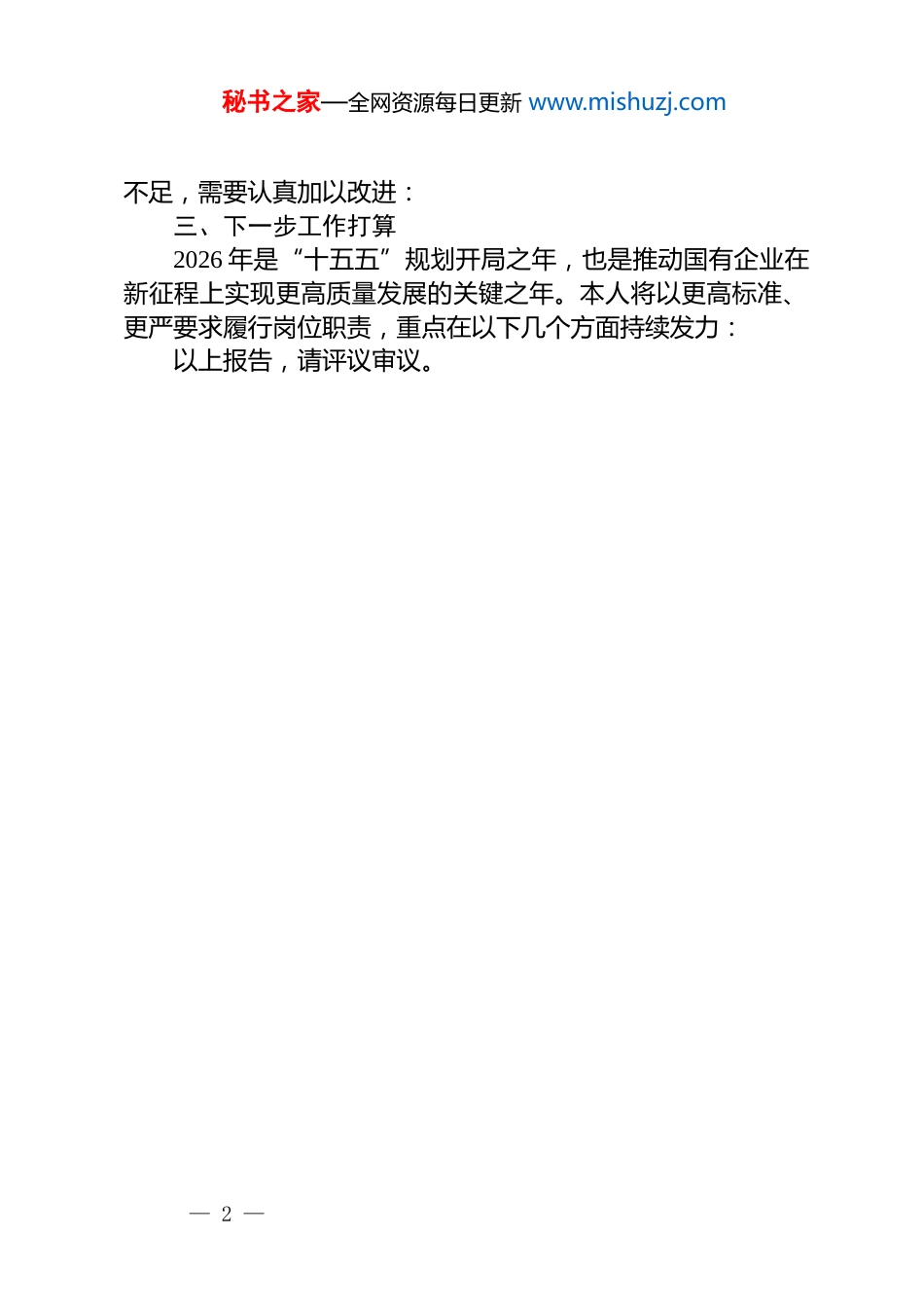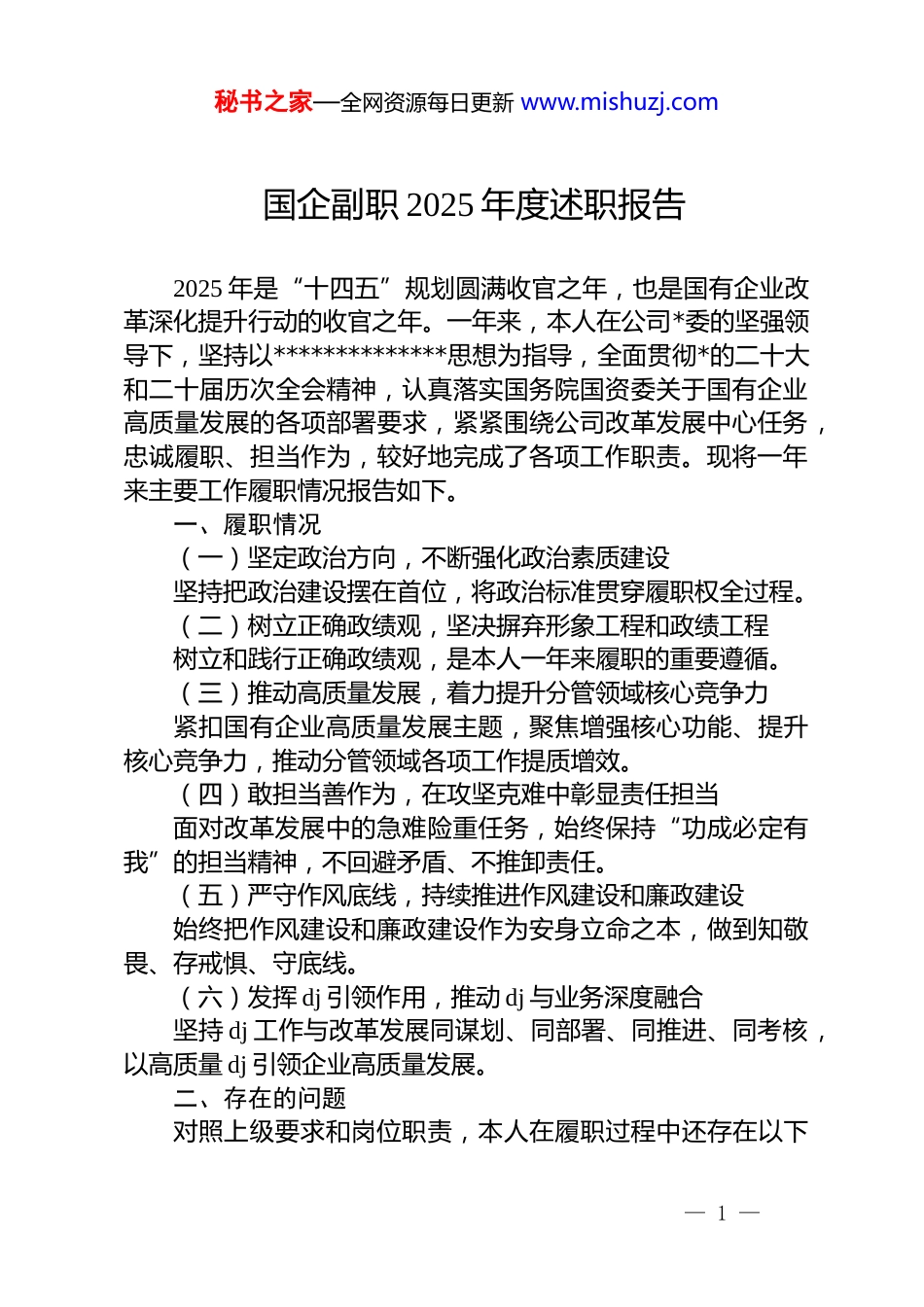 秘书之家—全网资源每日更新 www.mishuzj.com国企副职 2025 年度述职报告2025 年是“十四五”规划圆满收官之年,也是国有企业改革深化提升行动的收官之年。一年来,本人在公司*委的坚强领导下,坚持以**************思想为指导,全面贯彻*的二十大和二十届历次全会精神,认真落实国务院国资委关于国有企业高质量发展的各项部署要求,紧紧围绕公司改革发展中心任务,忠诚履职、担当作为,较好地完成了各项工作职责。现将一年来主要工作履职情况报告如下。一、履职情况(一)坚定政治方向,不断强化政治素质建设坚持把政治建设摆在首位,将政治标准贯穿履职权全过程。(二)树立正确政绩观,坚决摒弃形象工程和政绩工程树立和践行正确政绩观,是本人一年来履职的重要遵循。(三)推动高质量发展,着力提升分管领域核心竞争力紧扣国有企业高质量发展主题,聚焦增强核心功能、提升核心竞争力,推动分管领域各项工作提质增效。(四)敢担当善作为,在攻坚克难中彰显责任担当面对改革发展中的急难险重任务,始终保持“功成必定有我”的担当精神,不回避矛盾、不推卸责任。(五)严守作风底线,持续推进作风建设和廉政建设始终把作风建设和廉政建设作为安身立命之本,做到知敬畏、存戒惧、守底线。(六)发挥 dj 引领作用,推动 dj 与业务深度融合坚持 dj 工作与改革发展同谋划、同部署、同推进、同考核,以高质量 dj 引领企业高质量发展。二、存在的问题对照上级要求和岗位职责,本人在履职过程中还存在以下— 1 —秘书之家—全网资源每日更新 www.mishuzj.com不足,需要认真加以改进:三、下一步工作打算2026 年是“十五五”规划开局之年,也是推动国有企业在新征程上实现更高质量发展的关键之年。本人将以更高标准、更严要求履行岗位职责,重点在以下几个方面持续发力:以上报告,请评议审议。— 2 —