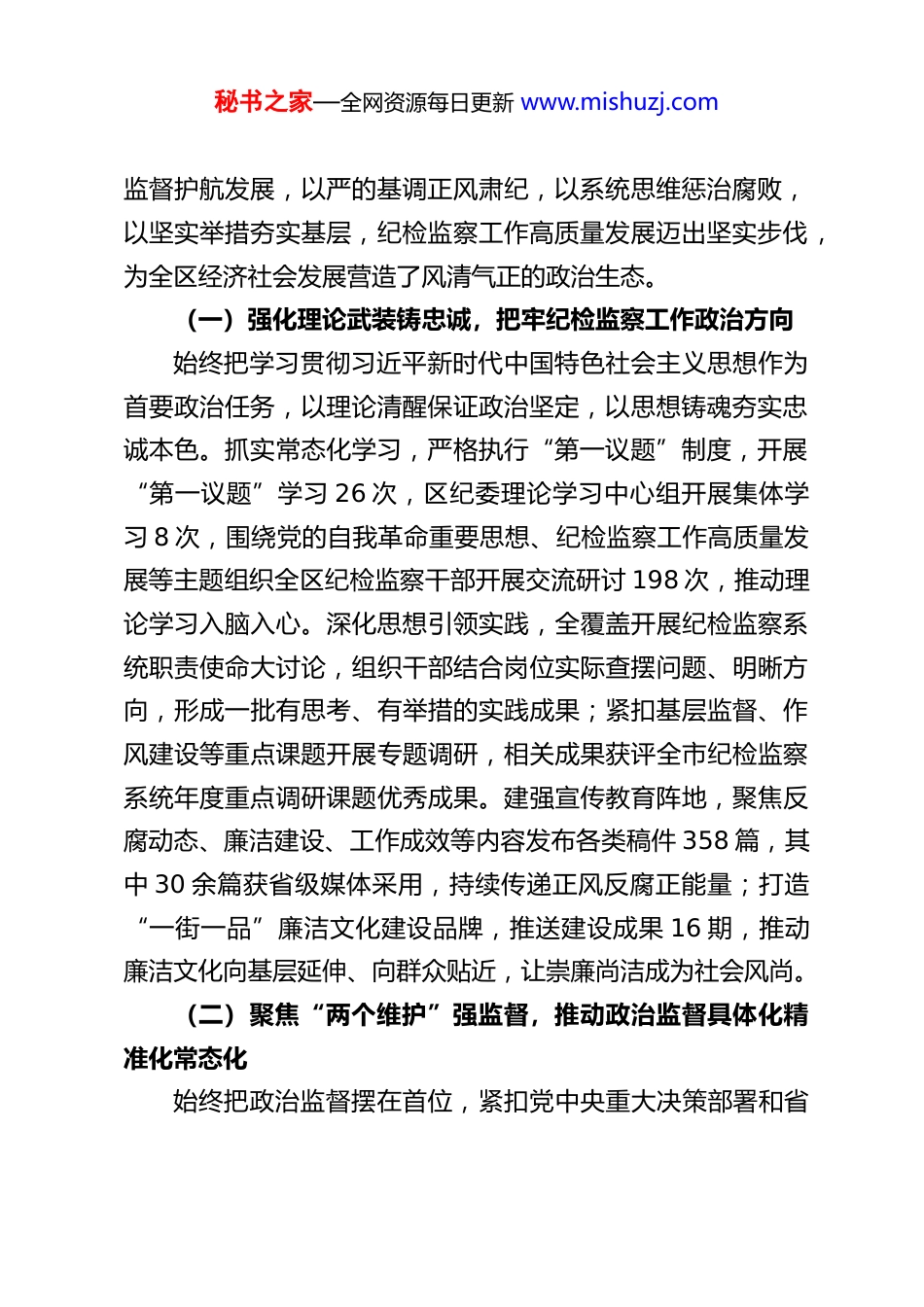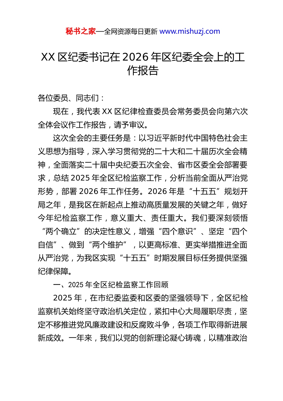秘书之家—全网资源每日更新 www.mishuzj.comXX 区纪委书记在 2026 年区纪委全会上的工作报告各位委员、同志们:现在,我代表 XX 区纪律检查委员会常务委员会向第六次全体会议作工作报告,请予审议。这次全会的主要任务是:以习近平新时代中国特色社会主义思想为指导,深入学习贯彻党的二十大和二十届历次全会精神,全面落实二十届中央纪委五次全会、省市区委全会部署要求,总结 2025 年全区纪检监察工作,分析当前全面从严治党形势,部署 2026 年工作任务。2026 年是“十五五”规划开局之年,是我区在新起点上推动高质量发展的关键之年,做好今年纪检监察工作,意义重大、责任重大。我们要深刻领悟“两个确立”的决定性意义,增强“四个意识”、坚定“四个自信”、做到“两个维护”,以更高标准、更实举措推进全面从严治党,为我区实现“十五五”时期发展目标任务提供坚强纪律保障。一、2025 年全区纪检监察工作回顾2025 年,在市纪委监委和区委的坚强领导下,全区纪检监察机关始终坚守政治机关定位,紧扣中心大局履职尽责,坚定不移推进党风廉政建设和反腐败斗争,各项工作取得新进展新成效。一年来,我们以党的创新理论凝心铸魂,以精准政治秘书之家—全网资源每日更新 www.mishuzj.com监督护航发展,以严的基调正风肃纪,以系统思维惩治腐败,以坚实举措夯实基层,纪检监察工作高质量发展迈出坚实步伐,为全区经济社会发展营造了风清气正的政治生态。(一)强化理论武装铸忠诚,把牢纪检监察工作政治方向始终把学习贯彻习近平新时代中国特色社会主义思想作为首要政治任务,以理论清醒保证政治坚定,以思想铸魂夯实忠诚本色。抓实常态化学习,严格执行“第一议题”制度,开展“第一议题”学习 26 次,区纪委理论学习中心组开展集体学习 8 次,围绕党的自我革命重要思想、纪检监察工作高质量发展等主题组织全区纪检监察干部开展交流研讨 198 次,推动理论学习入脑入心。深化思想引领实践,全覆盖开展纪检监察系统职责使命大讨论,组织干部结合岗位实际查摆问题、明晰方向,形成一批有思考、有举措的实践成果;紧扣基层监督、作风建设等重点课题开展专题调研,相关成果获评全市纪检监察系统年度重点调研课题优秀成果。建强宣传教育阵地,聚焦反腐动态、廉洁建设、工作成效等内容发布各类稿件 358 篇,其中 30 余篇获省级媒体采用,持续传递正风反腐正能量;打造“一街一品”廉洁文化建设品牌,推送建设成果 16 期,推动廉洁文化向基层延伸、向群众贴近,让崇廉尚洁成为社会风尚。(二)聚焦“两个维护”强监督,推动政治监督具体化精准化常态化始终把政治监督摆在首位,紧扣党中央重大决策部署和省秘书之家—全网资源每日更新 www.mishuzj.com市区委工作要求,找准监督切入点、着力点,以精准监督保障发展大局落地见效。护航经济发展提质增效,紧扣“全员全域拼经济”要求,创新开发“暖企执法监督小程序”,搭建政企沟通、监督执纪的便捷平台,推动发改、工信、市场监管等 15个部门联合开展暖企执法 267 次,精准解决企业政策落地、要素保障、权益维护等方面难题 221 个,持续优化营商环境。助力重点工作攻坚克难,围绕“百千万工程”实现“三年初见成效”目标,深化“1+9+N”监督框架,紧盯城中村改造、重大项目建设等重点工作,聚焦康鹭片区、新中轴 XX 片区改造等关键领域,对全区 87 个重点项目开展联合督导,及时发现并推动解决项目推进中的堵点难点问题,推动改造工作实现连片化、规模化突破。筑牢安全发展底线,建立维护社会稳定责任追究机制,紧盯安全生产、疫情防控等重点领域强化监督执纪,针对安全生产事故严肃问责 8 人,形成有力震慑;聚焦虫媒传染病疫情防控,开展专项监督检查,发现并推动整改问题 535个,切实筑牢疫情防控防线,守护群众生命健康安全。(三)深化作风建设树新风,推动中央八项规定精神落地生根始终坚持严的基调、严的措施、严的氛围,持续深化中央八项规定精神学习教育,靶向纠治“四风”顽疾,推动纪律作风建设走深走实。从严从实推进整改整治,督促各级党组织深入开展作风建设自查自纠,共查摆问题 3...