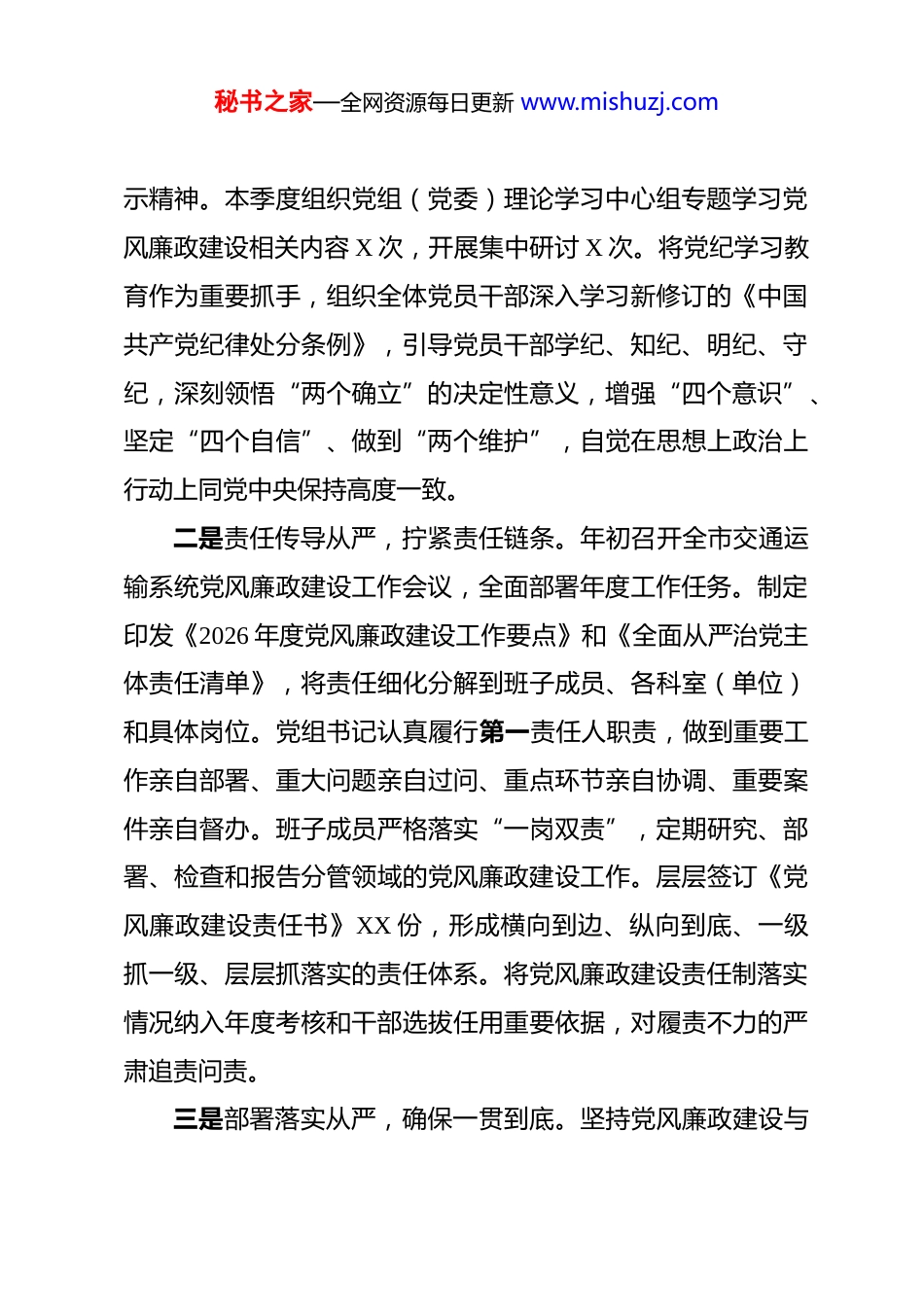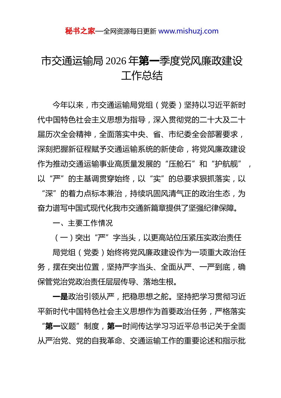 秘书之家—全网资源每日更新 www.mishuzj.com市交通运输局 2026 年第一季度党风廉政建设工作总结 今年以来,市交通运输局党组(党委)坚持以习近平新时代中国特色社会主义思想为指导,深入贯彻党的二十大及二十届历次全会精神,全面落实中央、省、市纪委全会部署要求,深刻把握新征程赋予交通运输系统的新使命,将党风廉政建设作为推动交通运输事业高质量发展的“压舱石”和“护航舰”,以“严”的主基调贯穿始终,以“实”的总要求狠抓落实,以“深”的着力点标本兼治,持续巩固风清气正的政治生态,为奋力谱写中国式现代化我市交通新篇章提供了坚强纪律保障。一、主要工作情况(一)突出“严”字当头,以更高站位压紧压实政治责任局党组(党委)始终将党风廉政建设作为一项重大政治任务,摆在突出位置,坚持严字当头、全面从严、一严到底,确保管党治党政治责任层层传导、落地生根。一是政治引领从严,把稳思想之舵。坚持把学习贯彻习近平新时代中国特色社会主义思想作为首要政治任务,严格落实“第一议题”制度,第一时间传达学习习近平总书记关于全面从严治党、党的自我革命、交通运输工作的重要论述和指示批秘书之家—全网资源每日更新 www.mishuzj.com示精神。本季度组织党组(党委)理论学习中心组专题学习党风廉政建设相关内容 X 次,开展集中研讨 X 次。将党纪学习教育作为重要抓手,组织全体党员干部深入学习新修订的《中国共产党纪律处分条例》,引导党员干部学纪、知纪、明纪、守纪,深刻领悟“两个确立”的决定性意义,增强“四个意识”、坚定“四个自信”、做到“两个维护”,自觉在思想上政治上行动上同党中央保持高度一致。二是责任传导从严,拧紧责任链条。年初召开全市交通运输系统党风廉政建设工作会议,全面部署年度工作任务。制定印发《2026 年度党风廉政建设工作要点》和《全面从严治党主体责任清单》,将责任细化分解到班子成员、各科室(单位)和具体岗位。党组书记认真履行第一责任人职责,做到重要工作亲自部署、重大问题亲自过问、重点环节亲自协调、重要案件亲自督办。班子成员严格落实“一岗双责”,定期研究、部署、检查和报告分管领域的党风廉政建设工作。层层签订《党风廉政建设责任书》XX 份,形成横向到边、纵向到底、一级抓一级、层层抓落实的责任体系。将党风廉政建设责任制落实情况纳入年度考核和干部选拔任用重要依据,对履责不力的严肃追责问责。三是部署落实从严,确保一贯到底。坚持党风廉政建设与秘书之家—全网资源每日更新 www.mishuzj.com交通运输中心工作同谋划、同部署、同推进、同考核。每季度至少召开 1 次专题会议研究党风廉政建设工作,分析研判形势,解决突出问题。局党组(党委)定期听取局属各单位、机关各科室党风廉政建设工作汇报,开展专项督查 X 次,确保上级决策部署和局党组(党委)工作要求不折不扣落到实处。针对交通工程建设、运输市场监管、行政审批、行政执法等重点领域,制定专项廉政风险防控方案,明确责任主体和防控措施。(二)贯穿“实”字为要,以更实举措筑牢拒腐防变堤坝坚持教育、制度、监督并重,做实做细日常管理监督,推动廉政教育入脑入心、制度建设管用有效、监督检查精准有力。一是廉政教育求实,筑牢思想根基。丰富教育载体,提升教育实效。一是做实正面引导,深入学习宣传交通系统涌现出的先进典型和模范人物事迹,弘扬“两路”精神和新时代交通精神,激发干事创业正能量。二是做实警示教育,组织观看《永远吹冲锋号》等警示教育片 X 部,通报交通运输领域违纪违法典型案例 X 起,用“身边事”教育“身边人”。组织党员干部赴市廉政教育基地、红色交通史馆等开展现场教学 X 次,增强教育的感染力和震慑力。三是做实纪法教育,举办“交通大讲堂”廉政专题辅导 X 期,邀请市纪委监委同志作专题报告,解读《条例》及相关法律法规。编印《交通运输系统廉洁风险秘书之家—全网资源每日更新 www.mishuzj.com防控手册》和《违纪违法案例汇编》,发放至每一名干部职工,引导大家知敬畏、存戒惧、守底线。二是制度执行务实,扎紧制度笼子。坚持用制度管权管事管人。一是健全完...
