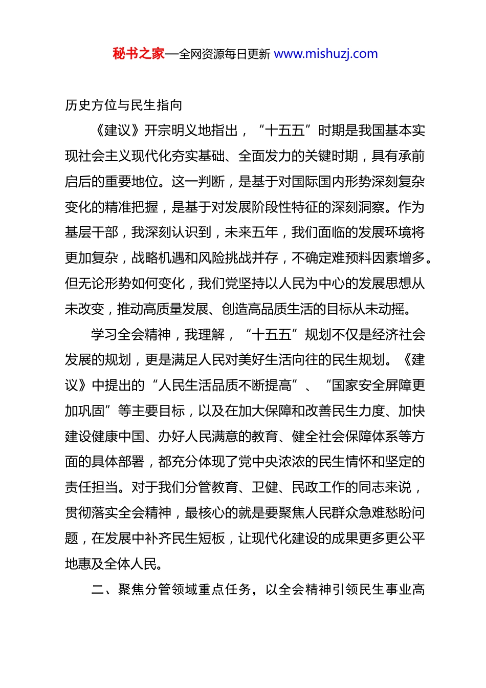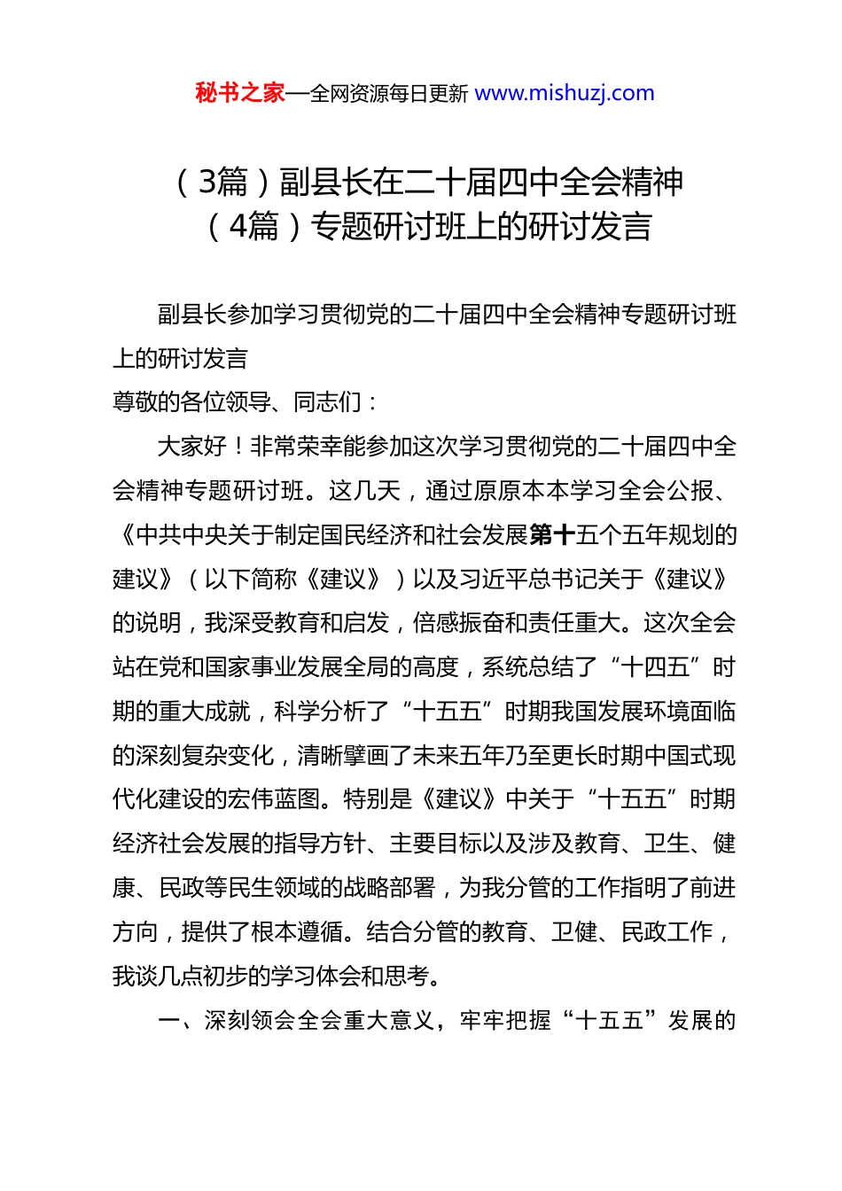 秘书之家—全网资源每日更新 www.mishuzj.com(3篇)副县长在二十届四中全会精神(4篇)专题研讨班上的研讨发言 副县长参加学习贯彻党的二十届四中全会精神专题研讨班上的研讨发言尊敬的各位领导、同志们:大家好!非常荣幸能参加这次学习贯彻党的二十届四中全会精神专题研讨班。这几天,通过原原本本学习全会公报、《中共中央关于制定国民经济和社会发展第十五个五年规划的建议》(以下简称《建议》)以及习近平总书记关于《建议》的说明,我深受教育和启发,倍感振奋和责任重大。这次全会站在党和国家事业发展全局的高度,系统总结了“十四五”时期的重大成就,科学分析了“十五五”时期我国发展环境面临的深刻复杂变化,清晰擘画了未来五年乃至更长时期中国式现代化建设的宏伟蓝图。特别是《建议》中关于“十五五”时期经济社会发展的指导方针、主要目标以及涉及教育、卫生、健康、民政等民生领域的战略部署,为我分管的工作指明了前进方向,提供了根本遵循。结合分管的教育、卫健、民政工作,我谈几点初步的学习体会和思考。一、深刻领会全会重大意义,牢牢把握“十五五”发展的秘书之家—全网资源每日更新 www.mishuzj.com历史方位与民生指向《建议》开宗明义地指出,“十五五”时期是我国基本实现社会主义现代化夯实基础、全面发力的关键时期,具有承前启后的重要地位。这一判断,是基于对国际国内形势深刻复杂变化的精准把握,是基于对发展阶段性特征的深刻洞察。作为基层干部,我深刻认识到,未来五年,我们面临的发展环境将更加复杂,战略机遇和风险挑战并存,不确定难预料因素增多。但无论形势如何变化,我们党坚持以人民为中心的发展思想从未改变,推动高质量发展、创造高品质生活的目标从未动摇。学习全会精神,我理解,“十五五”规划不仅是经济社会发展的规划,更是满足人民对美好生活向往的民生规划。《建议》中提出的“人民生活品质不断提高”、“国家安全屏障更加巩固”等主要目标,以及在加大保障和改善民生力度、加快建设健康中国、办好人民满意的教育、健全社会保障体系等方面的具体部署,都充分体现了党中央浓浓的民生情怀和坚定的责任担当。对于我们分管教育、卫健、民政工作的同志来说,贯彻落实全会精神,最核心的就是要聚焦人民群众急难愁盼问题,在发展中补齐民生短板,让现代化建设的成果更多更公平地惠及全体人民。二、聚焦分管领域重点任务,以全会精神引领民生事业高秘书之家—全网资源每日更新 www.mishuzj.com质量发展《建议》的第二板块,从产业发展到文化建设,再到民生保障、绿色发展等,分领域部署了战略任务。其中,直接关系我分管工作的内容非常丰富、要求非常明确,是我们下一步开展工作的行动指南。第一,在教育领域,要牢牢把握“办好人民满意的教育”这个根本目标,致力于构建高质量教育体系。《建议》提出要“全面贯彻党的教育方针”,“深化教育领域综合改革”,“促进教育公平”。结合我县实际,我认为需要在以下几个方面发力:一是聚焦立德树人根本任务。坚持不懈用习近平新时代中国特色社会主义思想铸魂育人,健全学校家庭社会协同育人机制,加强师德师风建设,培养德智体美劳全面发展的社会主义建设者和接班人。二是推动基础教育扩优提质。主动适应人口变化趋势,优化教育资源配置,特别是在学龄人口净流入的城镇,要下大力气增加学位供给,解决“入学难”问题。持续推进义务教育优质均衡发展,补齐乡村教育短板,让每个孩子都能享有公平而有质量的教育。三是增强职业教育适应性。围绕县域经济发展和产业升级需求,深化产教融合、校企合作,提升职业学校办学能力,培养更多高素质技术技能人才、能工巧匠,服务地方经济社会发展。四是建设高素质教师队伍。大秘书之家—全网资源每日更新 www.mishuzj.com力弘扬教育家精神,健全教师培养、培训、激励和保障机制,吸引优秀人才长期从教、终身从教。第二,在卫健领域,要深刻理解“加快建设健康中国”的战略部署,致力于全方位全周期保障人民健康。《建议》强调“把保障人民健康放在优先发展的战略位置”。这要求我们在工作中必须坚持预防为主的方针,深化改革创新。一是健全公共...