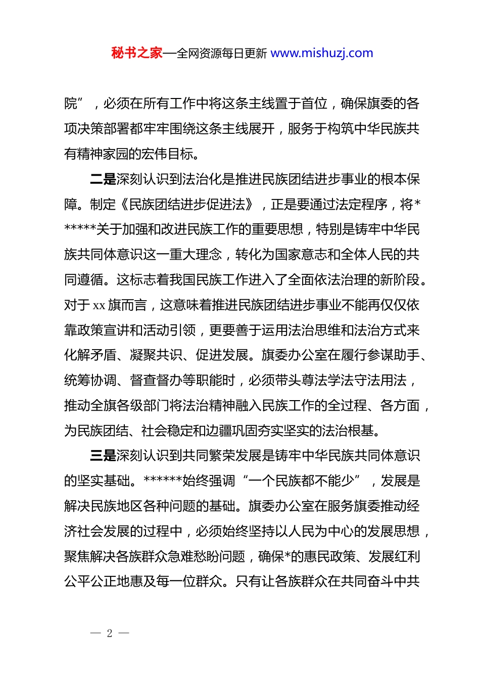 秘书之家—全网资源每日更新 www.mishuzj.com旗委办主任学习******关于加强和改进民族工作重要思想研讨发言材料近期,通过深入学习******关于加强和改进民族工作的重要思想,特别是结合十四届全国人大四次会议对《中华人民共和国民族团结进步促进法(草案)》的审议,我对新时代民族工作的重大意义有了更深刻的体悟和更坚定的方向。作为旗委办公室主任,深感责任重大、使命光荣,现结合自身思考,谈几点不成熟的体会。一、深化思想认识,把握核心要义一是深刻认识到“铸牢中华民族共同体意识”是贯穿所有工作的主线。******关于加强和改进民族工作的重要思想,是马克思主义民族理论中国化时代化的最新成果。其核心要义与根本指针,就是铸牢中华民族共同体意识。从 2014 年鲜明提出“中华民族共同体意识”,到 2021 年中央民族工作会议上系统阐述“十二个必须”,再到 2023 年在内蒙古考察时强调“铸牢中华民族共同体意识是新时代*的民族工作的主线,也是民族地区各项工作的主线”,这一思想的脉络清晰、内涵不断丰富。这不仅是民族工作的指导方针,更是衡量和检验 xx 旗一切工作的根本标准。旗委办公室作为旗委的“坚强前哨”和“巩固后— 1 —秘书之家—全网资源每日更新 www.mishuzj.com院”,必须在所有工作中将这条主线置于首位,确保旗委的各项决策部署都牢牢围绕这条主线展开,服务于构筑中华民族共有精神家园的宏伟目标。二是深刻认识到法治化是推进民族团结进步事业的根本保障。制定《民族团结进步促进法》,正是要通过法定程序,将******关于加强和改进民族工作的重要思想,特别是铸牢中华民族共同体意识这一重大理念,转化为国家意志和全体人民的共同遵循。这标志着我国民族工作进入了全面依法治理的新阶段。对于 xx 旗而言,这意味着推进民族团结进步事业不能再仅仅依靠政策宣讲和活动引领,更要善于运用法治思维和法治方式来化解矛盾、凝聚共识、促进发展。旗委办公室在履行参谋助手、统筹协调、督查督办等职能时,必须带头尊法学法守法用法,推动全旗各级部门将法治精神融入民族工作的全过程、各方面,为民族团结、社会稳定和边疆巩固夯实坚实的法治根基。三是深刻认识到共同繁荣发展是铸牢中华民族共同体意识的坚实基础。******始终强调“一个民族都不能少”,发展是解决民族地区各种问题的基础。旗委办公室在服务旗委推动经济社会发展的过程中,必须始终坚持以人民为中心的发展思想,聚焦解决各族群众急难愁盼问题,确保*的惠民政策、发展红利公平公正地惠及每一位群众。只有让各族群众在共同奋斗中共— 2 —秘书之家—全网资源每日更新 www.mishuzj.com享改革发展成果,切身感受到祖国大家庭的温暖,中华民族共同体意识才能在群众心中深深扎根、枝繁叶茂。二、对照检视反思,查摆存在差距在深刻领会******重要思想的同时,我怀着真诚诚恳的态度,对照旗委办公室的工作职责进行深刻反思,清醒地认识到工作中仍然存在一些不容忽视的差距和短板。一是在学思践悟的深度上存在差距。尽管旗委办公室组织了多次理论学习,但对照“学懂、弄通、做实”的要求,还存在一定的距离。有时学习停留在读文件、听报告的层面,对“十二个必须”等核心要义的系统性研究和理解不够深入透彻,未能完全将其内化为自身的政治判断力、政治领悟力和政治执行力。在如何将这一思想创造性地转化为服务旗委决策、指导具体工作的思路和举措上,谋划得还不够深、不够实,导致在参谋辅政时,有时不能站在铸牢中华民族共同体意识的战略高度提出更具前瞻性和操作性的建议。二是在统筹协调的效能上存在差距。旗委办公室承担着承上启下、协调各方的重要职责。在推动落实民族工作的过程中,虽然建立了一定的协调机制,但部门间的联动合力尚未完全形成。有时满足于发了文件、开了会议,但在后续的跟踪问效、督查督办上力度不足,未能形成一个反应迅速、执行有力、信— 3 —秘书之家—全网资源每日更新 www.mishuzj.com息共享、责任明晰的闭环工作链条。对于一些跨领域、跨部门的复杂问题,协同发力的机制不够完善,导致一些好的政策和部署在“最后一公里”的落实效果打了折扣。三是...