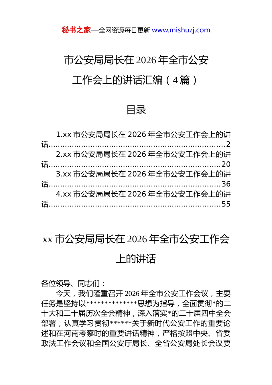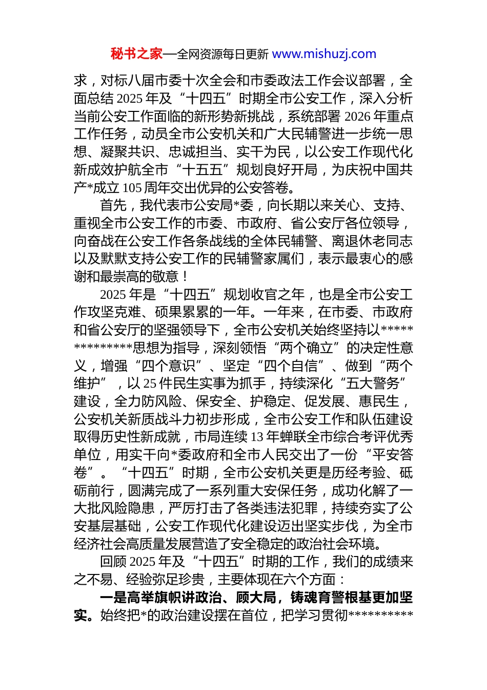 秘书之家—全网资源每日更新 www.mishuzj.com市公安局局长在 2026 年全市公安工作会上的讲话汇编(4 篇)目录1.xx 市公安局局长在 2026 年全市公安工作会上的讲话............................................................................22.xx 市公安局局长在 2026 年全市公安工作会上的讲话..........................................................................203.xx 市公安局局长在 2026 年全市公安工作会上的讲话..........................................................................364.xx 市公安局局长在 2026 年全市公安工作会上的讲话..........................................................................55xx 市公安局局长在 2026 年全市公安工作会上的讲话各位领导、同志们:今天,我们隆重召开 2026 年全市公安工作会议,主要任务是坚持以**************思想为指导,全面贯彻*的二十大和二十届历次全会精神,深入落实*的二十届四中全会部署,认真学习贯彻******关于新时代公安工作的重要论述和在河南考察时的重要讲话精神,严格按照中央、省委政法工作会议和全国公安厅局长、全省公安局处长会议要秘书之家—全网资源每日更新 www.mishuzj.com求,对标八届市委十次全会和市委政法工作会议部署,全面总结 2025 年及“十四五”时期全市公安工作,深入分析当前公安工作面临的新形势新挑战,系统部署 2026 年重点工作任务,动员全市公安机关和广大民辅警进一步统一思想、凝聚共识、忠诚担当、实干为民,以公安工作现代化新成效护航全市“十五五”规划良好开局,为庆祝中国共产*成立 105 周年交出优异的公安答卷。首先,我代表市公安局*委,向长期以来关心、支持、重视全市公安工作的市委、市政府、省公安厅各位领导,向奋战在公安工作各条战线的全体民辅警、离退休老同志以及默默支持公安工作的民辅警家属们,表示最衷心的感谢和最崇高的敬意!2025 年是“十四五”规划收官之年,也是全市公安工作攻坚克难、硕果累累的一年。一年来,在市委、市政府和省公安厅的坚强领导下,全市公安机关始终坚持以**************思想为指导,深刻领悟“两个确立”的决定性意义,增强“四个意识”、坚定“四个自信”、做到“两个维护”,以 25 件民生实事为抓手,持续深化“五大警务”建设,全力防风险、保安全、护稳定、促发展、惠民生,公安机关新质战斗力初步形成,全市公安工作和队伍建设取得历史性新成就,市局连续 13 年蝉联全市综合考评优秀单位,用实干向*委政府和全市人民交出了一份“平安答卷”。“十四五”时期,全市公安机关更是历经考验、砥砺前行,圆满完成了一系列重大安保任务,成功化解了一大批风险隐患,严厉打击了各类违法犯罪,持续夯实了公安基层基础,公安工作现代化建设迈出坚实步伐,为全市经济社会高质量发展营造了安全稳定的政治社会环境。回顾 2025 年及“十四五”时期的工作,我们的成绩来之不易、经验弥足珍贵,主要体现在六个方面:一是高举旗帜讲政治、顾大局,铸魂育警根基更加坚实。始终把*的政治建设摆在首位,把学习贯彻**********秘书之家—全网资源每日更新 www.mishuzj.com****思想作为首要政治任务,分层分类开展政治轮训,实现全警政治学习全覆盖、政治教育常态化。严格落实*对公安工作的绝对领导,把*中央决策部署和省、市委工作要求不折不扣落实到公安工作各方面、全过程,始终做到政令畅通、令行禁止。持续深化*史学习教育和队伍教育整顿成果,全警的政治判断力、政治领悟力、政治执行力显著提升,绝对忠诚、绝对纯洁、绝对可靠的政治底色更加鲜明。二是坚守底线防风险、除隐患,全域稳定态势更加牢固。坚定不移贯彻总体国家安全观,把维护国家政治安全放在首位,严密防范、严厉打击境内外敌对势力渗透、颠覆、捣乱、破坏活动,坚决捍卫国家政权安全、制度安全意识形态安全。健全完善风险隐患排查化解机制,围绕重大会议、重要节点开展常态化安保维稳工作,实现了“零差错、零事故、零上访”的工作目标。深化反恐防恐体系建设,扎实开展反恐排查整治,全市反恐维稳形势持续...