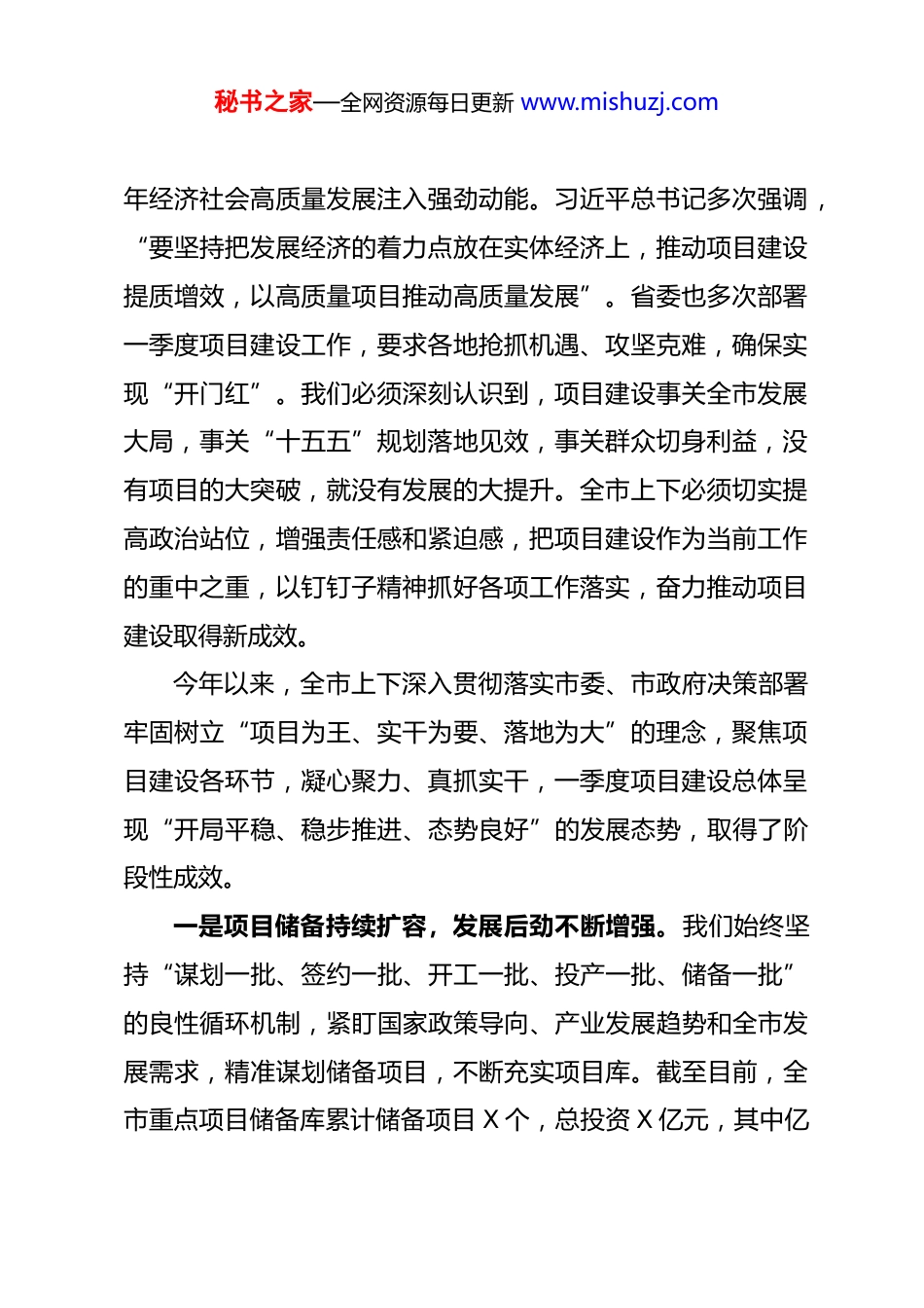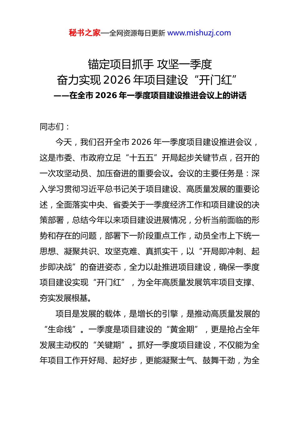 秘书之家—全网资源每日更新 www.mishuzj.com锚定项目抓手 攻坚一季度奋力实现 2026 年项目建设“开门红”——在全市 2026 年一季度项目建设推进会议上的讲话同志们:今天,我们召开全市 2026 年一季度项目建设推进会议,这是市委、市政府立足“十五五”开局起步关键节点,召开的一次攻坚动员、加压奋进的重要会议。会议的主要任务是:深入学习贯彻习近平总书记关于项目建设、高质量发展的重要论述,全面落实中央、省委关于一季度经济工作和项目建设的决策部署,总结今年以来项目建设进展情况,分析当前面临的形势和存在的问题,部署下一阶段重点工作,动员全市上下统一思想、凝聚共识、攻坚克难、真抓实干,以“开局即冲刺、起步即决战”的奋进姿态,全力以赴推进项目建设,确保一季度项目建设实现“开门红”,为全年高质量发展筑牢项目支撑、夯实发展根基。项目是发展的载体,是增长的引擎,是推动高质量发展的“生命线”。一季度是项目建设的“黄金期”,更是抢占全年发展主动权的“关键期”。抓好一季度项目建设,不仅能为全年项目工作开好局、起好步,更能凝聚士气、鼓舞干劲,为全秘书之家—全网资源每日更新 www.mishuzj.com年经济社会高质量发展注入强劲动能。习近平总书记多次强调,“要坚持把发展经济的着力点放在实体经济上,推动项目建设提质增效,以高质量项目推动高质量发展”。省委也多次部署一季度项目建设工作,要求各地抢抓机遇、攻坚克难,确保实现“开门红”。我们必须深刻认识到,项目建设事关全市发展大局,事关“十五五”规划落地见效,事关群众切身利益,没有项目的大突破,就没有发展的大提升。全市上下必须切实提高政治站位,增强责任感和紧迫感,把项目建设作为当前工作的重中之重,以钉钉子精神抓好各项工作落实,奋力推动项目建设取得新成效。今年以来,全市上下深入贯彻落实市委、市政府决策部署牢固树立“项目为王、实干为要、落地为大”的理念,聚焦项目建设各环节,凝心聚力、真抓实干,一季度项目建设总体呈现“开局平稳、稳步推进、态势良好”的发展态势,取得了阶段性成效。一是项目储备持续扩容,发展后劲不断增强。我们始终坚持“谋划一批、签约一批、开工一批、投产一批、储备一批”的良性循环机制,紧盯国家政策导向、产业发展趋势和全市发展需求,精准谋划储备项目,不断充实项目库。截至目前,全市重点项目储备库累计储备项目 X 个,总投资 X 亿元,其中亿秘书之家—全网资源每日更新 www.mishuzj.com元以上项目 X 个、10 亿元以上项目 X 个、50 亿元以上项目 X个,涵盖产业升级、基础设施、民生改善、生态环保等多个领域。这些储备项目的落地实施,将为我市经济社会高质量发展提供强有力的支撑。同时,我们加强项目前期论证,优化项目储备结构,重点聚焦主导产业、新兴产业和重大基础设施领域,着力谋划储备一批投资规模大、科技含量高、税收贡献强、带动能力广的优质项目,确保项目储备质量持续提升。二是项目开工势头良好,建设进度稳步推进。我们坚持把项目开工作为一季度项目建设的首要任务,强化统筹协调、优化服务保障,全力推动一批重点项目集中开工、快速推进。一季度,全市共集中开工项目 X 个,总投资 X 亿元,其中产业项目 X 个、基础设施项目 X 个、民生项目 X 个。截至 3 月底,X个市级以上重点项目全部开工建设,完成投资 X 亿元,占年度计划投资的 X%,其中 X 个项目提前完成阶段性建设任务,X个项目达到序时进度,X 个项目实现部分投产见效。从行业领域看,产业项目推进势头强劲,完成投资 X 亿元,占重点项目完成投资的 X%;基础设施项目加快推进,城市道路、供水供电、生态环保等项目有序实施,完成投资 X 亿元;民生项目扎实推进,教育、医疗、养老等项目稳步建设,切实增进群众福祉。秘书之家—全网资源每日更新 www.mishuzj.com三是招商引资质效提升,项目支撑持续强化。我们始终把招商引资作为项目建设的“源头活水”,坚持大招商、招大商、招好商,创新招商方式、聚焦招商重点,一季度招商引资工作取得显著成效。全市累计签约项目 X 个,总投资 X 亿元,其中...