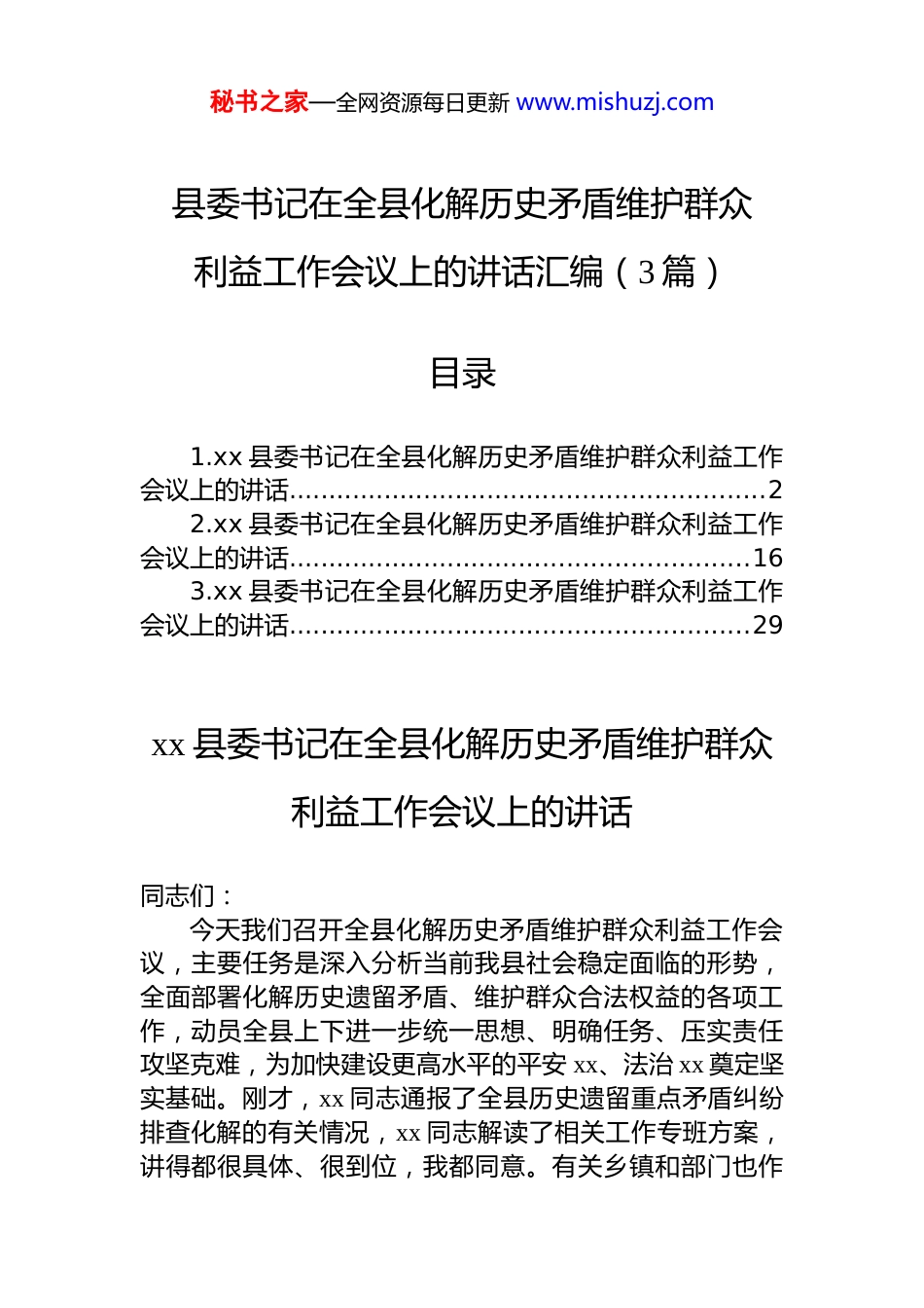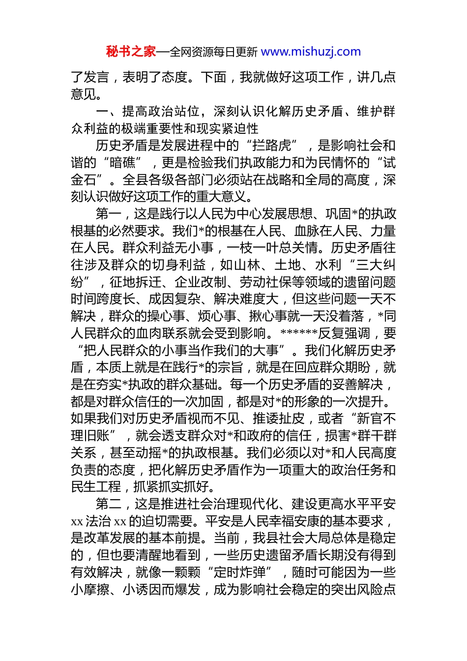 秘书之家—全网资源每日更新 www.mishuzj.com县委书记在全县化解历史矛盾维护群众利益工作会议上的讲话汇编(3 篇)目录1.xx 县委书记在全县化解历史矛盾维护群众利益工作会议上的讲话............................................................22.xx 县委书记在全县化解历史矛盾维护群众利益工作会议上的讲话..........................................................163.xx 县委书记在全县化解历史矛盾维护群众利益工作会议上的讲话..........................................................29xx 县委书记在全县化解历史矛盾维护群众利益工作会议上的讲话同志们:今天我们召开全县化解历史矛盾维护群众利益工作会议,主要任务是深入分析当前我县社会稳定面临的形势,全面部署化解历史遗留矛盾、维护群众合法权益的各项工作,动员全县上下进一步统一思想、明确任务、压实责任攻坚克难,为加快建设更高水平的平安 xx、法治 xx 奠定坚实基础。刚才,xx 同志通报了全县历史遗留重点矛盾纠纷排查化解的有关情况,xx 同志解读了相关工作专班方案,讲得都很具体、很到位,我都同意。有关乡镇和部门也作秘书之家—全网资源每日更新 www.mishuzj.com了发言,表明了态度。下面,我就做好这项工作,讲几点意见。一、提高政治站位,深刻认识化解历史矛盾、维护群众利益的极端重要性和现实紧迫性历史矛盾是发展进程中的“拦路虎”,是影响社会和谐的“暗礁”,更是检验我们执政能力和为民情怀的“试金石”。全县各级各部门必须站在战略和全局的高度,深刻认识做好这项工作的重大意义。第一,这是践行以人民为中心发展思想、巩固*的执政根基的必然要求。我们*的根基在人民、血脉在人民、力量在人民。群众利益无小事,一枝一叶总关情。历史矛盾往往涉及群众的切身利益,如山林、土地、水利“三大纠纷”,征地拆迁、企业改制、劳动社保等领域的遗留问题时间跨度长、成因复杂、解决难度大,但这些问题一天不解决,群众的操心事、烦心事、揪心事就一天没着落,*同人民群众的血肉联系就会受到影响。******反复强调,要“把人民群众的小事当作我们的大事”。我们化解历史矛盾,本质上就是在践行*的宗旨,就是在回应群众期盼,就是在夯实*执政的群众基础。每一个历史矛盾的妥善解决,都是对群众信任的一次加固,都是对*的形象的一次提升。如果我们对历史矛盾视而不见、推诿扯皮,或者“新官不理旧账”,就会透支群众对*和政府的信任,损害*群干群关系,甚至动摇*的执政根基。我们必须以对*和人民高度负责的态度,把化解历史矛盾作为一项重大的政治任务和民生工程,抓紧抓实抓好。第二,这是推进社会治理现代化、建设更高水平平安xx 法治 xx 的迫切需要。平安是人民幸福安康的基本要求,是改革发展的基本前提。当前,我县社会大局总体是稳定的,但也要清醒地看到,一些历史遗留矛盾长期没有得到有效解决,就像一颗颗“定时炸弹”,随时可能因为一些小摩擦、小诱因而爆发,成为影响社会稳定的突出风险点秘书之家—全网资源每日更新 www.mishuzj.com这些问题如果处理不好,不仅会消耗大量的行政资源和司法资源,还可能引发群体性事件、极端恶性案件,严重干扰正常的生产生活秩序,阻碍经济社会发展。建设更高水平的平安 xx、法治 xx,就必须下大力气清除这些“拦路虎”、“绊脚石”。只有把这些历史矛盾化解掉,把风险隐患消除掉,我们才能轻装上阵,集中精力谋发展、促改革、惠民生。法治是治国理政的基本方式,也是化解社会矛盾的根本途径。在处理历史矛盾过程中,我们必须始终坚持法治思维和法治方式,引导群众依法理性表达诉求,推动各类矛盾纠纷在法治轨道上得到解决,从而不断提升社会治理的法治化水平,让平安 xx、法治 xx 的根基更加牢固。第三,这是锤炼干部队伍作风、树立和践行正确政绩观的重要考场。历史矛盾往往是难啃的“硬骨头”,是检验干部能力、担当和作风的“试金石”。面对历史积弊,是迎难而上、主动作为,还是绕道走、往外推,是对我们*员干部*性原则、宗旨意识和担当精神的直接考验。这次我们结合树立和践行正确政绩观学习教育,就是要引导广大*员...