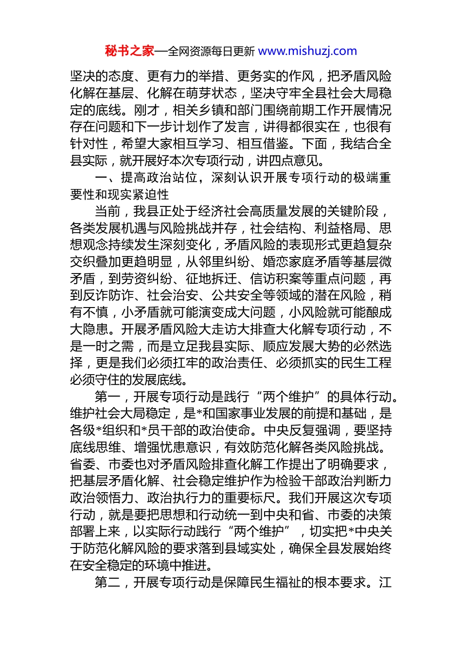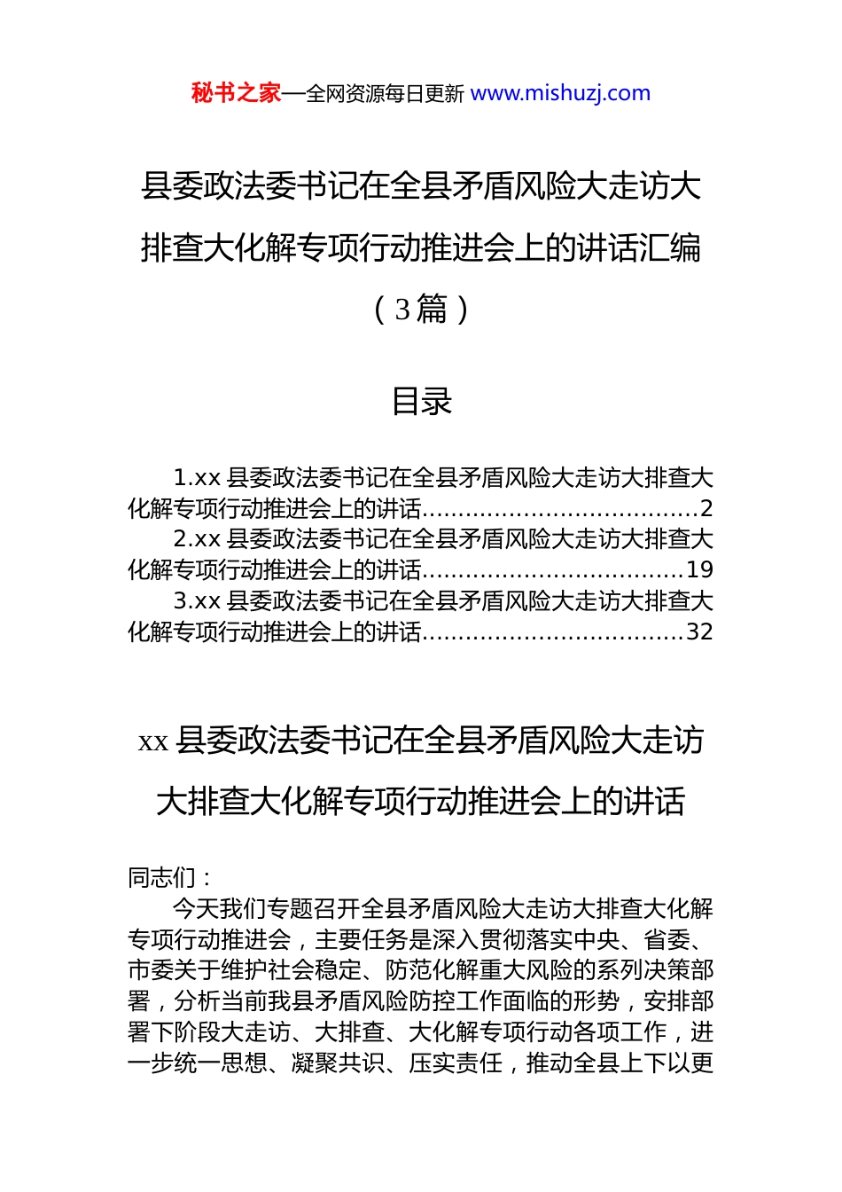 秘书之家—全网资源每日更新 www.mishuzj.com县委政法委书记在全县矛盾风险大走访大排查大化解专项行动推进会上的讲话汇编(3 篇)目录1.xx 县委政法委书记在全县矛盾风险大走访大排查大化解专项行动推进会上的讲话......................................22.xx 县委政法委书记在全县矛盾风险大走访大排查大化解专项行动推进会上的讲话....................................193.xx 县委政法委书记在全县矛盾风险大走访大排查大化解专项行动推进会上的讲话....................................32xx 县委政法委书记在全县矛盾风险大走访大排查大化解专项行动推进会上的讲话同志们:今天我们专题召开全县矛盾风险大走访大排查大化解专项行动推进会,主要任务是深入贯彻落实中央、省委、市委关于维护社会稳定、防范化解重大风险的系列决策部署,分析当前我县矛盾风险防控工作面临的形势,安排部署下阶段大走访、大排查、大化解专项行动各项工作,进一步统一思想、凝聚共识、压实责任,推动全县上下以更秘书之家—全网资源每日更新 www.mishuzj.com坚决的态度、更有力的举措、更务实的作风,把矛盾风险化解在基层、化解在萌芽状态,坚决守牢全县社会大局稳定的底线。刚才,相关乡镇和部门围绕前期工作开展情况存在问题和下一步计划作了发言,讲得都很实在,也很有针对性,希望大家相互学习、相互借鉴。下面,我结合全县实际,就开展好本次专项行动,讲四点意见。一、提高政治站位,深刻认识开展专项行动的极端重要性和现实紧迫性当前,我县正处于经济社会高质量发展的关键阶段,各类发展机遇与风险挑战并存,社会结构、利益格局、思想观念持续发生深刻变化,矛盾风险的表现形式更趋复杂交织叠加更趋明显,从邻里纠纷、婚恋家庭矛盾等基层微矛盾,到劳资纠纷、征地拆迁、信访积案等重点问题,再到反诈防诈、社会治安、公共安全等领域的潜在风险,稍有不慎,小矛盾就可能演变成大问题,小风险就可能酿成大隐患。开展矛盾风险大走访大排查大化解专项行动,不是一时之需,而是立足我县实际、顺应发展大势的必然选择,更是我们必须扛牢的政治责任、必须抓实的民生工程必须守住的发展底线。第一,开展专项行动是践行“两个维护”的具体行动。维护社会大局稳定,是*和国家事业发展的前提和基础,是各级*组织和*员干部的政治使命。中央反复强调,要坚持底线思维、增强忧患意识,有效防范化解各类风险挑战。省委、市委也对矛盾风险排查化解工作提出了明确要求,把基层矛盾化解、社会稳定维护作为检验干部政治判断力政治领悟力、政治执行力的重要标尺。我们开展这次专项行动,就是要把思想和行动统一到中央和省、市委的决策部署上来,以实际行动践行“两个维护”,切实把*中央关于防范化解风险的要求落到县域实处,确保全县发展始终在安全稳定的环境中推进。第二,开展专项行动是保障民生福祉的根本要求。江秘书之家—全网资源每日更新 www.mishuzj.com山就是人民,人民就是江山。基层的矛盾风险,说到底大多是群众的“急难愁盼”问题,看似是“小事”,但对群众来说都是“天大的事”。邻里之间的一点纠纷、劳资之间的一点分歧、家庭之间的一点矛盾,如果得不到及时有效化解,不仅会影响群众的日常生活,还会伤害群众的感情,损害*和政府在群众心中的形象。开展大走访大排查大化解,就是要主动走到群众身边,听民声、察民情、解民忧,把工作做到群众心坎上,用心用情用力解决好群众最关心、最直接、最现实的利益问题,让群众的获得感、幸福感、安全感更加充实、更有保障、更可持续。第三,开展专项行动是推动县域高质量发展的坚强保障。发展是第一要务,稳定是第一责任。没有稳定的社会环境,一切发展都无从谈起。当前,我县正全力推进项目建设、产业发展、乡村振兴等重点工作,迫切需要一个和谐稳定的社会环境。如果矛盾风险层出不穷,各级干部就会疲于应付、分散精力,各项工作推进就会受到阻碍。开展本次专项行动,就是要主动排查化解影响发展的各类矛盾风险,扫清发展道路上的障碍,让全县上下能够集中精力抓发展、心无旁骛干事业,为县域经济社会高质量发展营造安定有序的良好环境。...