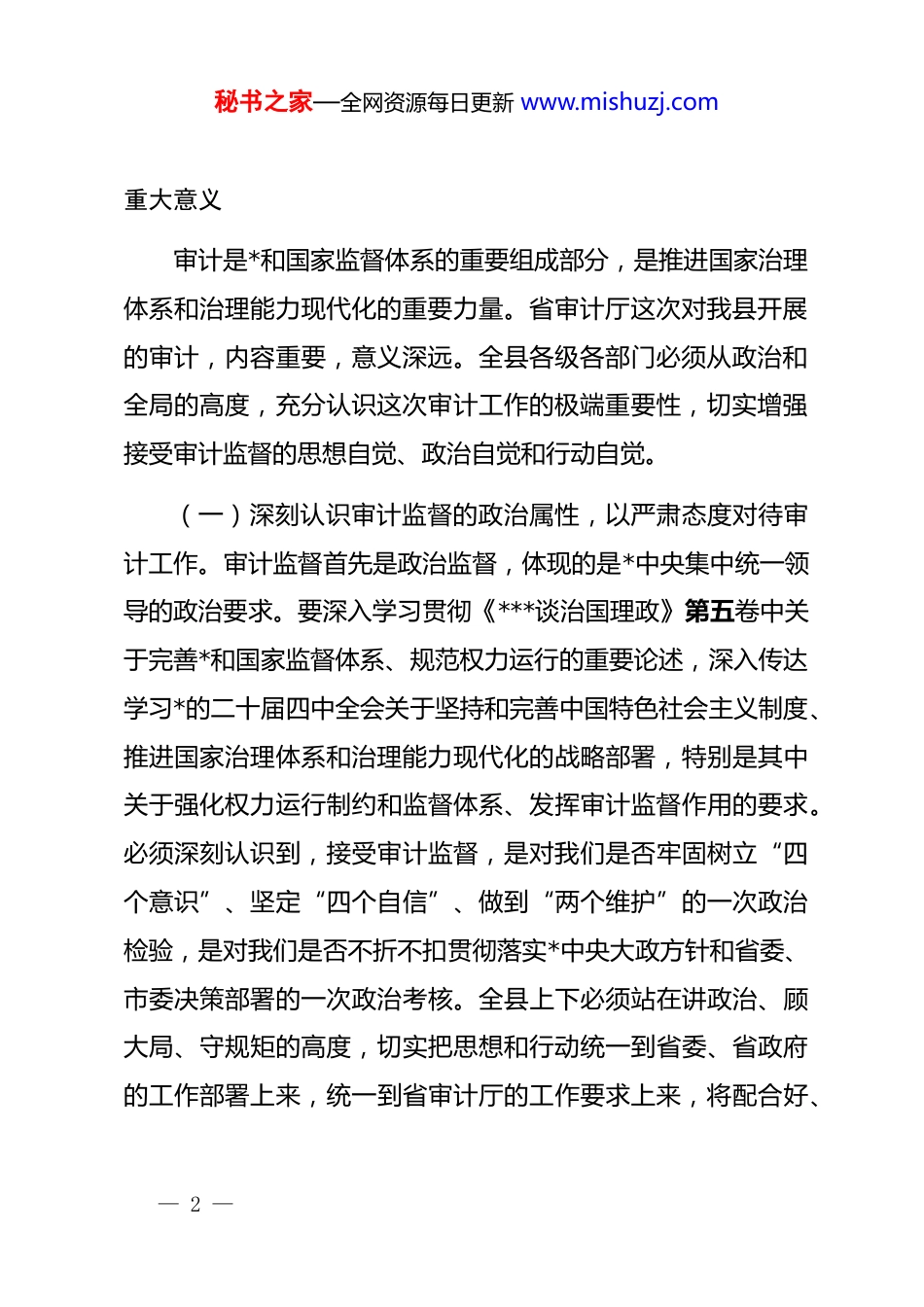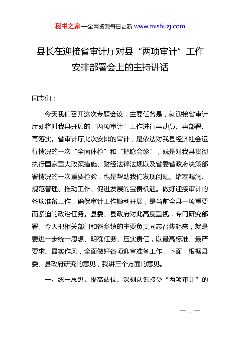 秘书之家—全网资源每日更新 www.mishuzj.com县长在迎接省审计厅对县“两项审计”工作安排部署会上的主持讲话同志们:今天我们召开这次专题会议,主要任务是,就迎接省审计厅即将对我县开展的“两项审计”工作进行再动员、再部署、再落实。省审计厅此次安排的审计,是依法对我县经济社会运行情况的一次“全面体检”和“把脉会诊”,既是对我县贯彻执行国家重大政策措施、财经法律法规以及省委省政府决策部署情况的一次重要检验,也是帮助我们发现问题、堵塞漏洞、规范管理、推动工作、促进发展的宝贵机遇。做好迎接审计的各项准备工作,确保审计工作顺利开展,是当前全县一项重要而紧迫的政治任务。县委、县政府对此高度重视,专门研究部署。今天把相关部门和各乡镇的主要负责同志召集起来,就是要进一步统一思想、明确任务、压实责任,以最高标准、最严要求、最实作风,全面做好各项迎审准备工作。下面,根据县委、县政府研究的意见,我讲三个方面的意见。一、统一思想、提高站位,深刻认识接受“两项审计”的— 1 —秘书之家—全网资源每日更新 www.mishuzj.com重大意义审计是*和国家监督体系的重要组成部分,是推进国家治理体系和治理能力现代化的重要力量。省审计厅这次对我县开展的审计,内容重要,意义深远。全县各级各部门必须从政治和全局的高度,充分认识这次审计工作的极端重要性,切实增强接受审计监督的思想自觉、政治自觉和行动自觉。(一)深刻认识审计监督的政治属性,以严肃态度对待审计工作。审计监督首先是政治监督,体现的是*中央集中统一领导的政治要求。要深入学习贯彻《***谈治国理政》第五卷中关于完善*和国家监督体系、规范权力运行的重要论述,深入传达学习*的二十届四中全会关于坚持和完善中国特色社会主义制度、推进国家治理体系和治理能力现代化的战略部署,特别是其中关于强化权力运行制约和监督体系、发挥审计监督作用的要求。必须深刻认识到,接受审计监督,是对我们是否牢固树立“四个意识”、坚定“四个自信”、做到“两个维护”的一次政治检验,是对我们是否不折不扣贯彻落实*中央大政方针和省委、市委决策部署的一次政治考核。全县上下必须站在讲政治、顾大局、守规矩的高度,切实把思想和行动统一到省委、省政府的工作部署上来,统一到省审计厅的工作要求上来,将配合好、— 2 —秘书之家—全网资源每日更新 www.mishuzj.com支持好、保障好这次审计工作,作为一项必须完成好的重大政治任务,坚决服从审计安排,自觉接受审计监督。(二)深刻认识审计监督的保障作用,以积极心态配合审计工作。今年是“十五五”规划的开局之年,我县改革发展稳定各项任务艰巨繁重。在当前这样一个关键时期,省审计厅来我县开展审计,既是对我们过去工作的监督检查,更是对我们未来发展的有力支持和促进。审计的根本目的是“治已病、防未病”,通过发现和揭示问题,推动解决问题、完善制度、规范管理。要将这次审计视为一次“经济体检”和“综合会诊”,视为帮助我们查找不足、改进工作、提升效能的难得契机。要以“闻过则喜、知过不讳、改过不惮”的胸怀和态度,诚恳接受审计检查,主动暴露问题,深入剖析根源,认真加以整改。要通过审计,进一步规范财政财务收支行为,提高公共资金、国有资产、国有资源使用效益,防范化解重大经济风险,推动重大政策措施在我县落地生根,从而更好地保障和促进我县“十五五”时期经济社会持续健康发展。(三)深刻认识审计监督的纪律要求,以严明纪律保障审计工作。审计监督具有独立性、权威性和法律强制性。配合审计是法律规定的义务,任何单位、任何人都不得以任何理由推— 3 —秘书之家—全网资源每日更新 www.mishuzj.com诿、拒绝、阻碍审计,更不得隐瞒、谎报、提供虚假情况。全县各级领导干部,特别是主要负责同志,要带头学习审计法规,带头遵守审计纪律,带头支持审计工作。要教育引导广大干部职工正确认识和对待审计监督,消除思想顾虑和抵触情绪,积极主动、实事求是地向审计组提供资料、反映情况。要严格遵守审计“四严禁”工作要求和“八不准”工作纪律,严禁任何单位和个人以任何形式干扰、影响审计工...