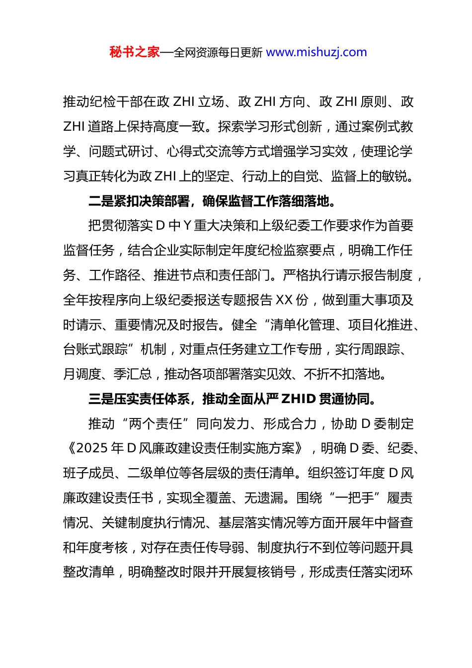 秘书之家—全网资源每日更新 www.mishuzj.com2025 年度国企纪委书记述职报告2025 年,在上级纪委和公司 D 委的坚强领导下,本人始终坚持以习近平新时代中国特色社会主义思想为指导,全面贯彻 D 的二十大和二十届三中、四中全会精神,牢牢把握全面从严 ZHID 战略方针,坚定扛起监督执纪问责的政 ZHI 责任和使命担当,聚力推进 D 风廉政建设和反腐败斗争走深走实。面对企业改革攻坚、转型发展的新形势新任务,始终坚持严的基调强化正风肃纪,坚持系统观念提升监督质效,坚持严实标准锻造纪检队伍,做到守土有责、守土负责、守土尽责,为企业高质量发展提供了坚强有力的纪律保障。现将一年来履职情况报告如下。一、年度工作情况(一)强化政 ZHI 统领,持续提升监督 ZHI 理整体效能一是坚持思想引领,把准纪检工作政 ZHI 方向。把理论武装摆在纪检监察干部队伍建设的首要位置,持续推动学习往深里走、往实里走、往心里走。围绕习近平新时代中国特色社会主义思想以及自我革命、全面从严 ZHID 等重要论述组织系统学习,全年开展专题学习 XX 次、研讨交流 XX 场,秘书之家—全网资源每日更新 www.mishuzj.com推动纪检干部在政 ZHI 立场、政 ZHI 方向、政 ZHI 原则、政ZHI 道路上保持高度一致。探索学习形式创新,通过案例式教学、问题式研讨、心得式交流等方式增强学习实效,使理论学习真正转化为政 ZHI 上的坚定、行动上的自觉、监督上的敏锐。二是紧扣决策部署,确保监督工作落细落地。把贯彻落实 D 中 Y 重大决策和上级纪委工作要求作为首要监督任务,结合企业实际制定年度纪检监察要点,明确工作任务、工作路径、推进节点和责任部门。严格执行请示报告制度,全年按程序向上级纪委报送专题报告 XX 份,做到重大事项及时请示、重要情况及时报告。健全“清单化管理、项目化推进、台账式跟踪”机制,对重点任务建立工作专册,实行周跟踪、月调度、季汇总,推动各项部署落实见效、不折不扣落地。三是压实责任体系,推动全面从严 ZHID 贯通协同。推动“两个责任”同向发力、形成合力,协助 D 委制定《2025 年 D 风廉政建设责任制实施方案》,明确 D 委、纪委、班子成员、二级单位等各层级的责任清单。组织签订年度 D 风廉政建设责任书,实现全覆盖、无遗漏。围绕“一把手”履责情况、关键制度执行情况、基层落实情况等方面开展年中督查和年度考核,对存在责任传导弱、制度执行不到位等问题开具整改清单,明确整改时限并开展复核销号,形成责任落实闭环秘书之家—全网资源每日更新 www.mishuzj.com链条。同步推动基层完善 D 建与业务融合机制,引导部门主要负责人真正做到守土负责、守土尽责。(二)坚持严的基调,持续强化正风肃纪反腐力度始终把“严”作为鲜明导向,把纠 ZHI“四风”、严明纪律、惩 ZHI 腐败贯穿监督执纪全过程,持续巩固风清气正的政 ZHI生态,努力营造干部清正、企业清朗、环境清新的良好氛围。一是深化纪律教育,确保纪律规矩入脑入心。以《中国共产 D 纪律处分条例》为主要学习内容,组织开展“学条例、明底线、守规矩”集中学习月,分层次、分领域举办纪律教育专题讲座 XX 场,做到纪律教育全覆盖。同步编印《纪律法规学习手册》《廉洁警示案例汇编》,作为基层支部和 D 员干部的日常教材,将“身边事”转化为“身边课”。严格执行任前廉政谈话制度,对新提任干部逐一开展谈话提醒,围绕权力观、事业观、纪律观进行深入交流,发挥事前预防的警示效应,使守纪意识真正扎根于心、落实于行。二是开展学习教育,推动⑧项规定精神见效。按照中 Y 和上级纪委统一部署,扎实开展中 Y⑧ 项规定精神学习教育,组织开展⑧项规定精神专题学习 XX 次,集中学习研讨 XX 场,推动 D 员干部深刻理解“作风建设永远在路上”的政 ZHI 要求。同步开展作风突出问题专项整 ZHI,围绕秘书之家—全网资源每日更新 www.mishuzj.com文山会海、督查检查过多过频、责任落实层层递减等群众反映强烈的问题,深入查摆剖析、举一反三整改。开展作风建设专项暗访 XX 次,查处形式主义、官僚主义问题 XX 件,对...