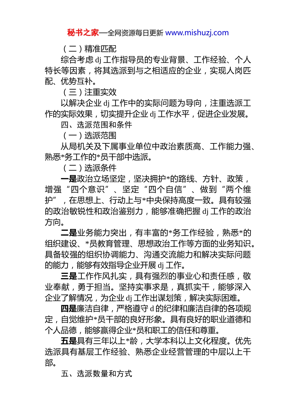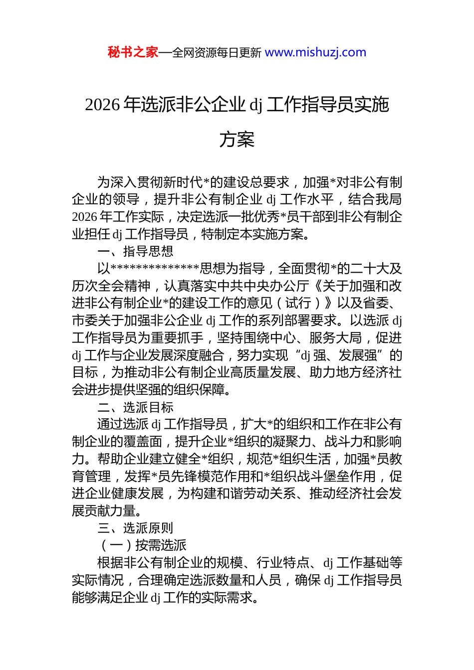 秘书之家—全网资源每日更新 www.mishuzj.com2026 年选派非公企业 dj 工作指导员实施方案为深入贯彻新时代*的建设总要求,加强*对非公有制企业的领导,提升非公有制企业 dj 工作水平,结合我局2026 年工作实际,决定选派一批优秀*员干部到非公有制企业担任 dj 工作指导员,特制定本实施方案。一、指导思想以**************思想为指导,全面贯彻*的二十大及历次全会精神,认真落实中共中央办公厅《关于加强和改进非公有制企业*的建设工作的意见(试行)》以及省委、市委关于加强非公企业 dj 工作的系列部署要求。以选派 dj工作指导员为重要抓手,坚持围绕中心、服务大局,促进dj 工作与企业发展深度融合,努力实现“dj 强、发展强”的目标,为推动非公有制企业高质量发展、助力地方经济社会进步提供坚强的组织保障。二、选派目标通过选派 dj 工作指导员,扩大*的组织和工作在非公有制企业的覆盖面,提升企业*组织的凝聚力、战斗力和影响力。帮助企业建立健全*组织,规范*组织生活,加强*员教育管理,发挥*员先锋模范作用和*组织战斗堡垒作用,促进企业健康发展,为构建和谐劳动关系、推动经济社会发展贡献力量。三、选派原则(一)按需选派根据非公有制企业的规模、行业特点、dj 工作基础等实际情况,合理确定选派数量和人员,确保 dj 工作指导员能够满足企业 dj 工作的实际需求。秘书之家—全网资源每日更新 www.mishuzj.com(二)精准匹配综合考虑 dj 工作指导员的专业背景、工作经验、个人特长等因素,将其选派到与之相适应的企业,实现人岗匹配、优势互补。(三)注重实效以解决企业 dj 工作中的实际问题为导向,注重选派工作的实际效果,切实提升企业 dj 工作水平,促进企业发展。四、选派范围和条件(一)选派范围从局机关及下属事业单位中政治素质高、工作能力强、熟悉*务工作的*员干部中选派。(二)选派条件一是政治立场坚定,坚决拥护*的路线、方针、政策,增强“四个意识”、坚定“四个自信”、做到“两个维护”,在思想上、行动上与*中央保持高度一致。具有较强的政治敏锐性和政治鉴别力,能够准确把握 dj 工作的政治方向。二是业务能力突出,有丰富的*务工作经验,熟悉*的组织建设、*员教育管理、思想政治工作等方面的业务知识。具备较强的组织协调能力、沟通交流能力和解决实际问题的能力,能够有效指导企业开展 dj 工作。三是工作作风扎实,具有强烈的事业心和责任感,敬业奉献,勇于担当。坚持实事求是,真抓实干,能够深入企业了解情况,为企业 dj 工作出谋划策,解决实际困难。四是廉洁自律,严格遵守 d 的纪律和廉洁自律的各项规定,自觉维护*员干部的良好形象。具有良好的职业道德和个人品德,能够赢得企业*员和职工的信任和尊重。五是具有三年以上*龄,大学本科以上文化程度。优先选派具有基层工作经验、熟悉企业经营管理的中层以上干部。五、选派数量和方式秘书之家—全网资源每日更新 www.mishuzj.com(一)选派数量根据 2026 年非公有制企业 dj 工作的实际需求,计划选派 x 名 dj 工作指导员。(二)选派方式采取个人自荐、组织推荐、企业选择、局*委委任相结合的方式进行选派。具体程序如下:1.宣传动员。局*委通过召开会议、发布通知等形式,广泛宣传选派 dj 工作指导员的重要意义和具体要求,鼓励符合条件的*员干部积极报名。2.个人自荐和组织推荐。符合条件的*员干部可以个人自荐,也可以由所在单位*组织推荐。自荐和推荐时需填写《dj 工作指导员推荐表》,并提供相关证明材料。3.资格审查。局*委对自荐和推荐人员进行资格审查,确定初步人选。4.企业选择。将初步人选名单提供给相关非公有制企业,由企业根据自身需求和人选情况进行选择。5.局*委委任。根据企业选择情况,局*委研究确定最终选派人员,并颁发《dj 工作指导员聘书》。六、工作职责dj 工作指导员要紧紧围绕企业发展和 dj 工作实际,按照“围绕发展抓 dj、抓好 dj 促发展”的要求,认真履行以下工作职责:(一)建强*组织一是摸清企业*员底数,对企业*员的基本情况进行全面调查,建立*员信息台账。根据企业*员人数、分布情况等,按...