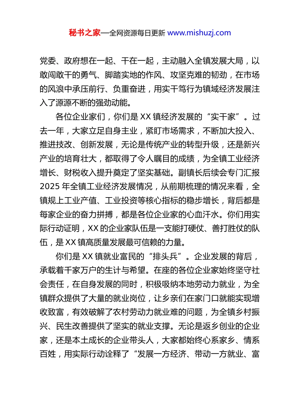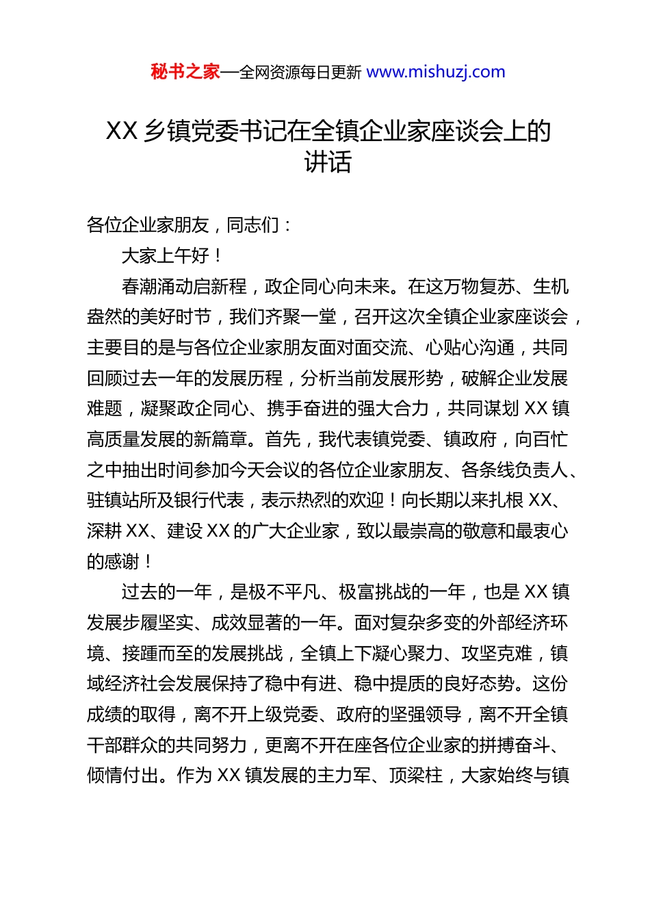 秘书之家—全网资源每日更新 www.mishuzj.comXX 乡镇党委书记在全镇企业家座谈会上的讲话各位企业家朋友,同志们:大家上午好!春潮涌动启新程,政企同心向未来。在这万物复苏、生机盎然的美好时节,我们齐聚一堂,召开这次全镇企业家座谈会,主要目的是与各位企业家朋友面对面交流、心贴心沟通,共同回顾过去一年的发展历程,分析当前发展形势,破解企业发展难题,凝聚政企同心、携手奋进的强大合力,共同谋划 XX 镇高质量发展的新篇章。首先,我代表镇党委、镇政府,向百忙之中抽出时间参加今天会议的各位企业家朋友、各条线负责人、驻镇站所及银行代表,表示热烈的欢迎!向长期以来扎根 XX、深耕 XX、建设 XX 的广大企业家,致以最崇高的敬意和最衷心的感谢!过去的一年,是极不平凡、极富挑战的一年,也是 XX 镇发展步履坚实、成效显著的一年。面对复杂多变的外部经济环境、接踵而至的发展挑战,全镇上下凝心聚力、攻坚克难,镇域经济社会发展保持了稳中有进、稳中提质的良好态势。这份成绩的取得,离不开上级党委、政府的坚强领导,离不开全镇干部群众的共同努力,更离不开在座各位企业家的拼搏奋斗、倾情付出。作为 XX 镇发展的主力军、顶梁柱,大家始终与镇秘书之家—全网资源每日更新 www.mishuzj.com党委、政府想在一起、干在一起,主动融入全镇发展大局,以敢闯敢干的勇气、脚踏实地的作风、攻坚克难的韧劲,在市场的风浪中承压前行、负重奋进,用实干笃行为镇域经济发展注入了源源不断的强劲动能。各位企业家们,你们是 XX 镇经济发展的“实干家”。过去一年,大家立足自身主业,紧盯市场需求,不断加大投入、推进技改、创新发展,无论是传统产业的转型升级,还是新兴产业的培育壮大,都取得了令人瞩目的成绩,为全镇工业经济增长、财税收入提升奠定了坚实基础。副镇长后续会专门汇报2025 年全镇工业经济发展情况,从前期梳理的情况来看,全镇规上工业产值、工业投资等核心指标的稳步增长,背后都是每家企业的奋力拼搏,都是各位企业家的心血汗水。你们用实际行动证明,XX 的企业家队伍是一支能打硬仗、善打胜仗的队伍,是 XX 镇高质量发展最可信赖的力量。你们是 XX 镇就业富民的“排头兵”。企业发展的背后,承载着千家万户的生计与希望。在座的各位企业家始终坚守社会责任,在自身发展的同时,积极吸纳本地劳动力就业,为全镇群众提供了大量的就业岗位,让乡亲们在家门口就能实现增收致富,有效破解了农村劳动力就业难的问题,为全镇乡村振兴、民生改善提供了坚实的就业支撑。无论是返乡创业的企业家,还是本土成长的企业带头人,大家都始终心系家乡、情系百姓,用实际行动诠释了“发展一方经济、带动一方就业、富秘书之家—全网资源每日更新 www.mishuzj.com裕一方百姓”的责任与担当。你们是 XX 镇公益事业的“热心人”。除了抓好生产经营,各位企业家始终心怀大爱、情系桑梓,积极参与全镇的公益事业和民生项目。无论是乡村道路建设、人居环境整治,还是助学助教、扶贫济困,大家都慷慨解囊、鼎力支持,用爱心善举温暖了一方水土,彰显了新时代企业家的家国情怀和社会担当。正是因为有了大家的无私奉献,XX 镇的乡村面貌才变得更加美丽,民生福祉才变得更加厚实,全镇上下才形成了同心同德、共建共享的良好氛围。在此,我再次向各位企业家表示衷心的感谢!你们的努力和付出,镇党委、政府看在眼里、记在心里,全镇人民也看在眼里、记在心里。XX 镇的发展历程中,必将留下你们浓墨重彩的一笔!各位企业家朋友、同志们,当前,我国经济发展持续回升向好,高质量发展的步伐不断加快,乡村振兴战略深入实施,区域协调发展的机遇持续释放。对于我们 XX 镇而言,正处于乘势而上、加快发展的关键时期,既面临着前所未有的发展机遇,也面临着一些亟待破解的发展难题。从机遇来看,我们坐拥独特的庙山汉文化资源,有着良好的产业基础和生态环境,更有一支敢闯敢干、精诚团结的企业家队伍,还有上级党委、政府的政策支持和全镇上下同心同德的发展氛围,这些都是我们加快发展的宝贵财富和坚实支撑。从挑战来看,我们也清醒秘书之家—全网资源每...