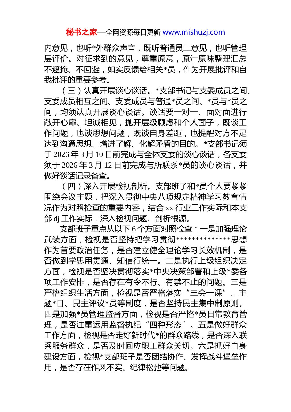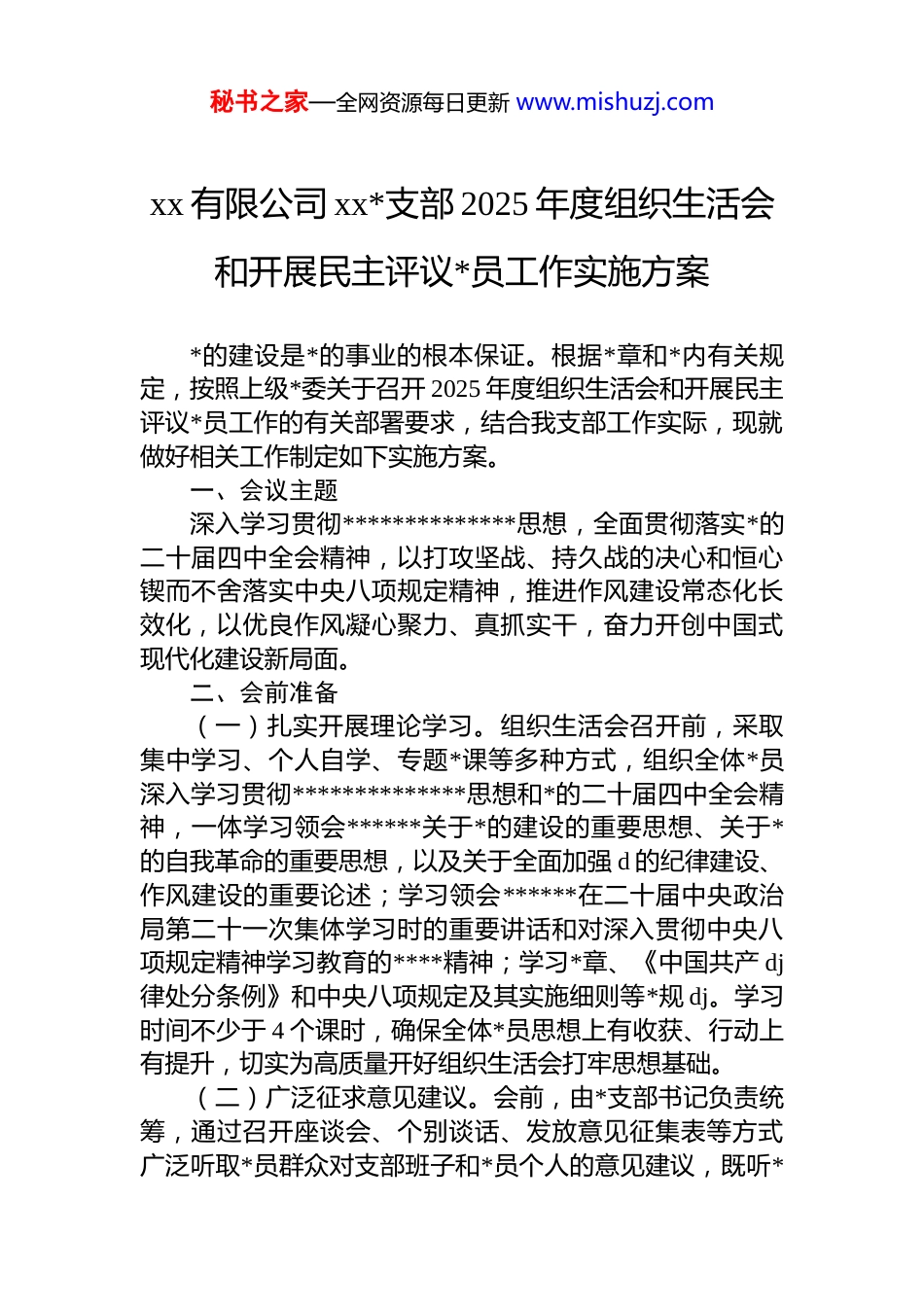 秘书之家—全网资源每日更新 www.mishuzj.comxx 有限公司 xx*支部 2025 年度组织生活会和开展民主评议*员工作实施方案*的建设是*的事业的根本保证。根据*章和*内有关规定,按照上级*委关于召开 2025 年度组织生活会和开展民主评议*员工作的有关部署要求,结合我支部工作实际,现就做好相关工作制定如下实施方案。一、会议主题深入学习贯彻**************思想,全面贯彻落实*的二十届四中全会精神,以打攻坚战、持久战的决心和恒心锲而不舍落实中央八项规定精神,推进作风建设常态化长效化,以优良作风凝心聚力、真抓实干,奋力开创中国式现代化建设新局面。二、会前准备(一)扎实开展理论学习。组织生活会召开前,采取集中学习、个人自学、专题*课等多种方式,组织全体*员深入学习贯彻**************思想和*的二十届四中全会精神,一体学习领会******关于*的建设的重要思想、关于*的自我革命的重要思想,以及关于全面加强 d 的纪律建设、作风建设的重要论述;学习领会******在二十届中央政治局第二十一次集体学习时的重要讲话和对深入贯彻中央八项规定精神学习教育的****精神;学习*章、《中国共产 dj律处分条例》和中央八项规定及其实施细则等*规 dj。学习时间不少于 4 个课时,确保全体*员思想上有收获、行动上有提升,切实为高质量开好组织生活会打牢思想基础。(二)广泛征求意见建议。会前,由*支部书记负责统筹,通过召开座谈会、个别谈话、发放意见征集表等方式广泛听取*员群众对支部班子和*员个人的意见建议,既听*秘书之家—全网资源每日更新 www.mishuzj.com内意见,也听*外群众声音,既听普通员工意见,也听管理层评价。对征求到的意见,尊重原意,原汁原味整理汇总不遮掩、不回避,如实反馈给相关*员,作为开展批评和自我批评的重要参考。(三)认真开展谈心谈话。*支部书记与支委成员之间、支委成员相互之间、支委成员与普通*员之间、*员与*员之间,均须认真开展谈心谈话。谈话要一对一、面对面进行敞开心扉、坦诚相见,抛开层级顾虑和个人面子,既谈工作问题,也谈思想问题,既谈自身差距,也提醒对方不足达到沟通思想、增进了解、化解矛盾的目的。*支部书记须于 2026 年 3 月 10 日前完成与全体支委的谈心谈话,各支委须于 2026 年 3 月 12 日前完成与所联系*员的谈心谈话,并做好谈话记录备查。(四)深入开展检视剖析。支部班子和*员个人要紧紧围绕会议主题,把深入贯彻中央八项规定精神学习教育情况作为对照检查的重要内容,结合 xx 行业工作实际和本支部 dj 工作实际,深入检视问题、剖析根源。支部班子重点从以下 6 个方面对照检查:一是加强理论武装方面,检视是否坚持把学习贯彻**************思想作为首要政治任务,是否建立健全理论学习长效机制,是否做到学思用贯通、知信行统一。二是执行上级组织决定方面,检视是否坚决贯彻落实*中央决策部署和上级*委各项工作安排,是否存在有令不行、有禁不止的问题。三是严格组织生活方面,检视是否严格落实“三会一课”、主题*日、民主评议*员等制度,是否坚持民主集中制原则。四是加强*员管理监督方面,检视是否严格*员日常教育管理,是否注重运用监督执纪“四种形态”。五是做好群众工作方面,检视是否走好新时代*的群众路线,是否深入联系服务群众,是否及时回应职工群众关切。六是抓好自身建设方面,检视*支部班子是否团结协作、发挥战斗堡垒作用,是否存在作风不实、纪律松弛等问题。秘书之家—全网资源每日更新 www.mishuzj.com*员个人重点从以下 5 个方面查找差距不足:一是学习贯彻*的创新理论方面,检视是否自觉用**************思想武装头脑、指导实践、推动工作,是否存在学用脱节等问题。二是加强*性锤炼方面,检视是否坚定理想信念,是否严守政治纪律和政治规矩,是否做到对*忠诚老实。三是联系服务群众方面,检视是否践行全心全意为人民服务的根本宗旨,是否存在脱离群众、漠视群众利益等问题。四是发挥先锋模范作用方面,检视是否在急难险重任务中冲锋在前,是否在日常工作中敢于担当、主动作为,是否在保障城市供水安全中彰显*员本色。五是改作风树新风方面,...