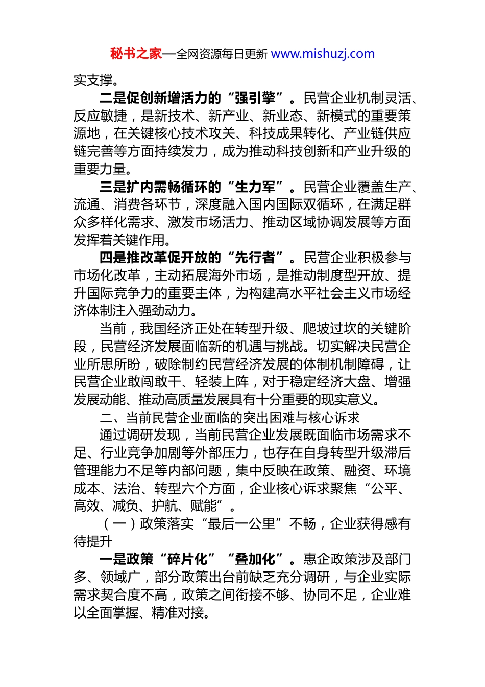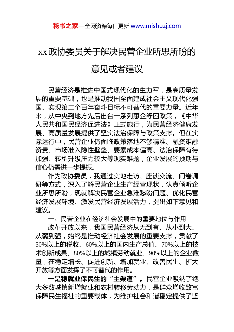 秘书之家—全网资源每日更新 www.mishuzj.comxx 政协委员关于解决民营企业所思所盼的意见或者建议民营经济是推进中国式现代化的生力军,是高质量发展的重要基础,也是推动我国全面建成社会主义现代化强国、实现第二个百年奋斗目标不可替代的重要力量。近年来,从中央到地方先后出台一系列惠企纾困政策,《中华人民共和国民经济促进法》正式施行,为民营经济健康发展、高质量发展提供了坚实法治保障与政策支撑。但在实际运行中,民营企业仍面临政策落地不够精准、融资难融资贵、市场准入隐性壁垒、要素成本偏高、法治保障有待加强、转型升级压力较大等现实难题,企业发展的预期与信心仍需进一步提振。作为政协委员,我通过实地走访、座谈交流、问卷调研等方式,深入了解民营企业生产经营现状,认真倾听企业所思所盼,现就解决民营企业急难愁盼问题、优化民营经济发展环境、激发民营经济发展活力,提出如下意见和建议。一、民营企业在经济社会发展中的重要地位与作用改革开放以来,我国民营经济从无到有、从小到大、从弱到强,始终是推动经济社会发展的重要支撑,贡献了50%以上的税收、60%以上的国内生产总值、70%以上的技术创新成果、80%以上的城镇劳动就业、90%以上的企业数量,在稳定增长、促进创新、增加就业、改善民生、扩大开放等方面发挥了不可替代的作用。一是稳就业保民生的“主渠道”。民营企业吸纳了绝大多数城镇新增就业和农村转移劳动力,是群众增收致富保障民生福祉的重要载体,为维护社会和谐稳定提供了坚秘书之家—全网资源每日更新 www.mishuzj.com实支撑。二是促创新增活力的“强引擎”。民营企业机制灵活、反应敏捷,是新技术、新产业、新业态、新模式的重要策源地,在关键核心技术攻关、科技成果转化、产业链供应链完善等方面持续发力,成为推动科技创新和产业升级的重要力量。三是扩内需畅循环的“生力军”。民营企业覆盖生产、流通、消费各环节,深度融入国内国际双循环,在满足群众多样化需求、激发市场活力、推动区域协调发展等方面发挥着关键作用。四是推改革促开放的“先行者”。民营企业积极参与市场化改革,主动拓展海外市场,是推动制度型开放、提升国际竞争力的重要主体,为构建高水平社会主义市场经济体制注入强劲动力。当前,我国经济正处在转型升级、爬坡过坎的关键阶段,民营经济发展面临新的机遇与挑战。切实解决民营企业所思所盼,破除制约民营经济发展的体制机制障碍,让民营企业敢闯敢干、轻装上阵,对于稳定经济大盘、增强发展动能、推动高质量发展具有十分重要的现实意义。二、当前民营企业面临的突出困难与核心诉求通过调研发现,当前民营企业发展既面临市场需求不足、行业竞争加剧等外部压力,也存在自身转型升级滞后管理能力不足等内部问题,集中反映在政策、融资、环境成本、法治、转型六个方面,企业核心诉求聚焦“公平、高效、减负、护航、赋能”。(一)政策落实“最后一公里”不畅,企业获得感有待提升一是政策“碎片化”“叠加化”。惠企政策涉及部门多、领域广,部分政策出台前缺乏充分调研,与企业实际需求契合度不高,政策之间衔接不够、协同不足,企业难以全面掌握、精准对接。秘书之家—全网资源每日更新 www.mishuzj.com二是“企业找政策”仍是主流。部分政策宣传解读不到位,申报流程繁琐、材料复杂、周期较长,数字化、智能化服务水平不高,“免申即享”“直达快享”覆盖面有限,好政策难以快速转化为企业实惠。三是存在“玻璃门”“弹簧门”“旋转门”。部分领域市场准入看似开放,实则存在隐性壁垒,在招投标、政府采购、项目审批等环节,民营企业仍面临不公平待遇,平等使用生产要素、公平参与市场竞争的权利未完全落实。(二)融资难融资贵问题依然突出,金融赋能效果有待增强一是信贷歧视尚未完全消除。金融机构对民营企业存在“惜贷”“慎贷”现象,贷款审批门槛高、条件严,民营企业尤其是中小微企业授信额度低、融资成本高,与国有企业在融资利率、期限、担保等方面存在明显差距。二是融资渠道单一。民营企业过度依赖银行贷款,股权融资、债券融资等直接融资渠道不畅,上市融资门槛高周期长,中小微企业难以通...