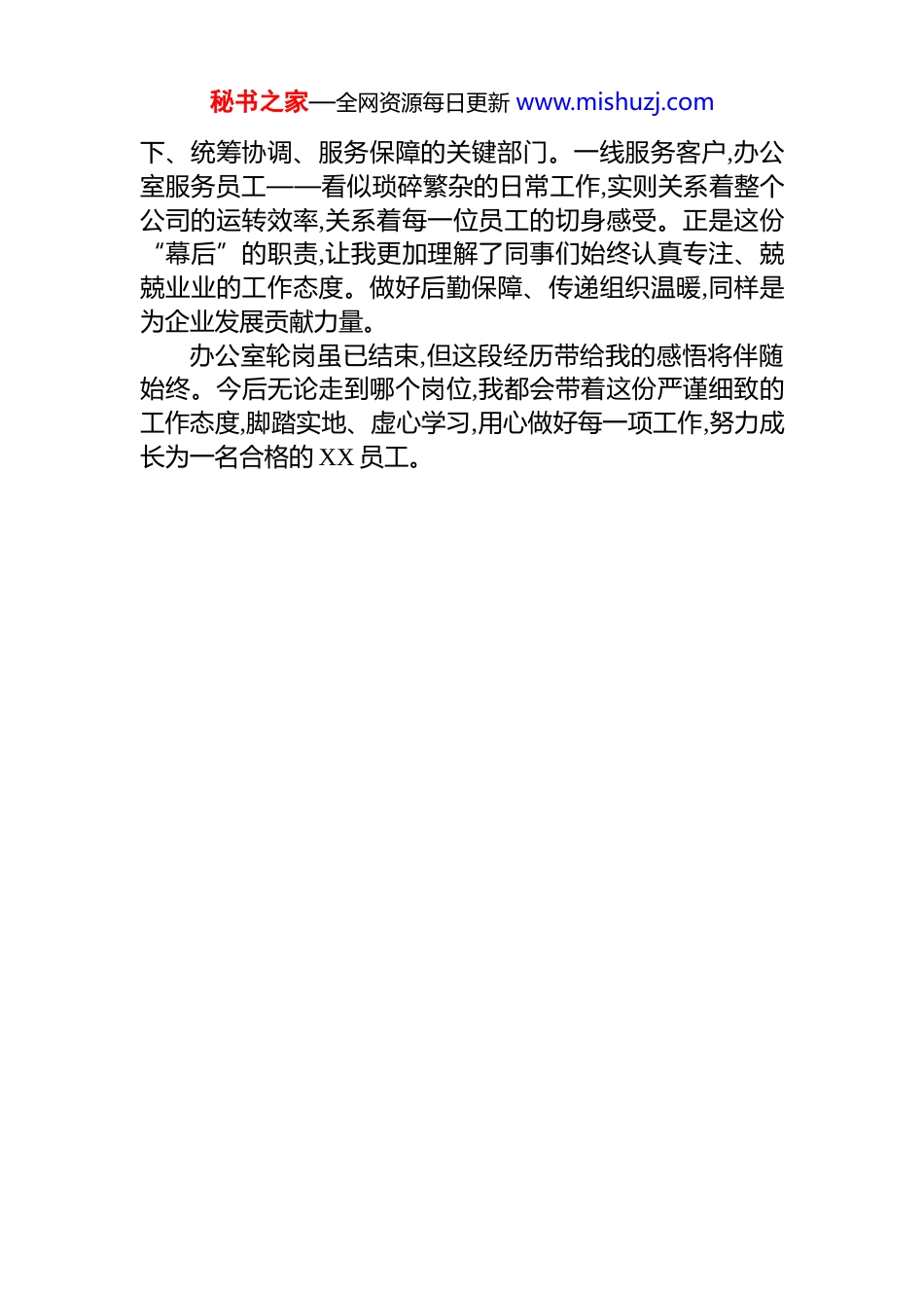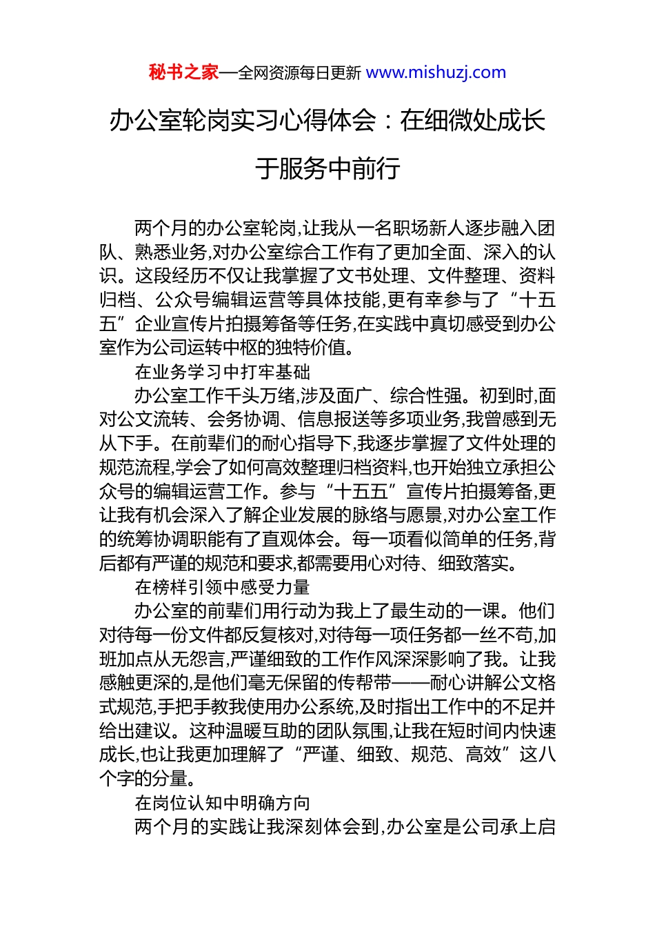 秘书之家—全网资源每日更新 www.mishuzj.com办公室轮岗实习心得体会:在细微处成长于服务中前行两个月的办公室轮岗,让我从一名职场新人逐步融入团队、熟悉业务,对办公室综合工作有了更加全面、深入的认识。这段经历不仅让我掌握了文书处理、文件整理、资料归档、公众号编辑运营等具体技能,更有幸参与了“十五五”企业宣传片拍摄筹备等任务,在实践中真切感受到办公室作为公司运转中枢的独特价值。在业务学习中打牢基础办公室工作千头万绪,涉及面广、综合性强。初到时,面对公文流转、会务协调、信息报送等多项业务,我曾感到无从下手。在前辈们的耐心指导下,我逐步掌握了文件处理的规范流程,学会了如何高效整理归档资料,也开始独立承担公众号的编辑运营工作。参与“十五五”宣传片拍摄筹备,更让我有机会深入了解企业发展的脉络与愿景,对办公室工作的统筹协调职能有了直观体会。每一项看似简单的任务,背后都有严谨的规范和要求,都需要用心对待、细致落实。在榜样引领中感受力量办公室的前辈们用行动为我上了最生动的一课。他们对待每一份文件都反复核对,对待每一项任务都一丝不苟,加班加点从无怨言,严谨细致的工作作风深深影响了我。让我感触更深的,是他们毫无保留的传帮带——耐心讲解公文格式规范,手把手教我使用办公系统,及时指出工作中的不足并给出建议。这种温暖互助的团队氛围,让我在短时间内快速成长,也让我更加理解了“严谨、细致、规范、高效”这八个字的分量。在岗位认知中明确方向两个月的实践让我深刻体会到,办公室是公司承上启秘书之家—全网资源每日更新 www.mishuzj.com下、统筹协调、服务保障的关键部门。一线服务客户,办公室服务员工——看似琐碎繁杂的日常工作,实则关系着整个公司的运转效率,关系着每一位员工的切身感受。正是这份“幕后”的职责,让我更加理解了同事们始终认真专注、兢兢业业的工作态度。做好后勤保障、传递组织温暖,同样是为企业发展贡献力量。办公室轮岗虽已结束,但这段经历带给我的感悟将伴随始终。今后无论走到哪个岗位,我都会带着这份严谨细致的工作态度,脚踏实地、虚心学习,用心做好每一项工作,努力成长为一名合格的 XX 员工。