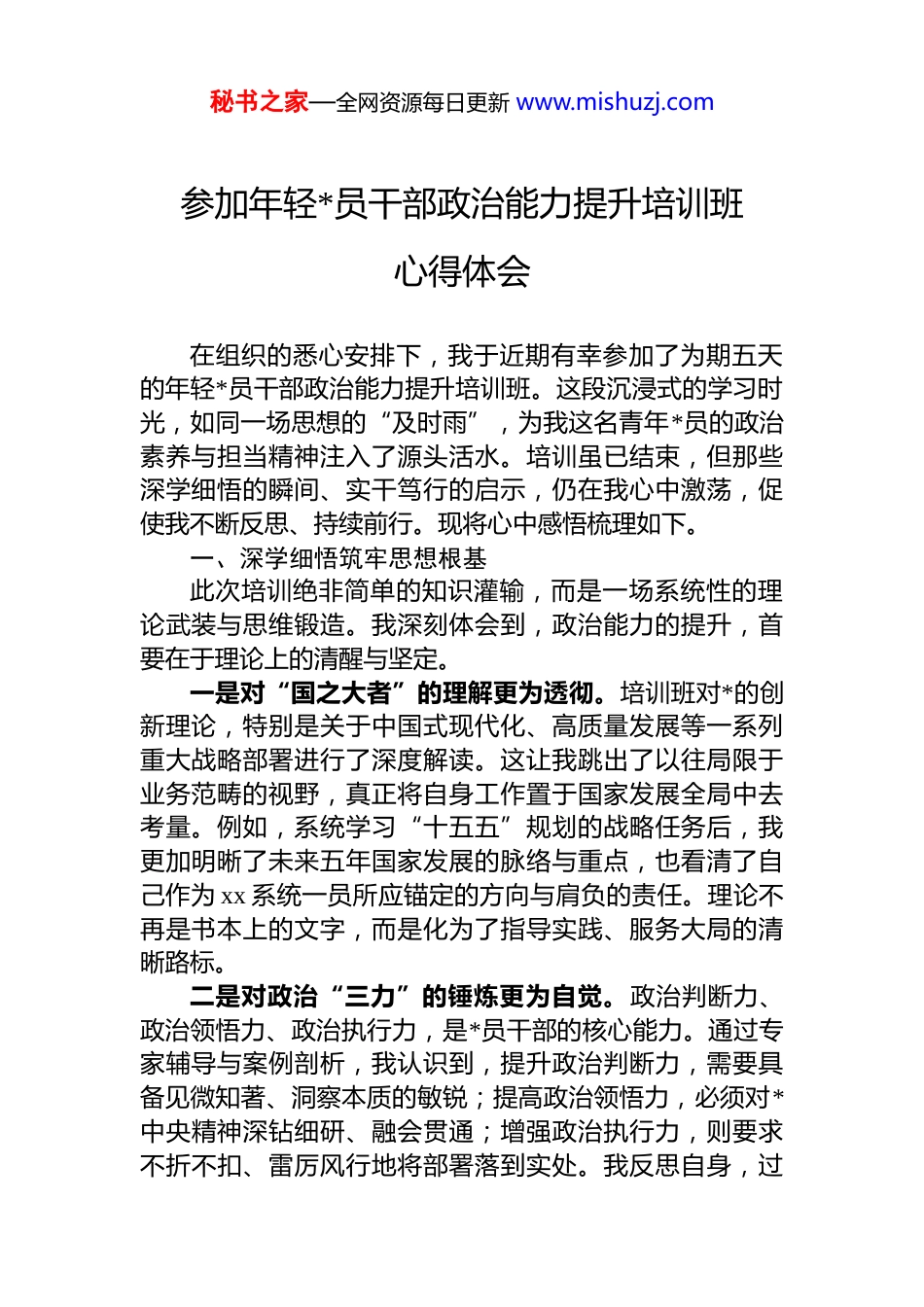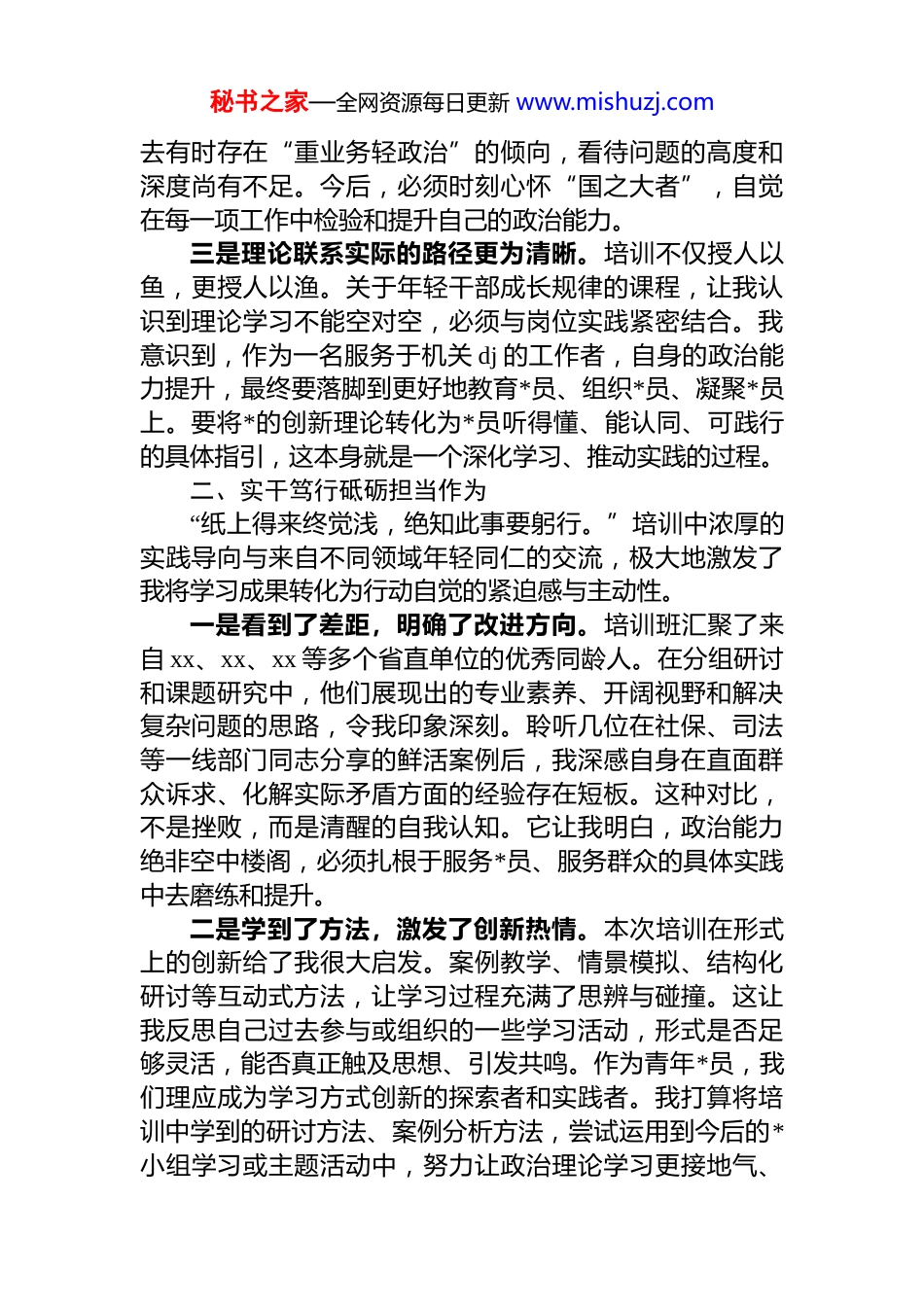 秘书之家—全网资源每日更新 www.mishuzj.com参加年轻*员干部政治能力提升培训班心得体会在组织的悉心安排下,我于近期有幸参加了为期五天的年轻*员干部政治能力提升培训班。这段沉浸式的学习时光,如同一场思想的“及时雨”,为我这名青年*员的政治素养与担当精神注入了源头活水。培训虽已结束,但那些深学细悟的瞬间、实干笃行的启示,仍在我心中激荡,促使我不断反思、持续前行。现将心中感悟梳理如下。一、深学细悟筑牢思想根基此次培训绝非简单的知识灌输,而是一场系统性的理论武装与思维锻造。我深刻体会到,政治能力的提升,首要在于理论上的清醒与坚定。一是对“国之大者”的理解更为透彻。培训班对*的创新理论,特别是关于中国式现代化、高质量发展等一系列重大战略部署进行了深度解读。这让我跳出了以往局限于业务范畴的视野,真正将自身工作置于国家发展全局中去考量。例如,系统学习“十五五”规划的战略任务后,我更加明晰了未来五年国家发展的脉络与重点,也看清了自己作为 xx 系统一员所应锚定的方向与肩负的责任。理论不再是书本上的文字,而是化为了指导实践、服务大局的清晰路标。二是对政治“三力”的锤炼更为自觉。政治判断力、政治领悟力、政治执行力,是*员干部的核心能力。通过专家辅导与案例剖析,我认识到,提升政治判断力,需要具备见微知著、洞察本质的敏锐;提高政治领悟力,必须对*中央精神深钻细研、融会贯通;增强政治执行力,则要求不折不扣、雷厉风行地将部署落到实处。我反思自身,过秘书之家—全网资源每日更新 www.mishuzj.com去有时存在“重业务轻政治”的倾向,看待问题的高度和深度尚有不足。今后,必须时刻心怀“国之大者”,自觉在每一项工作中检验和提升自己的政治能力。三是理论联系实际的路径更为清晰。培训不仅授人以鱼,更授人以渔。关于年轻干部成长规律的课程,让我认识到理论学习不能空对空,必须与岗位实践紧密结合。我意识到,作为一名服务于机关 dj 的工作者,自身的政治能力提升,最终要落脚到更好地教育*员、组织*员、凝聚*员上。要将*的创新理论转化为*员听得懂、能认同、可践行的具体指引,这本身就是一个深化学习、推动实践的过程。二、实干笃行砥砺担当作为“纸上得来终觉浅,绝知此事要躬行。”培训中浓厚的实践导向与来自不同领域年轻同仁的交流,极大地激发了我将学习成果转化为行动自觉的紧迫感与主动性。一是看到了差距,明确了改进方向。培训班汇聚了来自 xx、xx、xx 等多个省直单位的优秀同龄人。在分组研讨和课题研究中,他们展现出的专业素养、开阔视野和解决复杂问题的思路,令我印象深刻。聆听几位在社保、司法等一线部门同志分享的鲜活案例后,我深感自身在直面群众诉求、化解实际矛盾方面的经验存在短板。这种对比,不是挫败,而是清醒的自我认知。它让我明白,政治能力绝非空中楼阁,必须扎根于服务*员、服务群众的具体实践中去磨练和提升。二是学到了方法,激发了创新热情。本次培训在形式上的创新给了我很大启发。案例教学、情景模拟、结构化研讨等互动式方法,让学习过程充满了思辨与碰撞。这让我反思自己过去参与或组织的一些学习活动,形式是否足够灵活,能否真正触及思想、引发共鸣。作为青年*员,我们理应成为学习方式创新的探索者和实践者。我打算将培训中学到的研讨方法、案例分析方法,尝试运用到今后的*小组学习或主题活动中,努力让政治理论学习更接地气、秘书之家—全网资源每日更新 www.mishuzj.com更有活力。三是感受到了氛围,强化了协作意识。与一群充满朝气、志同道合的年轻人共同学习、相互砥砺,是本次培训一份宝贵的收获。我们来自不同岗位,却为着共同的事业追求而相聚。在思想交锋中,我收获了看问题的新角度;在经验分享中,我学到了处理事务的新方法。这让我深切体会到,个人的成长离不开团队的滋养与环境的熏陶。青年干部的成长,既要个人刻苦努力,也要善于向领导学习向同事请教、向实践求真知,在团结协作、互学互鉴中共同进步。三、永葆忠诚践行初心使命培训的结束,恰恰是新征程的开始。五天的学习,不仅是一次知识的扩容,更是一次*性的淬炼与初心的重温。它促...