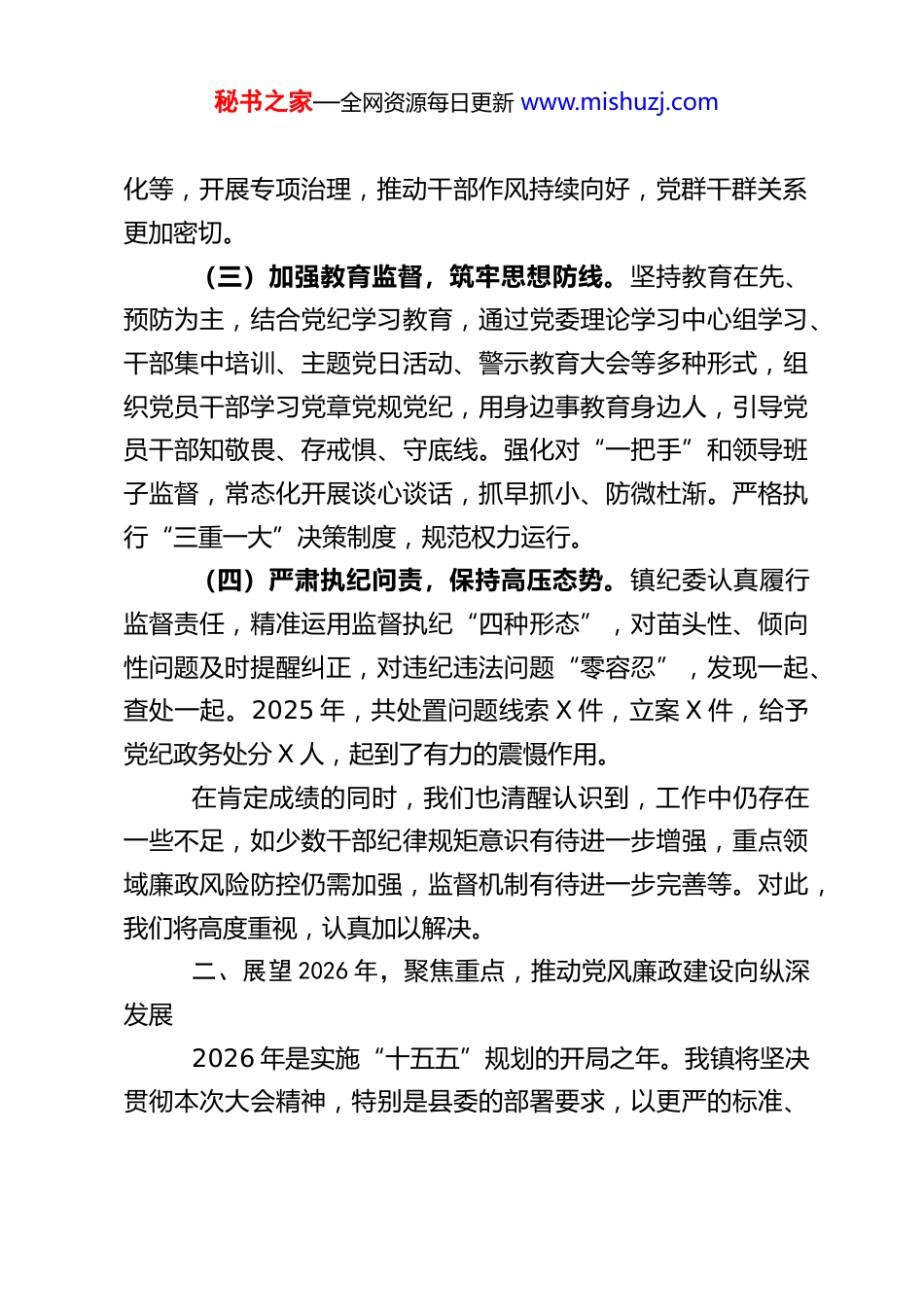 秘书之家—全网资源每日更新 www.mishuzj.comXX 乡镇长在全县党风廉政建设大会上的发言尊敬的各位领导、同志们:大家好!根据会议安排,我代表 XX 镇党委、政府,就我镇党风廉政建设情况作简要汇报,并对下一步工作谈几点打算。一、回顾 2025 年,固本强基,持续深化党风廉政建设过去一年,在县委、县政府的坚强领导和县纪委监委的有力指导下,我镇坚持以严的基调强化正风肃纪,推动党风廉政建设和反腐败工作取得新进展。(一)强化政治引领,压实主体责任。始终坚持把党的政治建设摆在首位,深入学习贯彻关于全面从严治党的重要论述和中央、省、市、县相关会议精神。严格执行《党委(党组)落实全面从严治党主体责任规定》,镇党委定期专题研究党风廉政工作,班子成员认真履行“一岗双责”,层层传导压力,推动管党治党责任落到实处。严肃党内政治生活,高质量开好民主生活会和组织生活会,不断增强政治判断力、政治领悟力、政治执行力。(二)深化作风建设,纠治“四风”顽疾。严格落实中央八项规定及其实施细则精神,紧盯重要节点、重点领域,常态化开展明察暗访和专项检查。深入开展形式主义、官僚主义整治,大力精简文件会议,切实为基层减负。围绕群众反映强烈的突出问题,如惠民政策落实、工程项目建设、营商环境优秘书之家—全网资源每日更新 www.mishuzj.com化等,开展专项治理,推动干部作风持续向好,党群干群关系更加密切。(三)加强教育监督,筑牢思想防线。坚持教育在先、预防为主,结合党纪学习教育,通过党委理论学习中心组学习、干部集中培训、主题党日活动、警示教育大会等多种形式,组织党员干部学习党章党规党纪,用身边事教育身边人,引导党员干部知敬畏、存戒惧、守底线。强化对“一把手”和领导班子监督,常态化开展谈心谈话,抓早抓小、防微杜渐。严格执行“三重一大”决策制度,规范权力运行。(四)严肃执纪问责,保持高压态势。镇纪委认真履行监督责任,精准运用监督执纪“四种形态”,对苗头性、倾向性问题及时提醒纠正,对违纪违法问题“零容忍”,发现一起、查处一起。2025 年,共处置问题线索 X 件,立案 X 件,给予党纪政务处分 X 人,起到了有力的震慑作用。在肯定成绩的同时,我们也清醒认识到,工作中仍存在一些不足,如少数干部纪律规矩意识有待进一步增强,重点领域廉政风险防控仍需加强,监督机制有待进一步完善等。对此,我们将高度重视,认真加以解决。二、展望 2026 年,聚焦重点,推动党风廉政建设向纵深发展2026 年是实施“十五五”规划的开局之年。我镇将坚决贯彻本次大会精神,特别是县委的部署要求,以更严的标准、秘书之家—全网资源每日更新 www.mishuzj.com更实的举措,纵深推进全面从严治党,为 XX 镇高质量发展提供坚强纪律保障。(一)一以贯之加强政治建设,在践行“两个维护”上展现新担当。坚持把党的政治建设作为根本性建设,持续巩固拓展主题教育成果,引导全镇党员干部深刻领悟“两个确立”的决定性意义,自觉在思想上政治上行动上同党中央保持高度一致。严明政治纪律和政治规矩,确保中央大政方针和省市县决策部署在 XX 镇不折不扣落地生根。(二)深入开展树立和践行正确政绩观学习教育,在推动高质量发展上谋求新作为。将“树立和践行正确政绩观”作为今年党风廉政教育的重要内容贯穿全年。一是深化学习教育。组织党员干部深入学习关于树立和践行正确政绩观的重要论述,深刻理解“政绩为谁而树、树什么样的政绩、靠什么树政绩”这一根本问题,引导大家牢记初心使命,坚持发展为了人民、发展依靠人民、发展成果由人民共享。二是融入工作实践。把正确政绩观的要求落实到镇党委、政府各项决策部署和具体工作中。坚决反对急功近利、好大喜功的“形象工程”“政绩工程”,多做打基础、利长远、惠民生的工作。在项目建设、乡村振兴、生态环保、安全稳定等工作中,始终把群众满意作为衡量政绩的根本标准,注重实际效果和社会效益。三是健全考核评价。完善干部考核评价体系,突出高质量发展导向和群众满意度指标,引导干部创造经得起实践、人民、历史检验的业秘书之家—全网资源每日更新 www.mishuz...