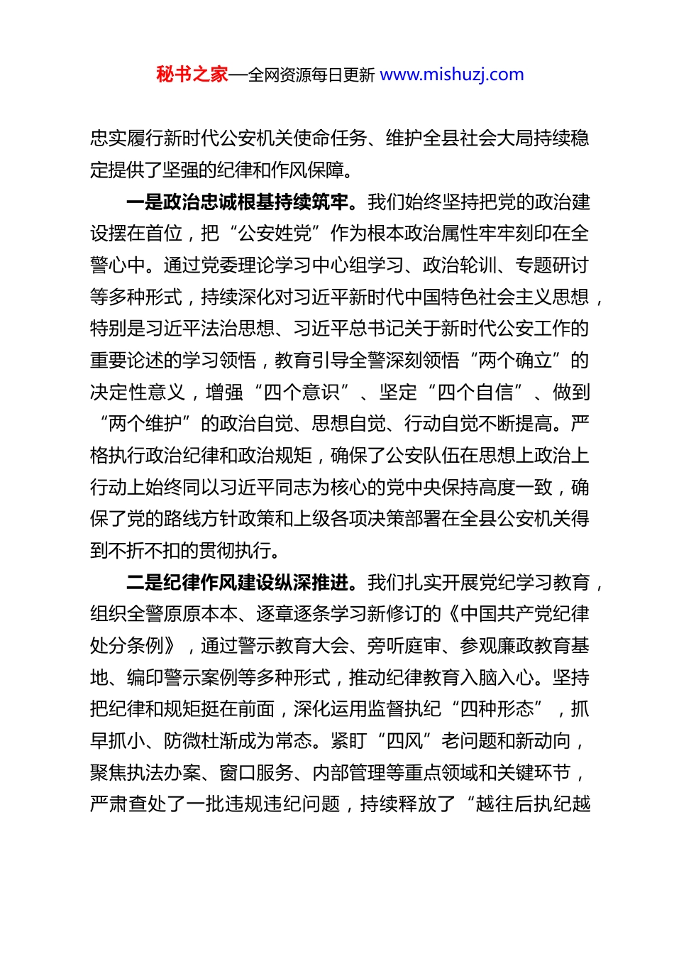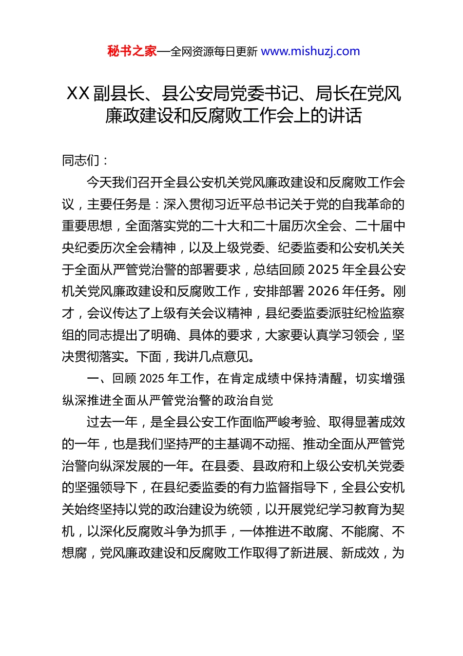 秘书之家—全网资源每日更新 www.mishuzj.comXX 副县长、县公安局党委书记、局长在党风廉政建设和反腐败工作会上的讲话同志们:今天我们召开全县公安机关党风廉政建设和反腐败工作会议,主要任务是:深入贯彻习近平总书记关于党的自我革命的重要思想,全面落实党的二十大和二十届历次全会、二十届中央纪委历次全会精神,以及上级党委、纪委监委和公安机关关于全面从严管党治警的部署要求,总结回顾 2025 年全县公安机关党风廉政建设和反腐败工作,安排部署 2026 年任务。刚才,会议传达了上级有关会议精神,县纪委监委派驻纪检监察组的同志提出了明确、具体的要求,大家要认真学习领会,坚决贯彻落实。下面,我讲几点意见。一、回顾 2025 年工作,在肯定成绩中保持清醒,切实增强纵深推进全面从严管党治警的政治自觉过去一年,是全县公安工作面临严峻考验、取得显著成效的一年,也是我们坚持严的主基调不动摇、推动全面从严管党治警向纵深发展的一年。在县委、县政府和上级公安机关党委的坚强领导下,在县纪委监委的有力监督指导下,全县公安机关始终坚持以党的政治建设为统领,以开展党纪学习教育为契机,以深化反腐败斗争为抓手,一体推进不敢腐、不能腐、不想腐,党风廉政建设和反腐败工作取得了新进展、新成效,为秘书之家—全网资源每日更新 www.mishuzj.com忠实履行新时代公安机关使命任务、维护全县社会大局持续稳定提供了坚强的纪律和作风保障。一是政治忠诚根基持续筑牢。我们始终坚持把党的政治建设摆在首位,把“公安姓党”作为根本政治属性牢牢刻印在全警心中。通过党委理论学习中心组学习、政治轮训、专题研讨等多种形式,持续深化对习近平新时代中国特色社会主义思想,特别是习近平法治思想、习近平总书记关于新时代公安工作的重要论述的学习领悟,教育引导全警深刻领悟“两个确立”的决定性意义,增强“四个意识”、坚定“四个自信”、做到“两个维护”的政治自觉、思想自觉、行动自觉不断提高。严格执行政治纪律和政治规矩,确保了公安队伍在思想上政治上行动上始终同以习近平同志为核心的党中央保持高度一致,确保了党的路线方针政策和上级各项决策部署在全县公安机关得到不折不扣的贯彻执行。二是纪律作风建设纵深推进。我们扎实开展党纪学习教育,组织全警原原本本、逐章逐条学习新修订的《中国共产党纪律处分条例》,通过警示教育大会、旁听庭审、参观廉政教育基地、编印警示案例等多种形式,推动纪律教育入脑入心。坚持把纪律和规矩挺在前面,深化运用监督执纪“四种形态”,抓早抓小、防微杜渐成为常态。紧盯“四风”老问题和新动向,聚焦执法办案、窗口服务、内部管理等重点领域和关键环节,严肃查处了一批违规违纪问题,持续释放了“越往后执纪越秘书之家—全网资源每日更新 www.mishuzj.com严”的强烈信号。全警的纪律意识、规矩意识得到显著增强,遵规守纪正在从外在约束转化为内在自觉。三是反腐惩恶震慑效应不断强化。我们始终保持惩治腐败的高压态势,坚持无禁区、全覆盖、零容忍,坚持重遏制、强高压、长震慑。聚焦重点领域和关键岗位,严肃查处了利用执法司法权、行政管理权搞权力寻租、利益输送、徇私枉法等违纪违法问题。坚持受贿行贿一起查,坚决斩断“围猎”与甘于被“围猎”的利益链条。深化以案促改、以案促治,针对案件暴露出的制度漏洞和监管盲区,推动完善了一批内控机制,强化了对权力运行的制约和监督,反腐败斗争的压倒性胜利得到进一步巩固发展。四是执法为民宗旨有力践行。我们始终坚持人民公安为人民的初心使命,将整治群众身边的不正之风和腐败问题作为重中之重。紧密结合公安职责,深入推进常态化扫黑除恶斗争,严厉打击“村霸”“乡霸”“沙霸”等黑恶势力及其“保护伞”,让人民群众感受到公平正义就在身边。积极参与、配合开展医保基金欺诈骗保、养老领域诈骗等突出问题专项整治,守护好人民群众的“看病钱”“养老钱”。持续整治执法不作为、慢作为、乱作为等问题,着力解决了一批群众反映强烈的急难愁盼问题,人民群众对公安工作的满意度得到新的提升。五是管党治警责任链条持续拧紧。我们严格落实党委主体责任、...