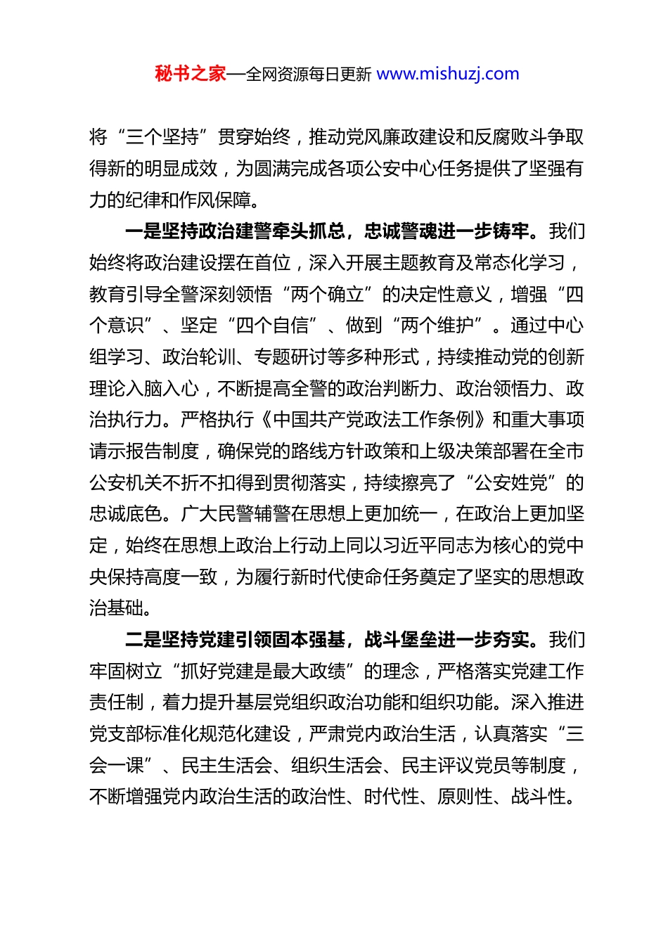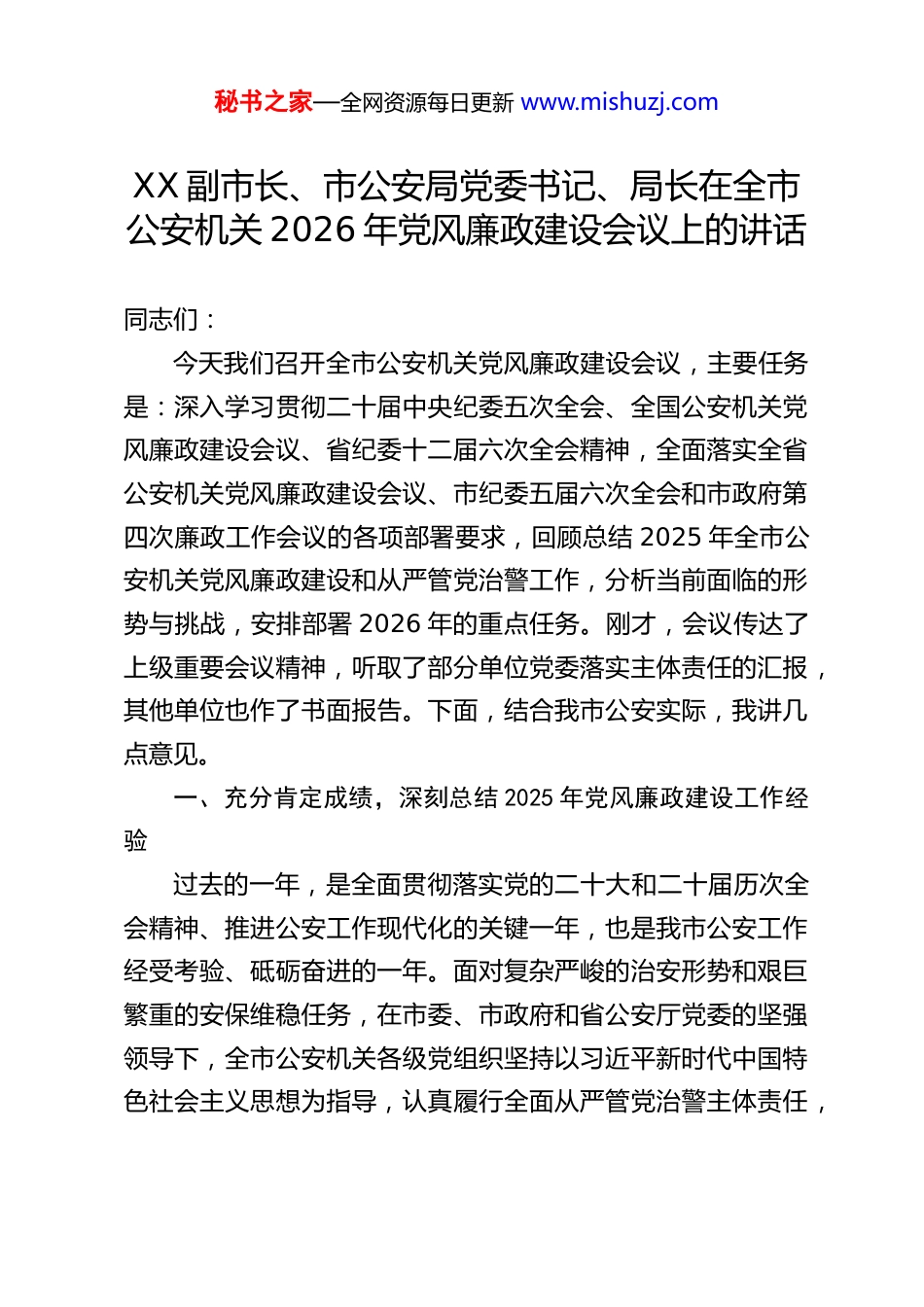 秘书之家—全网资源每日更新 www.mishuzj.comXX 副市长、市公安局党委书记、局长在全市公安机关 2026 年党风廉政建设会议上的讲话同志们:今天我们召开全市公安机关党风廉政建设会议,主要任务是:深入学习贯彻二十届中央纪委五次全会、全国公安机关党风廉政建设会议、省纪委十二届六次全会精神,全面落实全省公安机关党风廉政建设会议、市纪委五届六次全会和市政府第四次廉政工作会议的各项部署要求,回顾总结 2025 年全市公安机关党风廉政建设和从严管党治警工作,分析当前面临的形势与挑战,安排部署 2026 年的重点任务。刚才,会议传达了上级重要会议精神,听取了部分单位党委落实主体责任的汇报,其他单位也作了书面报告。下面,结合我市公安实际,我讲几点意见。一、充分肯定成绩,深刻总结 2025 年党风廉政建设工作经验过去的一年,是全面贯彻落实党的二十大和二十届历次全会精神、推进公安工作现代化的关键一年,也是我市公安工作经受考验、砥砺奋进的一年。面对复杂严峻的治安形势和艰巨繁重的安保维稳任务,在市委、市政府和省公安厅党委的坚强领导下,全市公安机关各级党组织坚持以习近平新时代中国特色社会主义思想为指导,认真履行全面从严管党治警主体责任,秘书之家—全网资源每日更新 www.mishuzj.com将“三个坚持”贯穿始终,推动党风廉政建设和反腐败斗争取得新的明显成效,为圆满完成各项公安中心任务提供了坚强有力的纪律和作风保障。一是坚持政治建警牵头抓总,忠诚警魂进一步铸牢。我们始终将政治建设摆在首位,深入开展主题教育及常态化学习,教育引导全警深刻领悟“两个确立”的决定性意义,增强“四个意识”、坚定“四个自信”、做到“两个维护”。通过中心组学习、政治轮训、专题研讨等多种形式,持续推动党的创新理论入脑入心,不断提高全警的政治判断力、政治领悟力、政治执行力。严格执行《中国共产党政法工作条例》和重大事项请示报告制度,确保党的路线方针政策和上级决策部署在全市公安机关不折不扣得到贯彻落实,持续擦亮了“公安姓党”的忠诚底色。广大民警辅警在思想上更加统一,在政治上更加坚定,始终在思想上政治上行动上同以习近平同志为核心的党中央保持高度一致,为履行新时代使命任务奠定了坚实的思想政治基础。二是坚持党建引领固本强基,战斗堡垒进一步夯实。我们牢固树立“抓好党建是最大政绩”的理念,严格落实党建工作责任制,着力提升基层党组织政治功能和组织功能。深入推进党支部标准化规范化建设,严肃党内政治生活,认真落实“三会一课”、民主生活会、组织生活会、民主评议党员等制度,不断增强党内政治生活的政治性、时代性、原则性、战斗性。秘书之家—全网资源每日更新 www.mishuzj.com充分发挥基层党组织在重大任务、执法执勤、服务群众中的战斗堡垒作用和党员民警的先锋模范作用,使党建工作与业务工作深度融合、相互促进。通过加强党建,队伍的凝聚力、向心力、战斗力得到显著增强,基层基础得到进一步巩固。三是坚持从严治警正风肃纪,纪律作风进一步严明。我们始终保持严的主基调不动摇,把纪律和规矩挺在前面。持续加固中央八项规定精神的堤坝,紧盯“四风”隐形变异新动向,针对节日期间易发多发的突出问题,加强监督检查和明察暗访,严肃查处违规吃喝、违规收送礼品礼金、公车私用等问题,推动化风成俗、形成习惯。深入开展警示教育,用身边事教育身边人,引导全警知敬畏、存戒惧、守底线。加强日常监督管理,抓早抓小、防微杜渐,运用好监督执纪“四种形态”,特别是第一种形态,让“红脸出汗”成为常态。严肃查处违纪违法问题,坚持无禁区、全覆盖、零容忍,保持惩治腐败的高压态势,一体推进不敢腐、不能腐、不想腐,队伍的整体纪律作风和精神面貌呈现出新的气象。在肯定成绩的同时,我们必须清醒地认识到,对标党中央和上级党委的高标准严要求,对照人民群众的新期待,我市公安机关党风廉政建设仍然面临不少挑战和薄弱环节。有的单位党组织主体责任落实还不够到位,“一岗双责”压力传导存在层层递减现象;个别党员干部纪律规矩意识仍显淡薄,心存侥幸;执法办案、窗口服务、项目资金管理等领域...