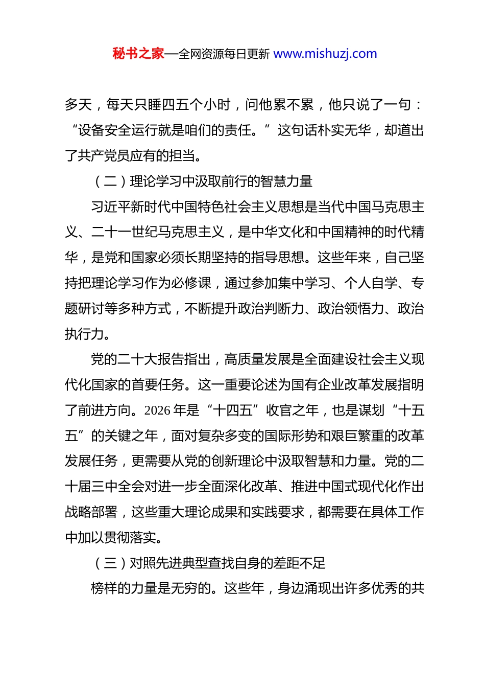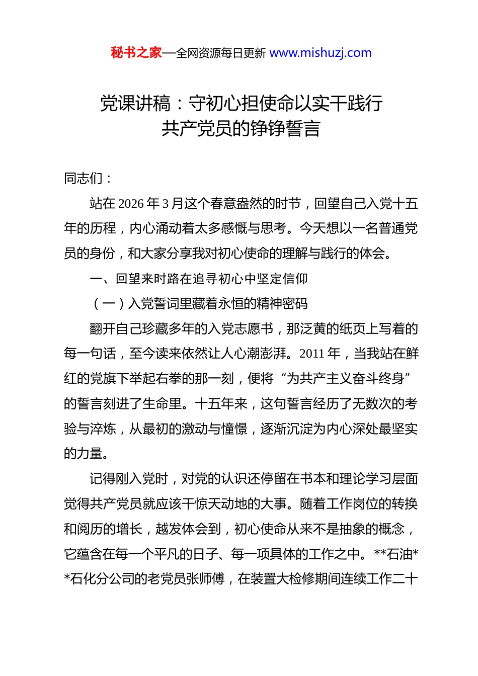 秘书之家—全网资源每日更新 www.mishuzj.com党课讲稿:守初心担使命以实干践行共产党员的铮铮誓言 同志们:站在 2026 年 3 月这个春意盎然的时节,回望自己入党十五年的历程,内心涌动着太多感慨与思考。今天想以一名普通党员的身份,和大家分享我对初心使命的理解与践行的体会。一、回望来时路在追寻初心中坚定信仰(一)入党誓词里藏着永恒的精神密码翻开自己珍藏多年的入党志愿书,那泛黄的纸页上写着的每一句话,至今读来依然让人心潮澎湃。2011 年,当我站在鲜红的党旗下举起右拳的那一刻,便将“为共产主义奋斗终身”的誓言刻进了生命里。十五年来,这句誓言经历了无数次的考验与淬炼,从最初的激动与憧憬,逐渐沉淀为内心深处最坚实的力量。记得刚入党时,对党的认识还停留在书本和理论学习层面觉得共产党员就应该干惊天动地的大事。随着工作岗位的转换和阅历的增长,越发体会到,初心使命从来不是抽象的概念,它蕴含在每一个平凡的日子、每一项具体的工作之中。**石油**石化分公司的老党员张师傅,在装置大检修期间连续工作二十秘书之家—全网资源每日更新 www.mishuzj.com多天,每天只睡四五个小时,问他累不累,他只说了一句:“设备安全运行就是咱们的责任。”这句话朴实无华,却道出了共产党员应有的担当。(二)理论学习中汲取前行的智慧力量习近平新时代中国特色社会主义思想是当代中国马克思主义、二十一世纪马克思主义,是中华文化和中国精神的时代精华,是党和国家必须长期坚持的指导思想。这些年来,自己坚持把理论学习作为必修课,通过参加集中学习、个人自学、专题研讨等多种方式,不断提升政治判断力、政治领悟力、政治执行力。党的二十大报告指出,高质量发展是全面建设社会主义现代化国家的首要任务。这一重要论述为国有企业改革发展指明了前进方向。2026 年是“十四五”收官之年,也是谋划“十五五”的关键之年,面对复杂多变的国际形势和艰巨繁重的改革发展任务,更需要从党的创新理论中汲取智慧和力量。党的二十届三中全会对进一步全面深化改革、推进中国式现代化作出战略部署,这些重大理论成果和实践要求,都需要在具体工作中加以贯彻落实。(三)对照先进典型查找自身的差距不足榜样的力量是无穷的。这些年,身边涌现出许多优秀的共秘书之家—全网资源每日更新 www.mishuzj.com产党员,他们用实际行动诠释着共产党人的精神品格。**市优秀共产党员李明同志,扎根基层一线二十年,先后参与了多个重点项目建设,在急难险重任务面前从不退缩。2025 年冬季,**地区遭遇罕见的极寒天气,他带领突击队奋战在保供一线,确保了辖区内群众温暖过冬。与之相比,自己在工作标准、奉献精神、担当意识等方面还有不小的差距。反思这些年来的工作,有时存在满足于完成任务的思想,缺乏精益求精的追求;有时习惯于按部就班,缺少开拓创新的勇气;有时遇到困难有畏难情绪,缺少迎难而上的毅力。这些问题的根源,归根结底是党性修养不够、宗旨意识淡化、担当精神不足。正视差距才能缩小差距,知不足才能有进步,今后需要以更高的标准严格要求自己。二、立足岗位实践在履职尽责中彰显担当(一)攻坚克难推进重点项目建设国有企业是党执政兴国的重要支柱和依靠力量,在国家重大战略实施中承担着重要使命。**公司作为能源行业的骨干企业,近年来积极融入国家能源安全战略布局,大力推进重点项目建设。川气东送二线工程是国家“十四五”重大能源基础设施工程,全长约 4269 公里,途经 8 省市,对于保障国家能源安全、优化能源结构、促进区域协调发展具有重要意义。秘书之家—全网资源每日更新 www.mishuzj.com截至 2026 年 3 月,该工程正在加速推进,采用新技术和国产设备,以提升质量和效率。四川段已于 2025 年 12 月进气投产,标志着工程建设取得阶段性成果。作为项目建设的参与者,深切体会到大型工程背后的艰辛付出。从项目前期的可行性研究到施工建设,每一个环节都需要精心组织、精细管理。在**标段施工过程中,遇到了复杂的地质条件,党员突击队主动请缨,开展技术攻关,最终攻克了施工难题。中国石油独山子石化塔里木 120 万吨/年二期...