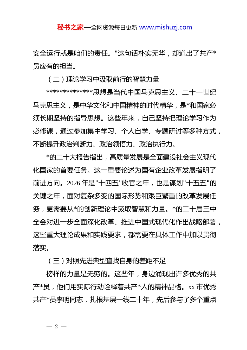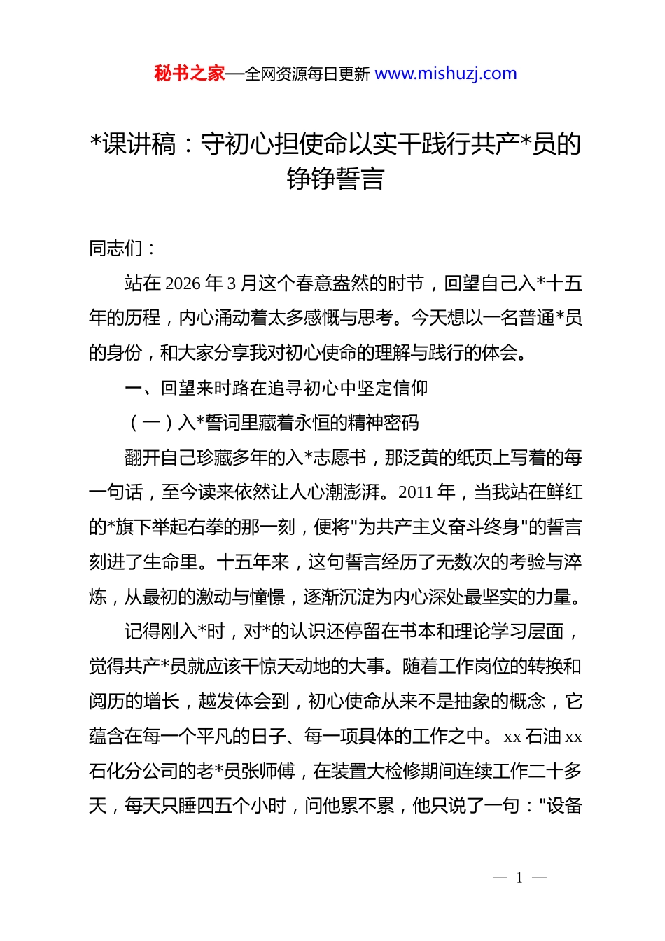 秘书之家—全网资源每日更新 www.mishuzj.com*课讲稿:守初心担使命以实干践行共产*员的铮铮誓言同志们:站在 2026 年 3 月这个春意盎然的时节,回望自己入*十五年的历程,内心涌动着太多感慨与思考。今天想以一名普通*员的身份,和大家分享我对初心使命的理解与践行的体会。一、回望来时路在追寻初心中坚定信仰(一)入*誓词里藏着永恒的精神密码翻开自己珍藏多年的入*志愿书,那泛黄的纸页上写着的每一句话,至今读来依然让人心潮澎湃。2011 年,当我站在鲜红的*旗下举起右拳的那一刻,便将"为共产主义奋斗终身"的誓言刻进了生命里。十五年来,这句誓言经历了无数次的考验与淬炼,从最初的激动与憧憬,逐渐沉淀为内心深处最坚实的力量。记得刚入*时,对*的认识还停留在书本和理论学习层面,觉得共产*员就应该干惊天动地的大事。随着工作岗位的转换和阅历的增长,越发体会到,初心使命从来不是抽象的概念,它蕴含在每一个平凡的日子、每一项具体的工作之中。xx 石油 xx石化分公司的老*员张师傅,在装置大检修期间连续工作二十多天,每天只睡四五个小时,问他累不累,他只说了一句:"设备— 1 —秘书之家—全网资源每日更新 www.mishuzj.com安全运行就是咱们的责任。"这句话朴实无华,却道出了共产*员应有的担当。(二)理论学习中汲取前行的智慧力量**************思想是当代中国马克思主义、二十一世纪马克思主义,是中华文化和中国精神的时代精华,是*和国家必须长期坚持的指导思想。这些年来,自己坚持把理论学习作为必修课,通过参加集中学习、个人自学、专题研讨等多种方式,不断提升政治判断力、政治领悟力、政治执行力。*的二十大报告指出,高质量发展是全面建设社会主义现代化国家的首要任务。这一重要论述为国有企业改革发展指明了前进方向。2026 年是"十四五"收官之年,也是谋划"十五五"的关键之年,面对复杂多变的国际形势和艰巨繁重的改革发展任务,更需要从*的创新理论中汲取智慧和力量。*的二十届三中全会对进一步全面深化改革、推进中国式现代化作出战略部署,这些重大理论成果和实践要求,都需要在具体工作中加以贯彻落实。(三)对照先进典型查找自身的差距不足榜样的力量是无穷的。这些年,身边涌现出许多优秀的共产*员,他们用实际行动诠释着共产*人的精神品格。xx 市优秀共产*员李明同志,扎根基层一线二十年,先后参与了多个重点— 2 —秘书之家—全网资源每日更新 www.mishuzj.com项目建设,在急难险重任务面前从不退缩。2025 年冬季,xx 地区遭遇罕见的极寒天气,他带领突击队奋战在保供一线,确保了辖区内群众温暖过冬。与之相比,自己在工作标准、奉献精神、担当意识等方面还有不小的差距。反思这些年来的工作,有时存在满足于完成任务的思想,缺乏精益求精的追求;有时习惯于按部就班,缺少开拓创新的勇气;有时遇到困难有畏难情绪,缺少迎难而上的毅力。这些问题的根源,归根结底是*性修养不够、宗旨意识淡化、担当精神不足。正视差距才能缩小差距,知不足才能有进步,今后需要以更高的标准严格要求自己。二、立足岗位实践在履职尽责中彰显担当(一)攻坚克难推进重点项目建设国有企业是*执政兴国的重要支柱和依靠力量,在国家重大战略实施中承担着重要使命。xx 公司作为能源行业的骨干企业,近年来积极融入国家能源安全战略布局,大力推进重点项目建设。川气东送二线工程是国家"十四五"重大能源基础设施工程,全长约 4269 公里,途经 8 省市,对于保障国家能源安全、优化能源结构、促进区域协调发展具有重要意义。截至 2026 年 3 月,该工程正在加速推进,采用新技术和国产设备,以提升质量和效率。四川段已于 2025 年 12 月进气投— 3 —秘书之家—全网资源每日更新 www.mishuzj.com产,标志着工程建设取得阶段性成果。作为项目建设的参与者,深切体会到大型工程背后的艰辛付出。从项目前期的可行性研究到施工建设,每一个环节都需要精心组织、精细管理。在 xx标段施工过程中,遇到了复杂的地质条件,*员突击队主动请缨,开展技术攻关,最终攻克了施工难题。中国石油独山子石化塔里木 120 万吨/年二期乙烯项目...