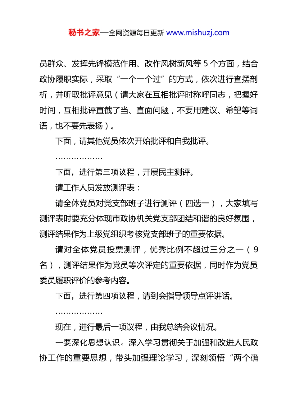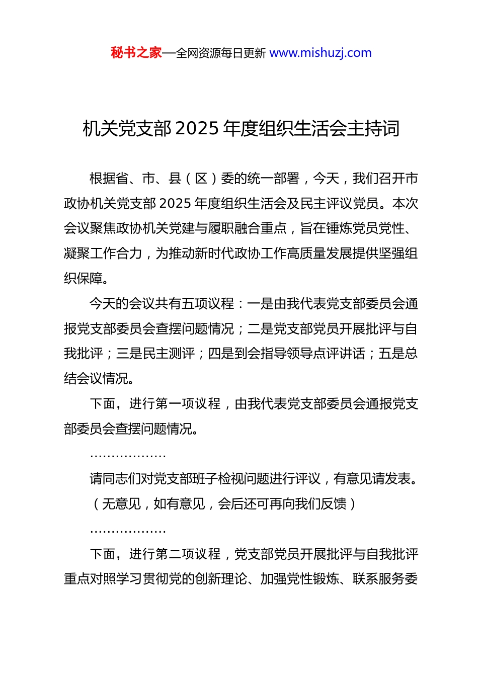 秘书之家—全网资源每日更新 www.mishuzj.com机关党支部 2025 年度组织生活会主持词根据省、市、县(区)委的统一部署,今天,我们召开市政协机关党支部 2025 年度组织生活会及民主评议党员。本次会议聚焦政协机关党建与履职融合重点,旨在锤炼党员党性、凝聚工作合力,为推动新时代政协工作高质量发展提供坚强组织保障。今天的会议共有五项议程:一是由我代表党支部委员会通报党支部委员会查摆问题情况;二是党支部党员开展批评与自我批评;三是民主测评;四是到会指导领导点评讲话;五是总结会议情况。下面,进行第一项议程,由我代表党支部委员会通报党支部委员会查摆问题情况。………………请同志们对党支部班子检视问题进行评议,有意见请发表。(无意见,如有意见,会后还可再向我们反馈)………………下面,进行第二项议程,党支部党员开展批评与自我批评重点对照学习贯彻党的创新理论、加强党性锻炼、联系服务委秘书之家—全网资源每日更新 www.mishuzj.com员群众、发挥先锋模范作用、改作风树新风等 5 个方面,结合政协履职实际,采取“一个一个过”的方式,依次进行查摆剖析,并听取批评意见(请大家在互相批评时称呼同志,把握好时间,互相批评直截了当、直面问题,不要用建议、希望等词语,也不要先表扬)。下面,请其他党员依次开始批评和自我批评。………………下面,进行第三项议程,开展民主测评。请工作人员发放测评表:请全体党员对党支部班子进行测评(四选一),大家填写测评表时要充分体现市政协机关党支部团结和谐的良好氛围,测评结果作为上级党组织考核党支部班子的重要依据。请对全体党员投票测评,优秀比例不超过三分之一( 9名),测评结果作为党员等次评定的重要依据,同时作为党员委员履职评价的参考内容。下面,进行第四项议程,请到会指导领导点评讲话。………………现在,进行最后一项议程,由我总结会议情况。一要深化思想认识。深入学习贯彻关于加强和改进人民政协工作的重要思想,带头加强理论学习,深刻领悟“两个确秘书之家—全网资源每日更新 www.mishuzj.com立”的决定性意义,增强“四个意识”、坚定“四个自信”、做到“两个维护”,切实把思想和行动统一到党中央及省、市、县(区)各级党委部署要求上来。二要抓好整改落实。要针对会上批评和自我批评意见,一体制定整改清单,支委会要制定整改措施,党员要作出整改承诺,整改措施和整改承诺在一定范围内公示。同时,要坚持“当下改”与“长久立”相结合,一手抓好整改,一手完善机制,结合政协机关职能特点,健全党员联系委员、服务群众工作机制,以实际成效检验整改成果,切实把整改成效转化为履职实效。三要提升工作水平。党支部和全体党员要进一步解放思想、开拓思路,强化做好新时代政协机关党建工作的责任担当,坚持党建与政协履职深度融合,在健全机制上求创新,在强化举措上想办法,在狠抓落实上下功夫,及时找差距、补短板,努力创特色、争一流,不断提高新形势下政协机关党建工作的科学化水平,切实发挥党支部战斗堡垒作用和党员先锋模范作用,为政协履行政治协商、民主监督、参政议政职能提供有力保障。同志们,今天的组织生活会就开到这里,散会!