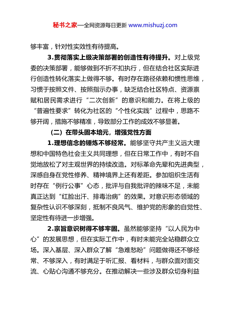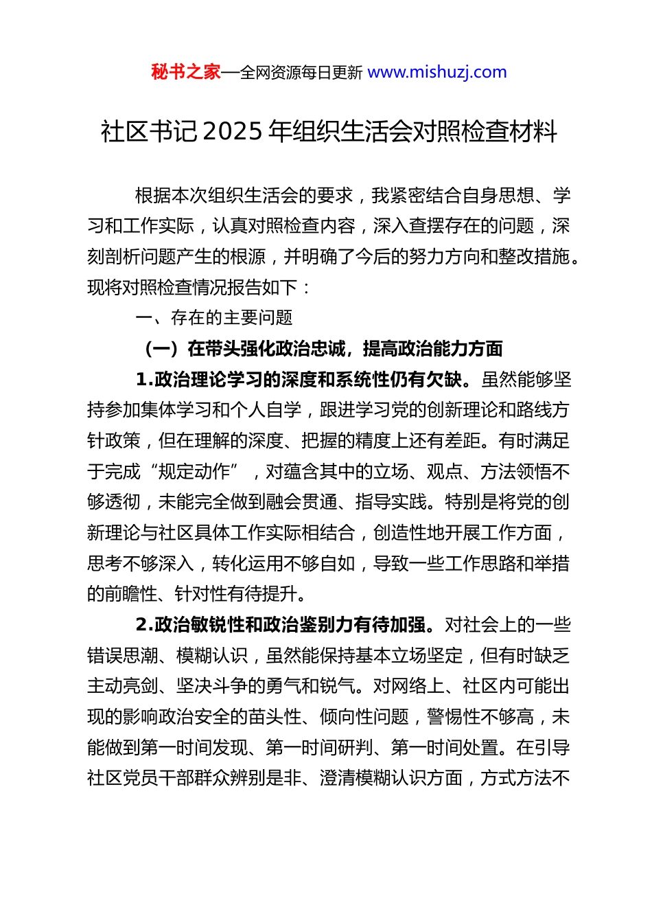 秘书之家—全网资源每日更新 www.mishuzj.com社区书记 2025 年组织生活会对照检查材料根据本次组织生活会的要求,我紧密结合自身思想、学习和工作实际,认真对照检查内容,深入查摆存在的问题,深刻剖析问题产生的根源,并明确了今后的努力方向和整改措施。现将对照检查情况报告如下:一、存在的主要问题(一)在带头强化政治忠诚,提高政治能力方面1.政治理论学习的深度和系统性仍有欠缺。虽然能够坚持参加集体学习和个人自学,跟进学习党的创新理论和路线方针政策,但在理解的深度、把握的精度上还有差距。有时满足于完成“规定动作”,对蕴含其中的立场、观点、方法领悟不够透彻,未能完全做到融会贯通、指导实践。特别是将党的创新理论与社区具体工作实际相结合,创造性地开展工作方面,思考不够深入,转化运用不够自如,导致一些工作思路和举措的前瞻性、针对性有待提升。2.政治敏锐性和政治鉴别力有待加强。对社会上的一些错误思潮、模糊认识,虽然能保持基本立场坚定,但有时缺乏主动亮剑、坚决斗争的勇气和锐气。对网络上、社区内可能出现的影响政治安全的苗头性、倾向性问题,警惕性不够高,未能做到第一时间发现、第一时间研判、第一时间处置。在引导社区党员干部群众辨别是非、澄清模糊认识方面,方式方法不秘书之家—全网资源每日更新 www.mishuzj.com够丰富,针对性实效性有待提高。3.贯彻落实上级决策部署的创造性有待提升。对上级党委的决策部署,能够做到不折不扣执行,但在结合社区实际进行创造性转化落实上做得不够。有时存在路径依赖和惯性思维,习惯于按照文件、按照指示办事,缺乏结合社区特点、资源禀赋和居民需求进行“二次创新”的意识和能力。在将上级的“普遍性要求”转化为社区的“个性化实践”过程中,思路不够开阔,措施不够精准,导致部分工作的成效不够显著。(二)在带头固本培元,增强党性方面1.理想信念的锤炼不够经常。能够坚守共产主义远大理想和中国特色社会主义共同理想,但在日常工作中,有时不自觉地放松了对主观世界的持续改造。对标革命先辈和先进典型,深感自身在党性修养、精神境界上还有差距。参加组织生活有时存在“例行公事”心态,批评与自我批评的辣味不足,未能真正达到“红脸出汗、排毒治病”的效果。对意识形态领域的复杂性认识不够深刻,抵制不良风气、维护党的形象的自觉性、坚定性有待进一步增强。2.宗旨意识树得不够牢固。虽然能够坚持“以人民为中心”的发展思想,但在实际工作中,有时未能完全站稳群众立场。深入基层、深入群众了解“急难愁盼”问题做得还不够经常、不够深入,有时满足于听汇报、看材料,与群众面对面交流、心贴心沟通不够充分。在推动解决一些涉及群众切身利益秘书之家—全网资源每日更新 www.mishuzj.com的难点、痛点问题时,有时存在畏难情绪,缺乏一抓到底、不见成效不罢休的韧劲。3.自我革命精神有所弱化。对自身存在的问题和不足,有时缺乏深刻反思和彻底整改的勇气。习惯于看到成绩,对缺点和错误有时轻描淡写,甚至存在“护短”心理。接受他人批评时,有时内心不够坦然,甚至产生抵触情绪。在严格执行党的组织生活制度、自觉接受党员和群众监督方面,标准还不够高,做得还不够到位。(三)在带头敬畏人民、敬畏组织、敬畏法纪方面1.敬畏人民的意识需进一步强化。虽然深知权力来自人民,必须服务人民,但在实际工作中,有时未能完全做到“民有所呼、我有所应”。对居民反映的一些诉求和意见,未能做到及时回应、有效解决。在做决策、定规划时,征求居民意见的广度和深度有时不够,未能充分体现最广大人民群众的意愿。服务群众的方式有时比较简单,缺乏精细化、精准化的举措,距离群众的期待还有差距。2.敬畏组织的观念需进一步深化。能够自觉维护组织权威,服从组织安排,但在严格执行个人服从组织、少数服从多数的原则方面,有时存在变通现象。对组织的决议,有时在理解不够透彻的情况下就机械执行,或者在执行过程中遇到困难时,未能及时、如实地向组织反映。在向组织请示报告制度执行上,有时存在不够及时、不够全面的问题。秘书之家—全网资源每日更新 www.mishuzj.com3.敬畏法纪的自...