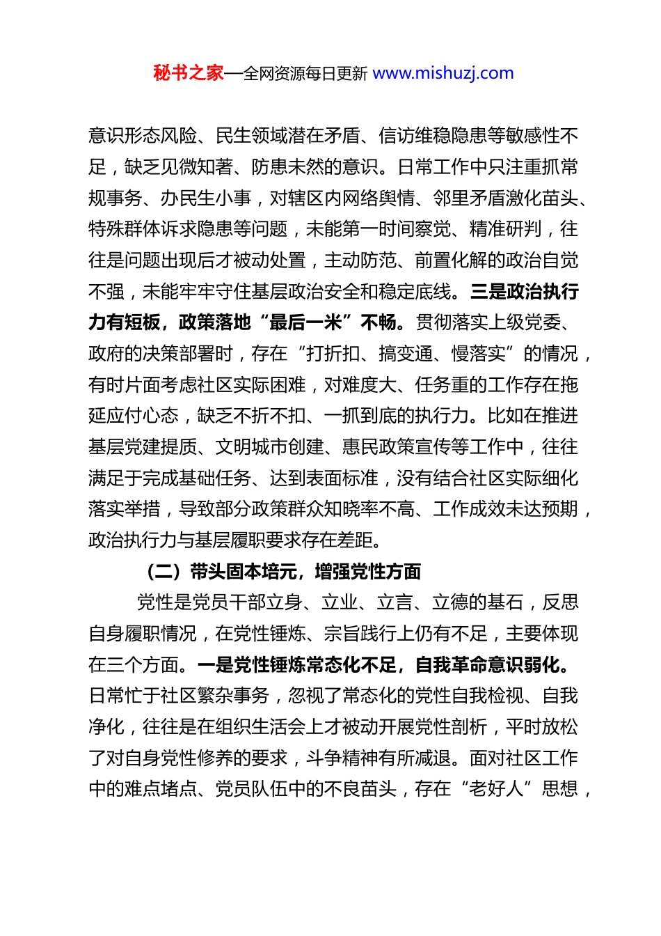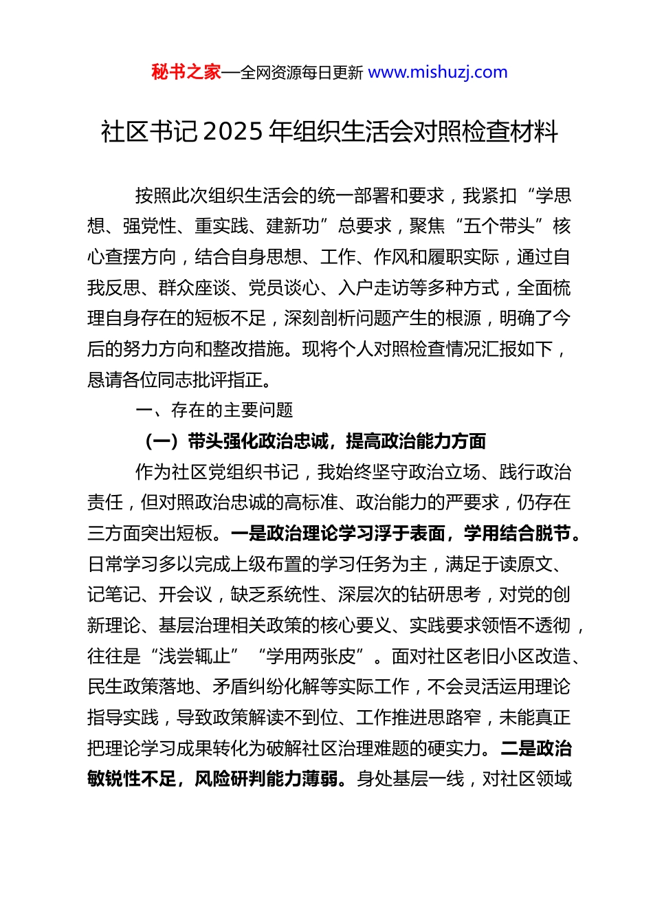 秘书之家—全网资源每日更新 www.mishuzj.com社区书记 2025 年组织生活会对照检查材料按照此次组织生活会的统一部署和要求,我紧扣“学思想、强党性、重实践、建新功”总要求,聚焦“五个带头”核心查摆方向,结合自身思想、工作、作风和履职实际,通过自我反思、群众座谈、党员谈心、入户走访等多种方式,全面梳理自身存在的短板不足,深刻剖析问题产生的根源,明确了今后的努力方向和整改措施。现将个人对照检查情况汇报如下,恳请各位同志批评指正。一、存在的主要问题(一)带头强化政治忠诚,提高政治能力方面作为社区党组织书记,我始终坚守政治立场、践行政治责任,但对照政治忠诚的高标准、政治能力的严要求,仍存在三方面突出短板。一是政治理论学习浮于表面,学用结合脱节。日常学习多以完成上级布置的学习任务为主,满足于读原文、记笔记、开会议,缺乏系统性、深层次的钻研思考,对党的创新理论、基层治理相关政策的核心要义、实践要求领悟不透彻,往往是“浅尝辄止”“学用两张皮”。面对社区老旧小区改造、民生政策落地、矛盾纠纷化解等实际工作,不会灵活运用理论指导实践,导致政策解读不到位、工作推进思路窄,未能真正把理论学习成果转化为破解社区治理难题的硬实力。二是政治敏锐性不足,风险研判能力薄弱。身处基层一线,对社区领域秘书之家—全网资源每日更新 www.mishuzj.com意识形态风险、民生领域潜在矛盾、信访维稳隐患等敏感性不足,缺乏见微知著、防患未然的意识。日常工作中只注重抓常规事务、办民生小事,对辖区内网络舆情、邻里矛盾激化苗头、特殊群体诉求隐患等问题,未能第一时间察觉、精准研判,往往是问题出现后才被动处置,主动防范、前置化解的政治自觉不强,未能牢牢守住基层政治安全和稳定底线。三是政治执行力有短板,政策落地“最后一米”不畅。贯彻落实上级党委、政府的决策部署时,存在“打折扣、搞变通、慢落实”的情况,有时片面考虑社区实际困难,对难度大、任务重的工作存在拖延应付心态,缺乏不折不扣、一抓到底的执行力。比如在推进基层党建提质、文明城市创建、惠民政策宣传等工作中,往往满足于完成基础任务、达到表面标准,没有结合社区实际细化落实举措,导致部分政策群众知晓率不高、工作成效未达预期,政治执行力与基层履职要求存在差距。(二)带头固本培元,增强党性方面党性是党员干部立身、立业、立言、立德的基石,反思自身履职情况,在党性锤炼、宗旨践行上仍有不足,主要体现在三个方面。一是党性锤炼常态化不足,自我革命意识弱化。日常忙于社区繁杂事务,忽视了常态化的党性自我检视、自我净化,往往是在组织生活会上才被动开展党性剖析,平时放松了对自身党性修养的要求,斗争精神有所减退。面对社区工作中的难点堵点、党员队伍中的不良苗头,存在“老好人”思想,秘书之家—全网资源每日更新 www.mishuzj.com不愿较真碰硬、不敢直面问题,自我革命、刀刃向内的勇气不足,党性修养未能与时俱进、持续提升。二是宗旨意识树得不牢,群众立场有偏差。践行以人民为中心的发展思想不够彻底,工作中存在“重上级部署、轻群众需求”的倾向,主动深入群众、倾听民声民意的频次不足,大多是群众找上门才解决问题,主动上门走访、精准服务群众的自觉性不够。对辖区独居老人、困难家庭、残障人士等特殊群体的实际困难掌握不全面,帮扶举措流于形式,未能真正站在群众角度想问题、办事情,全心全意为人民服务的宗旨意识有所淡化。三是党内政治生活不严肃,批评与自我批评流于形式。落实“三会一课”、组织生活会、民主评议党员等制度不够严格,组织生活形式单一、内容枯燥,缺乏政治性、时代性、原则性。开展批评与自我批评时,存在避重就轻、相互客套的情况,自我批评多谈工作不足、少谈思想根源,相互批评多提希望建议、少点实质问题,未能通过严肃的党内政治生活锤炼党性、凝聚合力,党内政治生活的“熔炉”作用未能充分发挥。(三)带头敬畏人民、敬畏组织、敬畏法纪方面作为基层党组织负责人,手握小微权力,肩负服务群众、落实政策的重任,但在敬畏之心、纪律规矩意识上仍有欠缺,存在三方面问题。一是敬畏群众意...