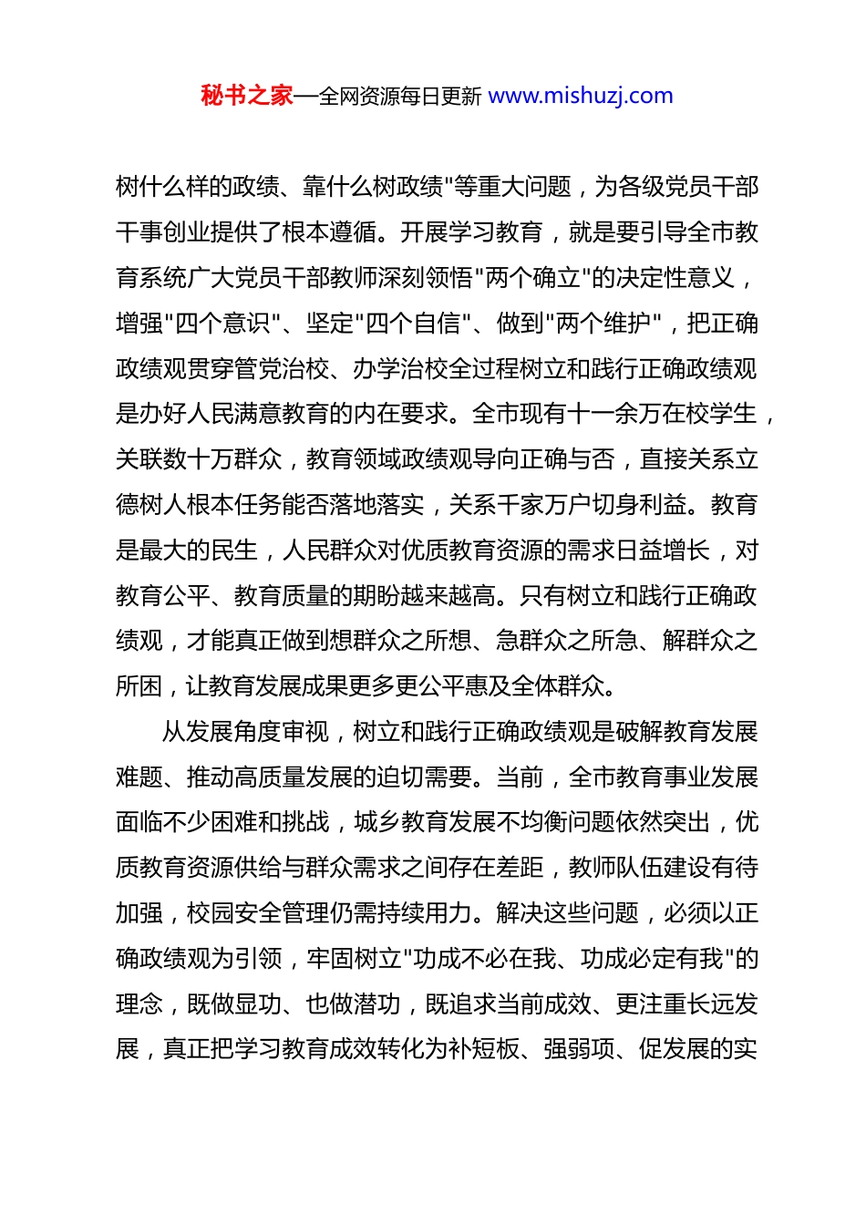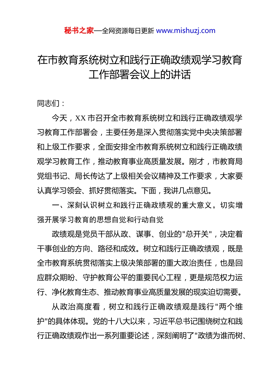 秘书之家—全网资源每日更新 www.mishuzj.com在市教育系统树立和践行正确政绩观学习教育工作部署会议上的讲话 同志们:今天,XX 市召开全市教育系统树立和践行正确政绩观学习教育工作部署会,主要任务是深入贯彻落实党中央决策部署和上级工作要求,全面安排全市教育系统树立和践行正确政绩观学习教育工作,推动教育事业高质量发展。刚才,市教育局党组书记、局长传达了上级相关会议精神及工作要求,大家要认真学习领会、抓好贯彻落实。下面,我讲几点意见。一、深刻认识树立和践行正确政绩观的重大意义,切实增强开展学习教育的思想自觉和行动自觉政绩观是党员干部从政、谋事、创业的"总开关",决定着干事创业的方向、路径和成效。树立和践行正确政绩观,既是全市教育系统贯彻落实上级决策部署的重大政治责任,也是回应群众期盼、守护教育公平的重要民心工程,更是规范权力运行、净化教育生态、推动教育事业高质量发展的现实迫切需要。从政治高度看,树立和践行正确政绩观是践行"两个维护"的具体体现。党的十八大以来,习近平总书记围绕树立和践行正确政绩观作出一系列重要论述,深刻阐明了"政绩为谁而树、秘书之家—全网资源每日更新 www.mishuzj.com树什么样的政绩、靠什么树政绩"等重大问题,为各级党员干部干事创业提供了根本遵循。开展学习教育,就是要引导全市教育系统广大党员干部教师深刻领悟"两个确立"的决定性意义,增强"四个意识"、坚定"四个自信"、做到"两个维护",把正确政绩观贯穿管党治校、办学治校全过程树立和践行正确政绩观是办好人民满意教育的内在要求。全市现有十一余万在校学生,关联数十万群众,教育领域政绩观导向正确与否,直接关系立德树人根本任务能否落地落实,关系千家万户切身利益。教育是最大的民生,人民群众对优质教育资源的需求日益增长,对教育公平、教育质量的期盼越来越高。只有树立和践行正确政绩观,才能真正做到想群众之所想、急群众之所急、解群众之所困,让教育发展成果更多更公平惠及全体群众。从发展角度审视,树立和践行正确政绩观是破解教育发展难题、推动高质量发展的迫切需要。当前,全市教育事业发展面临不少困难和挑战,城乡教育发展不均衡问题依然突出,优质教育资源供给与群众需求之间存在差距,教师队伍建设有待加强,校园安全管理仍需持续用力。解决这些问题,必须以正确政绩观为引领,牢固树立"功成不必在我、功成必定有我"的理念,既做显功、也做潜功,既追求当前成效、更注重长远发展,真正把学习教育成效转化为补短板、强弱项、促发展的实秘书之家—全网资源每日更新 www.mishuzj.com际行动。从治理维度考量,树立和践行正确政绩观是净化教育生态、推进全面从严治党的重要抓手。教育系统涉及项目多、资金量大、社会关注度高,廉洁风险不容忽视。近年来查处的教育系统违纪违法案件表明,个别党员干部政绩观出现偏差,在项目审批、物资采购、招生招考等方面存在违规违纪问题,损害了教育形象和群众利益。开展学习教育,就是要引导广大党员干部从思想根源上纠治政绩观偏差,筑牢拒腐防变的思想防线,营造风清气正的教育生态。二、准确把握学习教育的目标要求和基本原则,确保学习教育正确方向开展树立和践行正确政绩观学习教育,必须明确目标任务、把握关键重点、掌握方法路径,确保学习教育不偏向、不变通、不走样。要把"学思想、强党性、重实践、建新功"作为学习教育的主线贯穿始终。深入学习习近平新时代中国特色社会主义思想,特别是习近平总书记关于树立和践行正确政绩观的重要论述,深刻理解其核心要义、精神实质、丰富内涵和实践要求,切实把学习成果转化为坚定理想、锤炼党性、指导实践、推动工作的强大力量。秘书之家—全网资源每日更新 www.mishuzj.com要把"解民忧、纾民困、暖民心"作为检验学习教育成效的重要标准。始终坚持以人民为中心的发展思想,把群众满意不满意作为衡量政绩的根本标准,着力解决人民群众急难愁盼的教育问题。聚焦城乡教育均衡发展,持续优化教育资源配置;聚焦校园安全,坚决守住学生生命健康底线;聚焦食品安全,确保师生吃得放心、吃得安心;聚焦教育收费,规范各类收费行为,切...