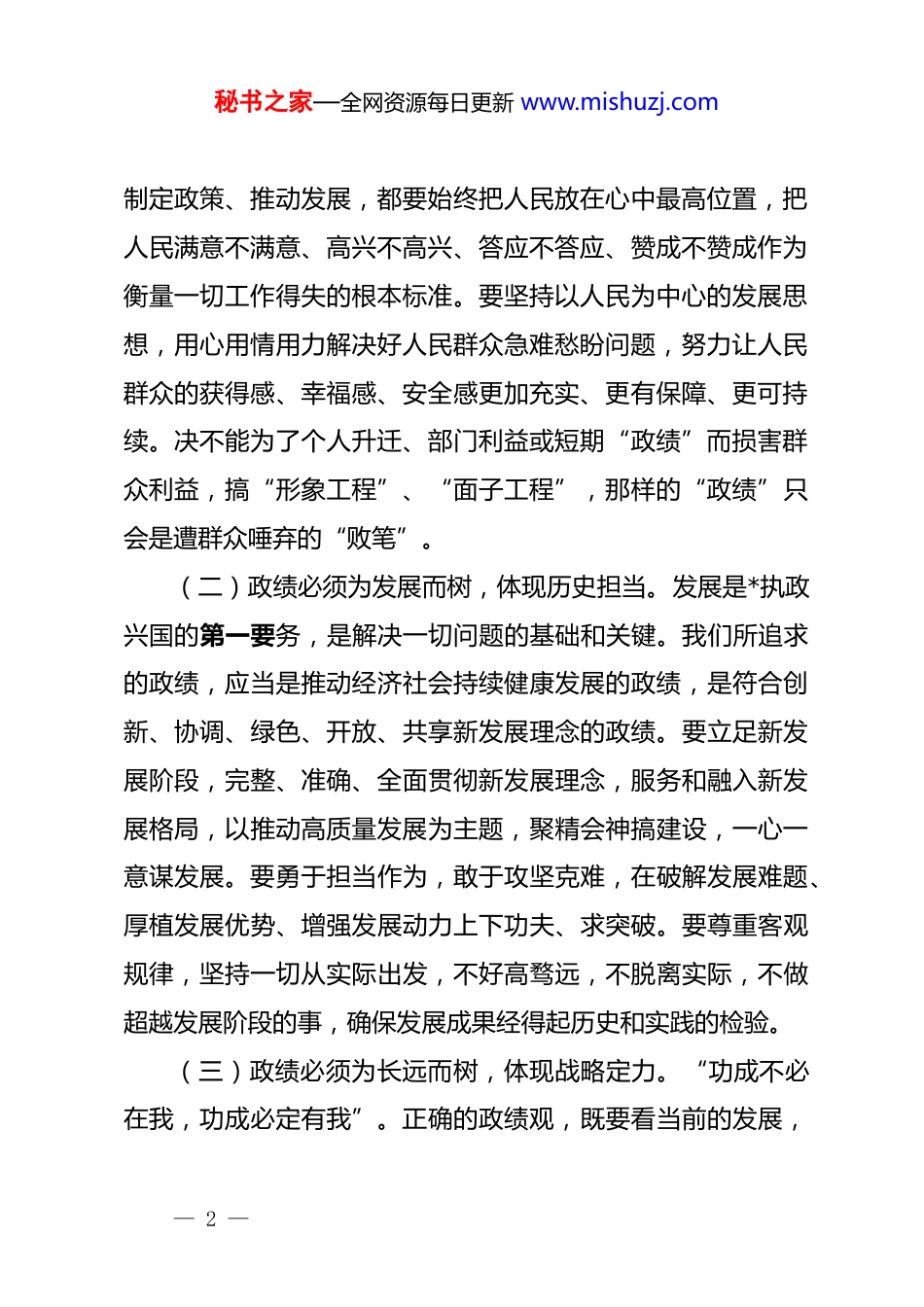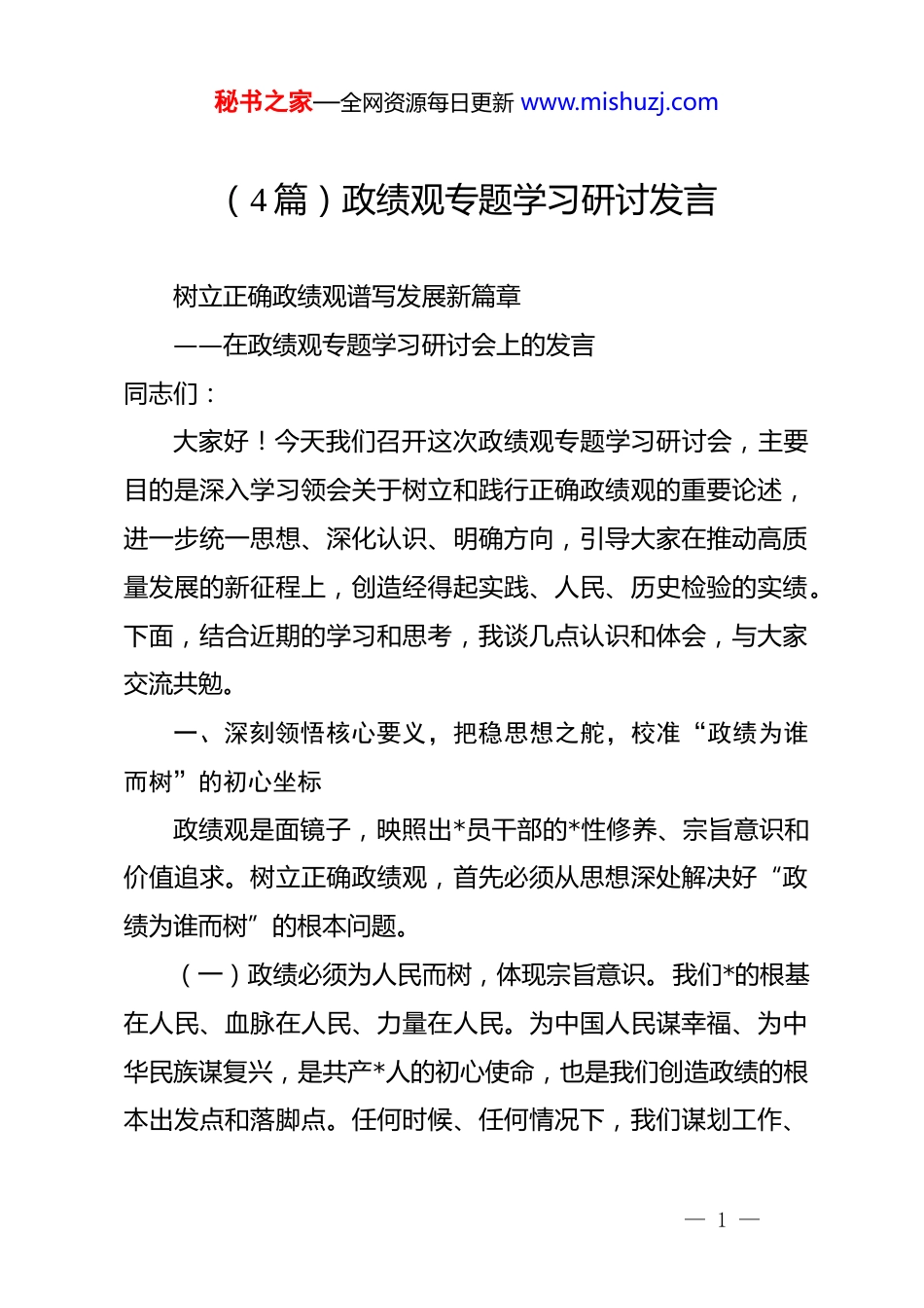 秘书之家—全网资源每日更新 www.mishuzj.com(4 篇)政绩观专题学习研讨发言树立正确政绩观谱写发展新篇章——在政绩观专题学习研讨会上的发言同志们:大家好!今天我们召开这次政绩观专题学习研讨会,主要目的是深入学习领会关于树立和践行正确政绩观的重要论述,进一步统一思想、深化认识、明确方向,引导大家在推动高质量发展的新征程上,创造经得起实践、人民、历史检验的实绩。下面,结合近期的学习和思考,我谈几点认识和体会,与大家交流共勉。一、深刻领悟核心要义,把稳思想之舵,校准“政绩为谁而树”的初心坐标政绩观是面镜子,映照出*员干部的*性修养、宗旨意识和价值追求。树立正确政绩观,首先必须从思想深处解决好“政绩为谁而树”的根本问题。(一)政绩必须为人民而树,体现宗旨意识。我们*的根基在人民、血脉在人民、力量在人民。为中国人民谋幸福、为中华民族谋复兴,是共产*人的初心使命,也是我们创造政绩的根本出发点和落脚点。任何时候、任何情况下,我们谋划工作、— 1 —秘书之家—全网资源每日更新 www.mishuzj.com制定政策、推动发展,都要始终把人民放在心中最高位置,把人民满意不满意、高兴不高兴、答应不答应、赞成不赞成作为衡量一切工作得失的根本标准。要坚持以人民为中心的发展思想,用心用情用力解决好人民群众急难愁盼问题,努力让人民群众的获得感、幸福感、安全感更加充实、更有保障、更可持续。决不能为了个人升迁、部门利益或短期“政绩”而损害群众利益,搞“形象工程”、“面子工程”,那样的“政绩”只会是遭群众唾弃的“败笔”。(二)政绩必须为发展而树,体现历史担当。发展是*执政兴国的第一要务,是解决一切问题的基础和关键。我们所追求的政绩,应当是推动经济社会持续健康发展的政绩,是符合创新、协调、绿色、开放、共享新发展理念的政绩。要立足新发展阶段,完整、准确、全面贯彻新发展理念,服务和融入新发展格局,以推动高质量发展为主题,聚精会神搞建设,一心一意谋发展。要勇于担当作为,敢于攻坚克难,在破解发展难题、厚植发展优势、增强发展动力上下功夫、求突破。要尊重客观规律,坚持一切从实际出发,不好高骛远,不脱离实际,不做超越发展阶段的事,确保发展成果经得起历史和实践的检验。(三)政绩必须为长远而树,体现战略定力。“功成不必在我,功成必定有我”。正确的政绩观,既要看当前的发展,— 2 —秘书之家—全网资源每日更新 www.mishuzj.com更要看发展的可持续性;既要看显性的成绩,更要看潜在的基础。要处理好当前与长远、显绩与潜绩的关系,既要做让老百姓看得见、摸得着、得实惠的实事,也要做为后人作铺垫、打基础、利长远的好事。要有“抓铁有痕、踏石留印”的韧劲和“一茬接着一茬干”的恒心,对于认准的正确方向、确定的奋斗目标,要一张蓝图绘到底,久久为功,决不能为了追求短期效应而急功近利、竭泽而渔,甚至搞“击鼓传花”式的花架子。二、精准把握实践要求,校准偏差之锚,明晰“树什么样的政绩”的内涵标准在解决了“为谁树”的问题后,必须进一步明确“树什么样的政绩”。新时代新征程,对我们创造政绩的内涵和标准提出了新的更高要求。(一)要追求高质量发展的政绩,摒弃“速度崇拜”的旧思维。高质量发展是体现新发展理念的发展,是能够很好满足人民日益增长的美好生活需要的发展。我们要的政绩,必须是创新成为第一动力、协调成为内生特点、绿色成为普遍形态、开放成为必由之路、共享成为根本目的的发展实绩。要坚决摆脱“速度情结”和“路径依赖”,不再简单以 gdp 增长论英雄,更加注重发展的质量和效益,更加注重经济结构的优化升级,更加注重资源节约和环境保护,更加注重创新驱动和民生改善。— 3 —秘书之家—全网资源每日更新 www.mishuzj.com要敢于为质量而牺牲一些不必要的发展速度,为长远而舍弃一些短期的利益诱惑。(二)要追求惠民利民的政绩,杜绝“数据造假”的花架子。民生是最大的政治。我们的政绩最终要体现在人民生活水平的改善上,体现在社会公平正义的维护上,体现在人的全面发展上。要深入基层、深入群众,倾听民声、了解民意、汇聚民智,把...