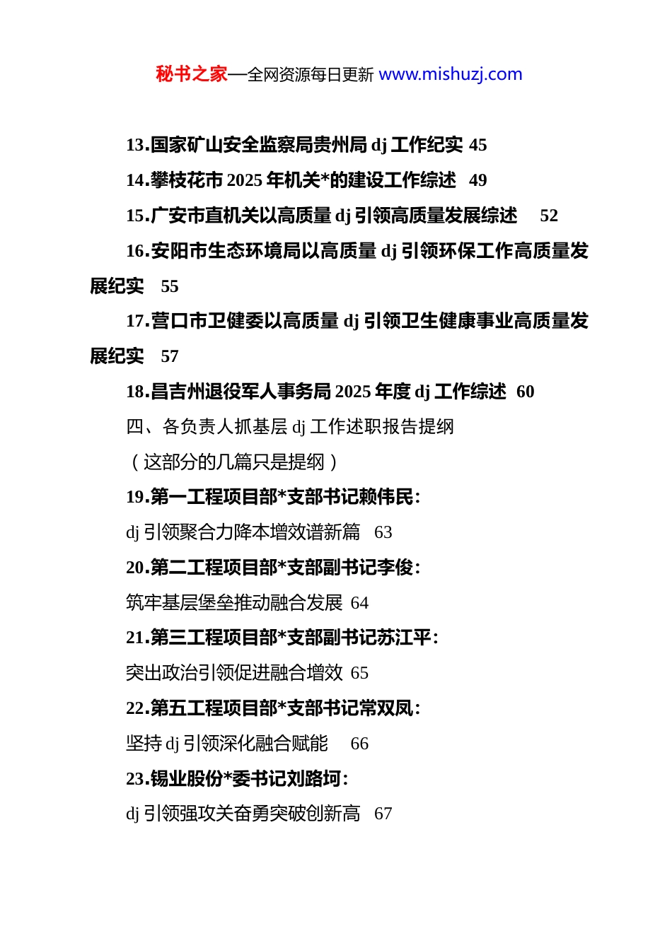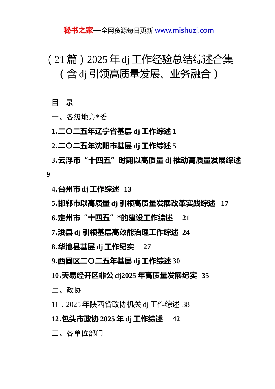 秘书之家—全网资源每日更新 www.mishuzj.com(21 篇)2025 年 dj 工作经验总结综述合集(含 dj 引领高质量发展、业务融合)目录一、各级地方*委1.二〇二五年辽宁省基层 dj 工作综述 12.二〇二五年沈阳市基层 dj 工作综述 53.云浮市“十四五”时期以高质量 dj 推动高质量发展综述94.台州市 dj 工作综述 135.邯郸市以高质量 dj 引领高质量发展改革实践综述 176.定州市“十四五”*的建设工作综述217.浚县 dj 引领基层高效能治理工作综述 248.华池县基层 dj 工作纪实279.西固区二〇二五年基层 dj 工作综述 3010.天易经开区非公 dj2025 年高质量发展纪实 35二、政协11.2025 年陕西省政协机关 dj 工作综述 3812.包头市政协 2025 年 dj 工作综述42三、各单位部门秘书之家—全网资源每日更新 www.mishuzj.com13.国家矿山安全监察局贵州局 dj 工作纪实 4514.攀枝花市 2025 年机关*的建设工作综述 4915.广安市直机关以高质量 dj 引领高质量发展综述5216.安阳市生态环境局以高质量 dj 引领环保工作高质量发展纪实5517.营口市卫健委以高质量 dj 引领卫生健康事业高质量发展纪实5718.昌吉州退役军人事务局 2025 年度 dj 工作综述 60四、各负责人抓基层 dj 工作述职报告提纲(这部分的几篇只是提纲)19.第一工程项目部*支部书记赖伟民:dj 引领聚合力降本增效谱新篇 6320.第二工程项目部*支部副书记李俊:筑牢基层堡垒推动融合发展 6421.第三工程项目部*支部副书记苏江平:突出政治引领促进融合增效 6522.第五工程项目部*支部书记常双凤:坚持 dj 引领深化融合赋能6623.锡业股份*委书记刘路坷:dj 引领强攻关奋勇突破创新高 67秘书之家—全网资源每日更新 www.mishuzj.com24.新材料公司*委书记吴建勋:dj 引领促发展凝心聚力谱新篇 6825.物流公司*委书记李劲松:dj 铸链深融合协同发展创一流 6926.锡都实业公司*委书记李师勇:强化引领锚方向夯实根基激效能7027.云南锡铟实验室*委书记彭巨擘:擘画蓝图逐“新”而因地制宜发展锡铟新质生产力7128.控股公司总部*委书记刘彬:夯基础提质效为推动云锡高质量发展贡献总部力量7229.云锡职业技术学院*委书记俞鑫:dj 领航凝众志笃行实干育工匠 73五、企业30.中国邮政“十四五”加强*的建设新成效综述 7431.华翔集团 dj 引领基业长青纪实 8232.恩施市自来水公司 dj 业务融合发展纪实 88二〇二五年辽宁省基层 dj 工作综述(2026 年 1 月 3 日)全年培训*员超过 300 万人次、带动村集体和村民增收 7.1亿元、解决群众诉求 13.1 万件、规范快递行业全日制职工劳动秘书之家—全网资源每日更新 www.mishuzj.com合同 4.4 万份……数字,见证了一年来全省基层*组织全面进步、全面过硬的推进步伐。基层*组织是*执政大厦的地基,地基固则大厦坚。打基础、固基本,补短板、强弱项。2025 年,全省各级*组织深入贯彻落实******关于*的建设的重要思想、关于*的自我革命的重要思想,特别是******对辽宁振兴发展的重要讲话和****精神,坚持大抓基层鲜明导向,*组织政治功能和组织功能持续增强,为奋力谱写中国式现代化辽宁篇章提供了坚强组织保证。一、筑牢信仰之基永葆本色政治引领,凝心铸魂。一年来,我省始终把坚定拥护“两个确立”、坚决做到“两个维护”作为最高政治原则和根本政治责任,引导*员干部听*话、跟*走,切实激扬事业发展的先锋力量。深化*的创新理论武装,我省坚持把学习贯彻**************思想作为首要政治任务,深入学习贯彻*的二十大和二十届历次全会精神,原原本本学、逐字逐句悟,用*的创新理论统一思想、统一意志、统一行动。“必须始终把中央⑧项规定作为长期有效的铁规矩、硬杠杠!”以如此鲜明的态度,全省 15.6 万个*组织、320.7 万名*秘书之家—全网资源每日更新 www.mishuzj.com员积极参加深入贯彻中央⑧项规定精神学习教育。广大*员在深化理论学习中筑牢作风建设思想根基,在靶向查摆整治中扫清作风积弊,在为民办实事中彰显担当作为。在朝阳北票市台吉镇东台吉村,一所由旧学校改造的乡镇*校,被村里的*员称为“红色充电站”。...