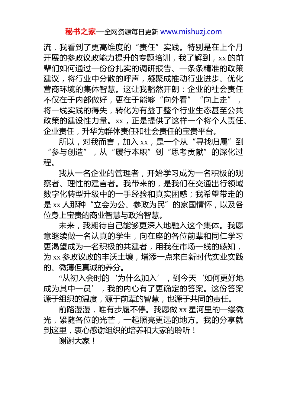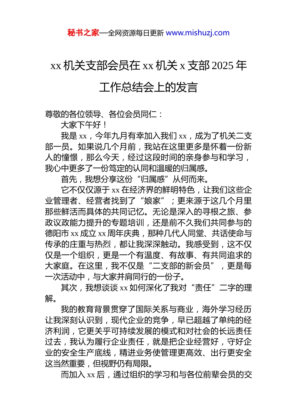 秘书之家—全网资源每日更新 www.mishuzj.comxx 机关支部会员在 xx 机关 x 支部 2025 年工作总结会上的发言尊敬的各位领导、各位会员同仁:大家下午好!我是 xx,今年九月有幸加入我们 xx,成为了机关二支部一员。如果说几个月前,我站在这里更多是怀着一份新人的憧憬,那么今天,经过这段时间的亲身参与和学习,我心中更多了一份笃定的认同和温暖的归属感。首先,我想分享这份“归属感”从何而来。它不仅仅源于 xx 在经济界的鲜明特色,让我们这些企业管理者、经营者找到了“娘家”;更来源于这几个月里那些鲜活而具体的共同记忆。无论是深入的寻根之旅、参政议政能力提升的专题培训,还是前不久我们共同参与的德阳市 xx 成立 xx 周年庆典,那种几代人同堂、共话使命与传承的庄重与热烈,都让我深深触动。我感受到,这不仅仅是一个组织,更是一个有温度、有故事、有共同追求的大家庭。在这里,我不仅是“二支部的新会员”,更是每一次活动中,与大家并肩同行的一份子。其次,我想谈谈 xx 如何深化了我对“责任”二字的理解。我的教育背景贯穿了国际关系与商业,海外学习经历让我深刻认识到,现代企业的竞争,早已超越了单纯的经济利润,它更关乎可持续发展的模式和对社会的长远责任过去,我认为履行企业责任,就是把企业经营好,守好企业的安全生产底线,精进业务使管理更高效、出行更安全这当然重要,但视野仍有局限。而加入 xx 后,通过组织的学习和与各位前辈会员的交秘书之家—全网资源每日更新 www.mishuzj.com流,我看到了更高维度的“责任”实践。特别是在上个月开展的参政议政能力提升的专题培训,我了解到,xx 的前辈们如何通过一份份扎实的调研报告、一条条精准的政策建议,将行业中分散的呼声,凝聚成推动行业进步、优化营商环境的集体智慧。这让我豁然开朗:企业的社会责任不仅在于内部做好,更在于能够“向外看”“向上走”,将一线实践的得失,转化为有益于整个行业生态甚至公共政策的建设性力量。xx,正是提供了这样一个将个人责任、企业责任,升华为群体责任和社会责任的宝贵平台。所以,对我而言,加入 xx,是一个从“寻找归属”到“参与创造”,从“履行本职”到“思考贡献”的深化过程。我从一名企业的管理者,开始学习成为一名积极的观察者、理性的建言者。我带来的,是我们在交通出行领域数字化转型升级中的一手经验和真实困惑;我希望带走的是 xx 人那种“立会为公、参政为民”的家国情怀,以及各位身上宝贵的商业智慧与政治智慧。未来,我期待自己能够更深入地融入这个集体。我愿意继续做一名认真的学生,向在座的各位前辈和同仁学习更渴望成为一名积极的共建者,用我在市场一线的感知,为 xx 参政议政的丰沃土壤,增添一点来自新时代实业实践的、微薄但真诚的养分。“从初入会时的‘为什么加入’,到今天‘如何更好地成为其中一员’,我的内心有了更确定的答案。这份答案源于组织的温度,源于前辈的智慧,也源于共同的责任。前路漫漫,唯有步履不停。我愿做 xx 星河里的一缕微光,紧随各位的光芒,一起照亮更远的地方。我的分享就到这里,衷心感谢组织的培养和大家的聆听!谢谢大家!
