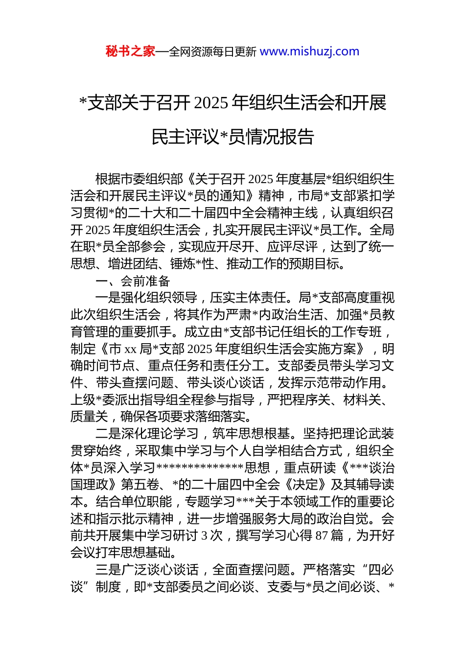 秘书之家—全网资源每日更新 www.mishuzj.com*支部关于召开 2025 年组织生活会和开展民主评议*员情况报告根据市委组织部《关于召开 2025 年度基层*组织组织生活会和开展民主评议*员的通知》精神,市局*支部紧扣学习贯彻*的二十大和二十届四中全会精神主线,认真组织召开 2025 年度组织生活会,扎实开展民主评议*员工作。全局在职*员全部参会,实现应开尽开、应评尽评,达到了统一思想、增进团结、锤炼*性、推动工作的预期目标。一、会前准备一是强化组织领导,压实主体责任。局*支部高度重视此次组织生活会,将其作为严肃*内政治生活、加强*员教育管理的重要抓手。成立由*支部书记任组长的工作专班,制定《市 xx 局*支部 2025 年度组织生活会实施方案》,明确时间节点、重点任务和责任分工。支部委员带头学习文件、带头查摆问题、带头谈心谈话,发挥示范带动作用。上级*委派出指导组全程参与指导,严把程序关、材料关、质量关,确保各项要求落细落实。二是深化理论学习,筑牢思想根基。坚持把理论武装贯穿始终,采取集中学习与个人自学相结合方式,组织全体*员深入学习**************思想,重点研读《***谈治国理政》第五卷、*的二十届四中全会《决定》及其辅导读本。结合单位职能,专题学习***关于本领域工作的重要论述和指示批示精神,进一步增强服务大局的政治自觉。会前共开展集中学习研讨 3 次,撰写学习心得 87 篇,为开好会议打牢思想基础。三是广泛谈心谈话,全面查摆问题。严格落实“四必谈”制度,即*支部委员之间必谈、支委与*员之间必谈、*秘书之家—全网资源每日更新 www.mishuzj.com员与*员之间必谈、流动*员由专人联系谈。开展谈心谈话,既交流思想、沟通工作,又相互提醒、指出不足,真正把问题谈开、把思想谈通、把意见谈实。在此基础上,*支部委员会聚焦五个方面对照检查内容——学习贯彻*的创新理论是否系统深入、加强*性锻炼是否常态长效、联系服务群众是否精准有效、发挥先锋模范作用是否有为有位、改作风树新风是否持续用力,全面检视在政治功能发挥、组织力提升等方面的短板;全体*员对照合格*员标准,深入查找自身在政治、思想、学习、工作、能力、纪律、作风等方面的差距,撰写个人发言提纲 87 份,做到见人见事见思想。四是严格材料审核,把好程序关口。支部书记对班子对照检查材料和每名*员的发言提纲逐一审核把关,重点看查摆问题是否聚焦主题、原因剖析是否触及灵魂、整改措施是否具体可行。对不符合要求的材料提出修改意见并督促完善,确保问题找得准、根源挖得深、整改方向明。二、会议召开情况一是支部书记代表班子作对照检查。会上,*支部书记首先通报了本次组织生活会准备情况,报告上年度查摆问题整改进展,并代表支部委员会作对照检查。围绕五个方面深入查摆问题:在学习贯彻*的创新理论方面,存在理论学习碎片化、转化运用不充分等问题;在加强*性锤炼方面,个别*员参加组织生活积极性不高,*性锻炼不够经常;在联系服务群众方面,深入基层调研少,回应企业诉求不及时;在发挥先锋模范作用方面,部分*员攻坚克难劲头不足,在急难险重任务面前缺乏担当;在改作风树新风方面,仍存在一定程度的形式主义苗头,如会议偏多、材料过繁等针对这些问题,深刻剖析思想根源,提出 4 项 12 条整改措施,明确整改时限和责任人。二是*员逐一开展批评与自我批评。全体*员以刀刃向内的勇气,逐一进行个人对照检查。在自我批评环节,大秘书之家—全网资源每日更新 www.mishuzj.com家开门见山、直面问题,既有对理论学习浅尝辄止的反思也有对工作中存在“躺平”心态、“差不多”思想的剖析既有对联系群众不够紧密、回应诉求不及时的检讨,也有对创新意识不强、本领恐慌的自省。相互批评环节坚持出于公心、坦诚相见,提出批评意见 136 条,如“某某同志在项目审批中存在畏难情绪”“某某*员参与志愿服务主动性有待提高”“建议加大政策解读力度,提升企业获得感”等,做到了真点问题、点真问题,达到了红脸出汗、排毒治病的效果。三是规范开展民主评议*员。采取发放测评表的方式,按照“优秀”“合格”“基本合格”“不合格”四个等次...