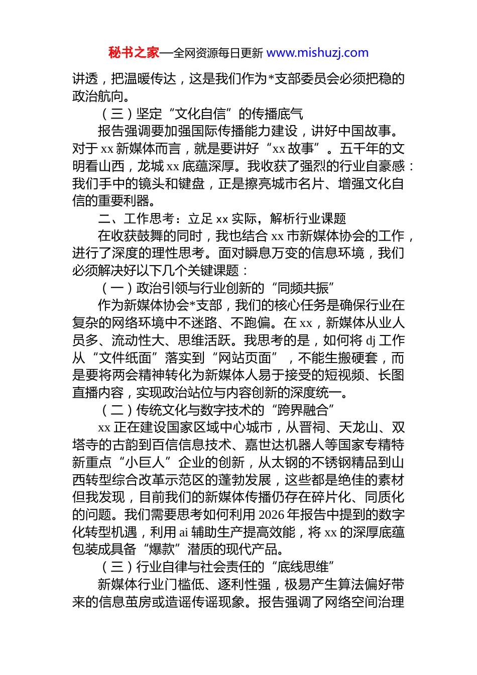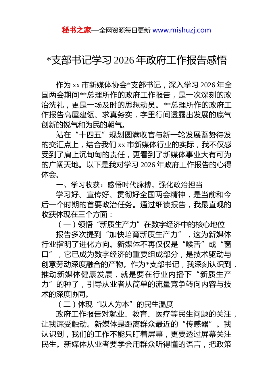 秘书之家—全网资源每日更新 www.mishuzj.com*支部书记学习 2026 年政府工作报告感悟作为 xx 市新媒体协会*支部书记,深入学习 2026 年全国两会期间**总理所作的政府工作报告,是一次深刻的政治洗礼,更是一场及时的思想动员。**总理所作的政府工作报告高屋建瓴、求真务实,字里行间透露出发展的底气创新的锐气和为民的朝气。站在“十四五”规划圆满收官与新一轮发展蓄势待发的交汇点上,结合我们 xx 市新媒体行业的实际,我不仅感受到了肩上沉甸甸的责任,更看到了新媒体事业大有可为的广阔天地。以下是我对学习 2026 年政府工作报告的心得体会。一、学习收获:感悟时代脉搏,强化政治担当学习好、宣传好、贯彻好全国两会精神,是当前和今后一个时期的首要政治任务。通过细读报告,我最直观的收获体现在三个方面:(一)领悟“新质生产力”在数字经济中的核心地位报告多次提到“加快培育新质生产力”,这为新媒体行业指明了进化方向。新媒体不再仅仅是“喉舌”或“窗口”,它已成为数字经济的重要组成部分,是技术驱动与创意劳动深度融合的产物。作为*支部书记,我深刻认识到,推动新媒体健康发展,就是要在行业内播下“新质生产力”的种子,引导从业者从简单的流量竞争转向内容与技术的深度协同。(二)体现“以人为本”的民生温度政府工作报告对就业、教育、医疗等民生问题的关注,让我深受触动。新媒体是距离群众最近的“传感器”。我认识到,我们的工作不能只盯着屏幕,更要透过屏幕关注民生。新媒体从业者要学会用群众听得懂的语言,把政策秘书之家—全网资源每日更新 www.mishuzj.com讲透,把温暖传达,这是我们作为*支部委员会必须把稳的政治航向。(三)坚定“文化自信”的传播底气报告强调要加强国际传播能力建设,讲好中国故事。对于 xx 新媒体而言,就是要讲好“xx 故事”。五千年的文明看山西,龙城 xx 底蕴深厚。我收获了强烈的行业自豪感:我们手中的镜头和键盘,正是擦亮城市名片、增强文化自信的重要利器。二、工作思考:立足 xx 实际,解析行业课题在收获鼓舞的同时,我也结合 xx 市新媒体协会的工作,进行了深度的理性思考。面对瞬息万变的信息环境,我们必须解决好以下几个关键课题:(一)政治引领与行业创新的“同频共振”作为新媒体协会*支部,我们的核心任务是确保行业在复杂的网络环境中不迷路、不跑偏。在 xx,新媒体从业人员多、流动性大、思维活跃。我思考的是,如何将 dj 工作从“文件纸面”落实到“网站页面”,不能生搬硬套,而是要将两会精神转化为新媒体人易于接受的短视频、长图直播内容,实现政治站位与内容创新的深度统一。(二)传统文化与数字技术的“跨界融合”xx 正在建设国家区域中心城市,从晋祠、天龙山、双塔寺的古韵到百信信息技术、嘉世达机器人等国家专精特新重点“小巨人”企业的创新,从太钢的不锈钢精品到山西转型综合改革示范区的蓬勃发展,这些都是绝佳的素材但我发现,目前我们的新媒体传播仍存在碎片化、同质化的问题。我们需要思考如何利用 2026 年报告中提到的数字化转型机遇,利用 ai 辅助生产提高效能,将 xx 的深厚底蕴包装成具备“爆款”潜质的现代产品。(三)行业自律与社会责任的“底线思维”新媒体行业门槛低、逐利性强,极易产生算法偏好带来的信息茧房或造谣传谣现象。报告强调了网络空间治理秘书之家—全网资源每日更新 www.mishuzj.com的重要性。作为行业组织,我们不能只做“啦啦队”,更要做“守门员”。如何建立健全 xx 新媒体行业的评价体系,引导网红、大 v 在追求流量的同时,主动扛起社会责任,是我们必须面对的硬骨头。三、未来打算:笃行致远,绘就锦绣 xx 新篇章学习的目的是更好地实践。作为支部书记,我将把学习感悟转化为实际行动,带领 xx 市新媒体协会在以下四个方向发力:(一)筑牢堡垒,让“红色引擎”驱动新媒体航向我们将开展“两会精神进传媒”系列*课,不仅要在办公室内讲,更要在直播间里讲,在创作基地讲。我们要发挥*员大 v 的带头作用,在重大议题、突发事件面前,能够先声夺人,传播正能量。计划在今年内,在协会内部评选一批“*员先...