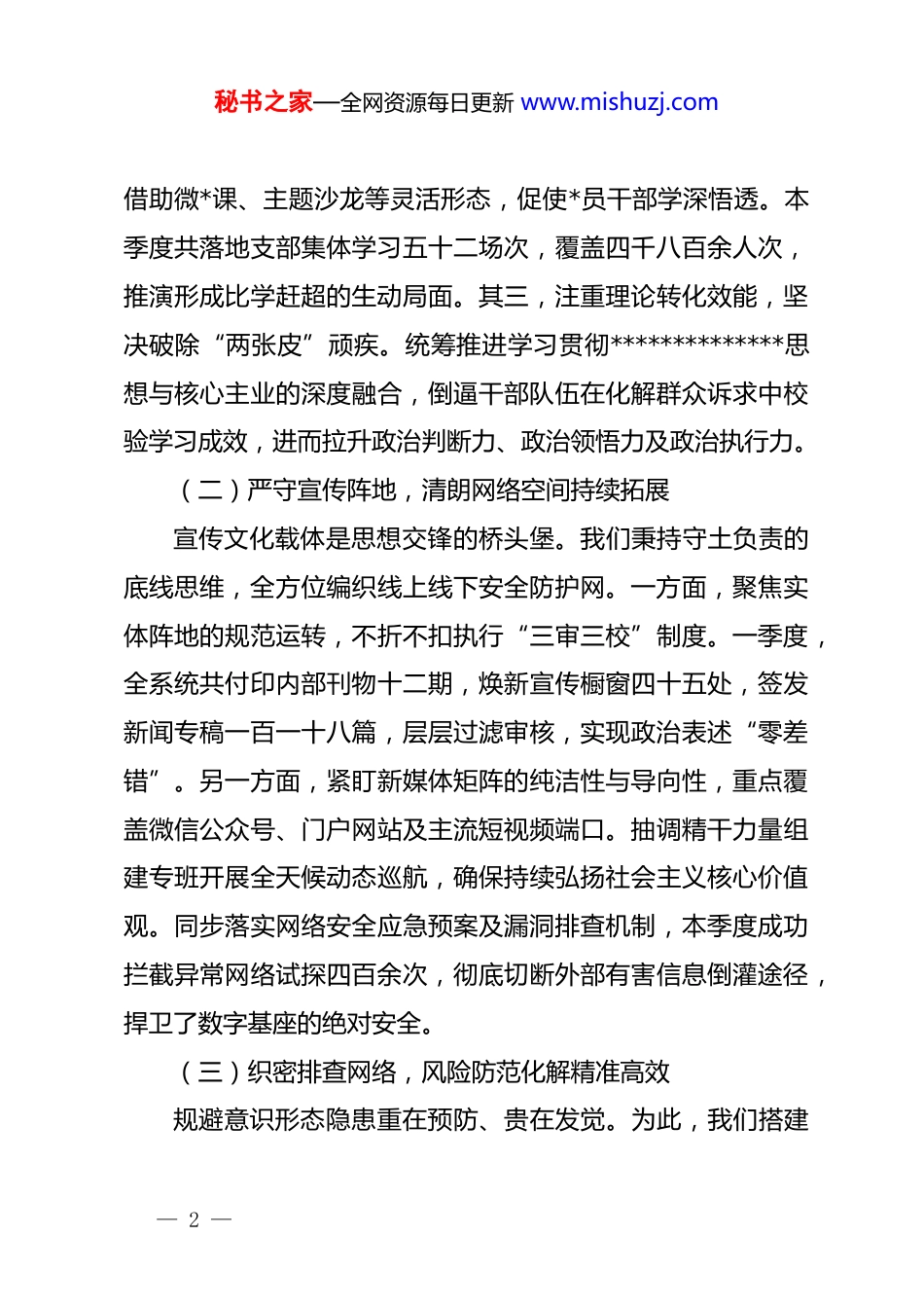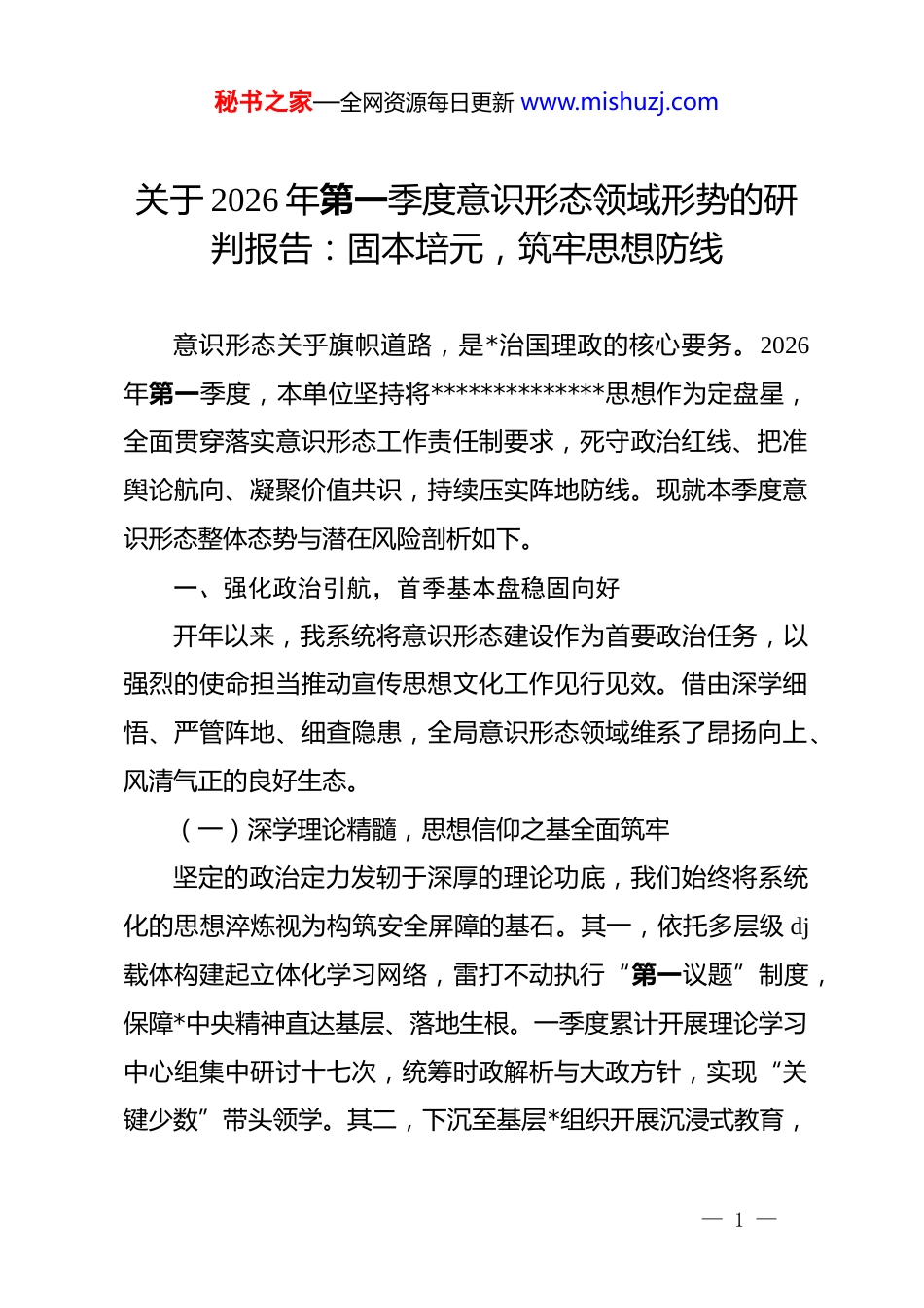 秘书之家—全网资源每日更新 www.mishuzj.com关于 2026 年第一季度意识形态领域形势的研判报告:固本培元,筑牢思想防线意识形态关乎旗帜道路,是*治国理政的核心要务。2026年第一季度,本单位坚持将**************思想作为定盘星,全面贯穿落实意识形态工作责任制要求,死守政治红线、把准舆论航向、凝聚价值共识,持续压实阵地防线。现就本季度意识形态整体态势与潜在风险剖析如下。一、强化政治引航,首季基本盘稳固向好开年以来,我系统将意识形态建设作为首要政治任务,以强烈的使命担当推动宣传思想文化工作见行见效。借由深学细悟、严管阵地、细查隐患,全局意识形态领域维系了昂扬向上、风清气正的良好生态。(一)深学理论精髓,思想信仰之基全面筑牢坚定的政治定力发轫于深厚的理论功底,我们始终将系统化的思想淬炼视为构筑安全屏障的基石。其一,依托多层级 dj载体构建起立体化学习网络,雷打不动执行“第一议题”制度,保障*中央精神直达基层、落地生根。一季度累计开展理论学习中心组集中研讨十七次,统筹时政解析与大政方针,实现“关键少数”带头领学。其二,下沉至基层*组织开展沉浸式教育,— 1 —秘书之家—全网资源每日更新 www.mishuzj.com借助微*课、主题沙龙等灵活形态,促使*员干部学深悟透。本季度共落地支部集体学习五十二场次,覆盖四千八百余人次,推演形成比学赶超的生动局面。其三,注重理论转化效能,坚决破除“两张皮”顽疾。统筹推进学习贯彻**************思想与核心主业的深度融合,倒逼干部队伍在化解群众诉求中校验学习成效,进而拉升政治判断力、政治领悟力及政治执行力。(二)严守宣传阵地,清朗网络空间持续拓展宣传文化载体是思想交锋的桥头堡。我们秉持守土负责的底线思维,全方位编织线上线下安全防护网。一方面,聚焦实体阵地的规范运转,不折不扣执行“三审三校”制度。一季度,全系统共付印内部刊物十二期,焕新宣传橱窗四十五处,签发新闻专稿一百一十八篇,层层过滤审核,实现政治表述“零差错”。另一方面,紧盯新媒体矩阵的纯洁性与导向性,重点覆盖微信公众号、门户网站及主流短视频端口。抽调精干力量组建专班开展全天候动态巡航,确保持续弘扬社会主义核心价值观。同步落实网络安全应急预案及漏洞排查机制,本季度成功拦截异常网络试探四百余次,彻底切断外部有害信息倒灌途径,捍卫了数字基座的绝对安全。(三)织密排查网络,风险防范化解精准高效规避意识形态隐患重在预防、贵在发觉。为此,我们搭建— 2 —秘书之家—全网资源每日更新 www.mishuzj.com了覆盖全域的隐患捕捉体系。前期,制发季度专属风险摸排指南,划定八个维度二十四项观测指标,督导各部门开展地毯式摸排。第一季度共锁定苗头性隐患十三个,主要散见于外聘人员背景审查不严、部分自媒体矩阵备案滞后等环节。对此,全面推行“挂图作战、对账销号”,锁定第一责任人并压茬推进整改。中期,常态化召开跨部门联席研判会,对汇集的敏感线索剥茧抽丝,预测其裂变路径。后期,打通宣传、纪检、**等条块的信息壁垒,推动单兵作战向集团冲锋转型,确保面对突发异动能快速合围、稳妥平息。二、审视复杂变局,潜在风险挑战依然严峻在肯定首季开局良好之际,我们亦须保持清醒。置身百年未有之大变局,意识形态领域的暗战愈发激烈。伴随媒介技术的迭代与社会群体的利益分化,我们在阻断负面外溢、抵御错误思潮方面,依然承压前行。(一)涉网变量增多,社会负面情绪易于发酵互联网已成为意识形态较量的“第一主战场”,涉网不可控因素正呈攀升态势。一是舆论传播呈现圈层化、情绪化倾向。部分公众在审视民生热点、公共管理事务时,极易被煽动性标题或残缺信息带偏节奏,致使常规诉求演变为对涉事主体的集体声讨。二是算法逻辑诱发“信息茧房”,极端观点在特定社— 3 —秘书之家—全网资源每日更新 www.mishuzj.com群内加速回音共振,大幅拉高了正面引导的门槛。虽一季度未爆发现象级负面舆情,但例行监测显示,因微观服务瑕疵引发的负面吐糟较去年同期攀升了百分之十五。三是境外势力的隐蔽渗透手法日益狡猾,常以理中客面目示人,在热点事件中夹带私...