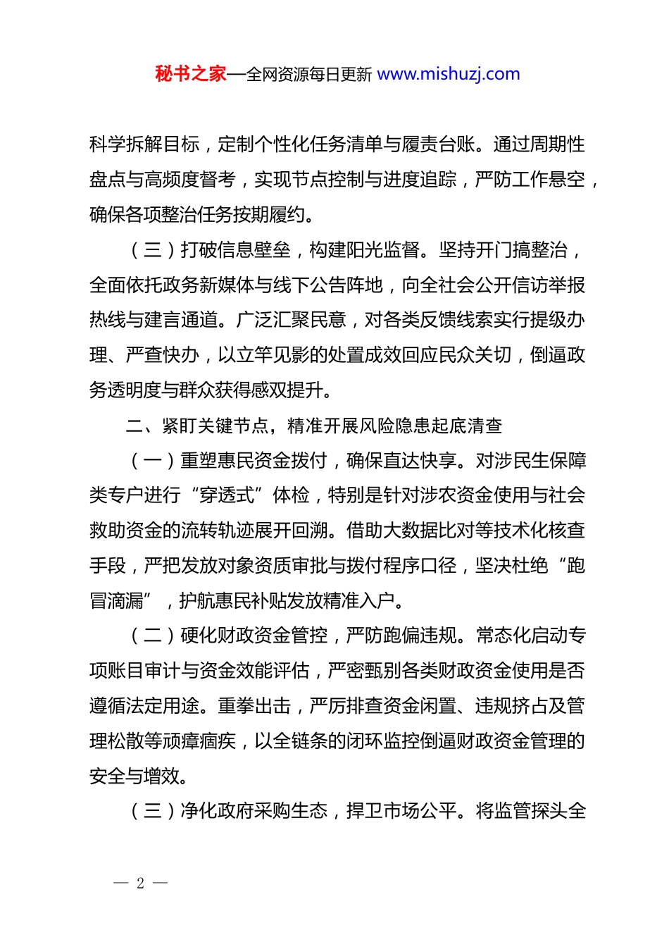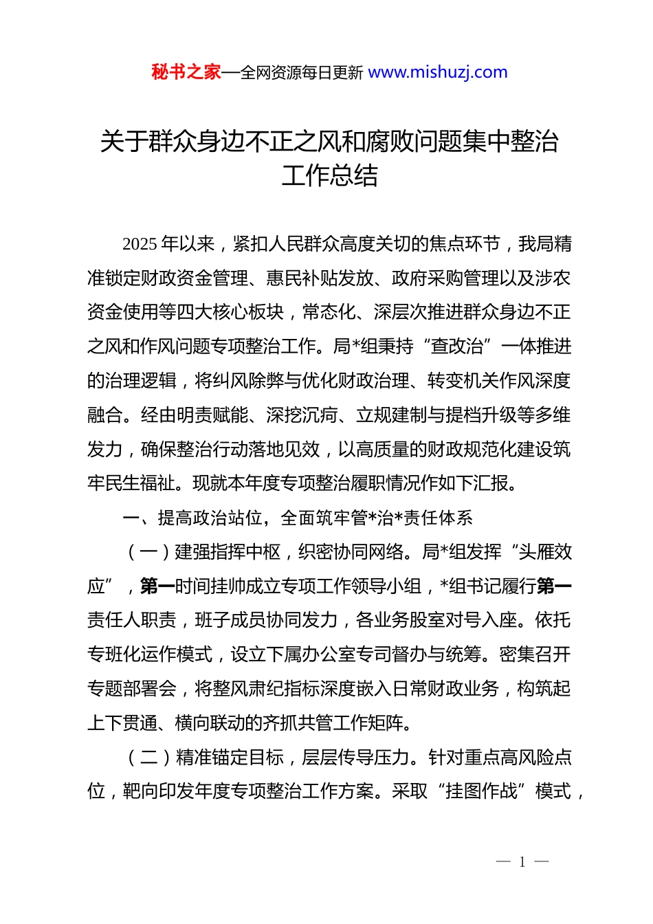秘书之家—全网资源每日更新 www.mishuzj.com关于群众身边不正之风和腐败问题集中整治工作总结2025 年以来,紧扣人民群众高度关切的焦点环节,我局精准锁定财政资金管理、惠民补贴发放、政府采购管理以及涉农资金使用等四大核心板块,常态化、深层次推进群众身边不正之风和作风问题专项整治工作。局*组秉持“查改治”一体推进的治理逻辑,将纠风除弊与优化财政治理、转变机关作风深度融合。经由明责赋能、深挖沉疴、立规建制与提档升级等多维发力,确保整治行动落地见效,以高质量的财政规范化建设筑牢民生福祉。现就本年度专项整治履职情况作如下汇报。一、提高政治站位,全面筑牢管*治*责任体系(一)建强指挥中枢,织密协同网络。局*组发挥“头雁效应”,第一时间挂帅成立专项工作领导小组,*组书记履行第一责任人职责,班子成员协同发力,各业务股室对号入座。依托专班化运作模式,设立下属办公室专司督办与统筹。密集召开专题部署会,将整风肃纪指标深度嵌入日常财政业务,构筑起上下贯通、横向联动的齐抓共管工作矩阵。(二)精准锚定目标,层层传导压力。针对重点高风险点位,靶向印发年度专项整治工作方案。采取“挂图作战”模式,— 1 —秘书之家—全网资源每日更新 www.mishuzj.com科学拆解目标,定制个性化任务清单与履责台账。通过周期性盘点与高频度督考,实现节点控制与进度追踪,严防工作悬空,确保各项整治任务按期履约。(三)打破信息壁垒,构建阳光监督。坚持开门搞整治,全面依托政务新媒体与线下公告阵地,向全社会公开信访举报热线与建言通道。广泛汇聚民意,对各类反馈线索实行提级办理、严查快办,以立竿见影的处置成效回应民众关切,倒逼政务透明度与群众获得感双提升。二、紧盯关键节点,精准开展风险隐患起底清查(一)重塑惠民资金拨付,确保直达快享。对涉民生保障类专户进行“穿透式”体检,特别是针对涉农资金使用与社会救助资金的流转轨迹展开回溯。借助大数据比对等技术化核查手段,严把发放对象资质审批与拨付程序口径,坚决杜绝“跑冒滴漏”,护航惠民补贴发放精准入户。(二)硬化财政资金管控,严防跑偏违规。常态化启动专项账目审计与资金效能评估,严密甄别各类财政资金使用是否遵循法定用途。重拳出击,严厉排查资金闲置、违规挤占及管理松散等顽瘴痼疾,以全链条的闭环监控倒逼财政资金管理的安全与增效。(三)净化政府采购生态,捍卫市场公平。将监管探头全— 2 —秘书之家—全网资源每日更新 www.mishuzj.com面延伸至政府采购管理活动全生命周期,严把预算编制关、程序合规关及履约执行关。重拳整治违规暗箱操作,全力营造阳光透明、竞价公允的公共资源交易环境。三、坚持动真碰硬,纵深推进整改任务对账销号(一)推行清单化销号机制。对前期摸排暴露出的短板弱项予以归口建档,量身定制问题整改台账。严格实行“一患一档”与清单化管理,卡死时间节点与整改措施,落实落细责任到人,确保存量问题见底清零。(二)实施高频次跟踪督办。采取日常督查与专项巡查互为补充的监督战术,对整改施工现场进行全周期压茬推进。针对动作迟缓或落实不力的环节,果断采取约谈提醒、挂牌督办,严防虚假整改,坚决推动历史遗留与新生问题连根拔起。(三)筑牢思想防线与底线。深挖行业内部反面典型,常态化开展“以案促改”专项警示教育。通过用“身边事”敲打“身边人”,全面唤醒财政干部的纪律红线意识与履职担当精神,从根源上提升依法理财的职业素养。四、注重标本兼治,系统升级财政治理制度体系(一)织密基础财权管理网。系统性重构既有规章体系,重点针对资金审批权限、资金拨付与监管流转等核心环节开展财政资金管理制度的修订完善工作,扎紧制度的笼子,让每一— 3 —秘书之家—全网资源每日更新 www.mishuzj.com笔开支均在法治化轨道内运行。(二)搭建全维度风控架构。创新构建覆盖事前预警、事中监控、事后追溯的立体化监督管理机制。强化资金流水动态捕捉与异动排查,确保各类财务风险隐患能够打早打小、防患于未然。(三)赋能数字化财政转型。积极拥抱智慧财政建设,深度植入信息化管控模块。依托大数据库及智能分析工...