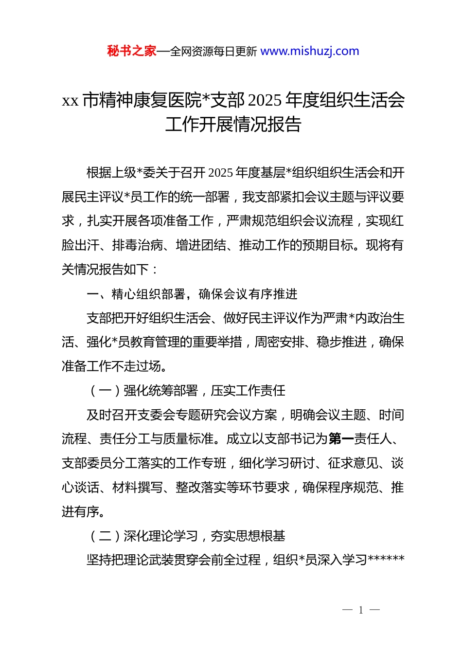 秘书之家—全网资源每日更新 www.mishuzj.comxx 市精神康复医院*支部 2025 年度组织生活会工作开展情况报告根据上级*委关于召开 2025 年度基层*组织组织生活会和开展民主评议*员工作的统一部署,我支部紧扣会议主题与评议要求,扎实开展各项准备工作,严肃规范组织会议流程,实现红脸出汗、排毒治病、增进团结、推动工作的预期目标。现将有关情况报告如下:一、精心组织部署,确保会议有序推进支部把开好组织生活会、做好民主评议作为严肃*内政治生活、强化*员教育管理的重要举措,周密安排、稳步推进,确保准备工作不走过场。(一)强化统筹部署,压实工作责任及时召开支委会专题研究会议方案,明确会议主题、时间流程、责任分工与质量标准。成立以支部书记为第一责任人、支部委员分工落实的工作专班,细化学习研讨、征求意见、谈心谈话、材料撰写、整改落实等环节要求,确保程序规范、推进有序。(二)深化理论学习,夯实思想根基坚持把理论武装贯穿会前全过程,组织*员深入学习******— 1 —秘书之家—全网资源每日更新 www.mishuzj.com********思想、*的二十大及二十届三中、四中全会精神,系统学习*章、《中国共产*支部工作条例(试行)》等*内法规,重点领会“十五五”时期经济社会发展新部署新要求。采取集中领学、个人自学、专题研讨、交流分享相结合方式,推动*员学深悟透、入脑入心,切实增强政治自觉、思想自觉、行动自觉。(三)广泛征求意见,精准查摆问题坚持开门纳谏,通过座谈访谈、线上线下意见箱、问卷调查、一线走访等形式,广泛听取*员、职工群众、患者及家属对支部班子及*员个人在政治建设、理论学习、履职尽责、服务群众、作风纪律、先锋模范等方面的意见建议。针对精神康复医疗工作特点,重点收集患者康复服务质量、医疗安全保障、医患沟通效能等方面的意见。对收集意见分类梳理、原汁原味反馈,为对照检查提供靶向。(四)深入谈心谈话,凝聚思想共识严格落实“四必谈”要求开展深入谈心谈话。谈话既交流思想、沟通工作,又直指不足、提出建议,坦诚交换意见、消除思想隔阂,把问题谈开、把思想谈通、把意见谈透,为严肃开展批评与自我批评营造良好氛围。(五)认真撰写材料,深刻检视剖析支部班子与全体*员紧扣对照检查重点,把自己摆进去、把— 2 —秘书之家—全网资源每日更新 www.mishuzj.com职责摆进去、把工作摆进去,深入查摆问题、剖析根源、明确方向。支部书记严格审核班子对照检查材料与*员个人发言提纲,确保问题找得准、根源挖得深、措施定得实。二、严格会议程序,确保会议高质高效(一)支部与*员全面深刻剖析2025 年 3 月 xx 日,支部召开 2025 年度组织生活会暨民主评议*员大会,应到*员 xx 名,实到 xx 名,参会率符合规定要求,上级*组织派员到会指导。会议由支部书记主持,严格按程序推进,氛围严肃认真、团结和谐。支部班子与全体*员围绕五个带头方面开展深入对照检查:带头强化政治忠诚、提高政治能力方面支部班子深刻认识到,政治建设是*的根本性建设,政治忠诚是*员首要政治品质。对照检查发现,支部在引导*员增强政治敏锐性和政治鉴别力方面仍有不足,部分*员对意识形态领域复杂性认识不够深刻,在医疗工作中把握政治方向、防范政治风险的能力有待提升。在将政治要求融入精神康复医疗服务全过程方面,存在结合不够紧密的问题,政治引领作用发挥不够充分。针对精神障碍患者群体的人文关怀与政治引导结合不够,未能充分体现*对患者群体的关怀和温暖。带头固本培元、增强*性方面— 3 —秘书之家—全网资源每日更新 www.mishuzj.com支部在加强*员*性教育方面做了大量工作,但仍存在*性锻炼常态化机制不够健全的问题。部分*员*性修养主动性不强,在繁重的医疗康复工作中放松了对自身*性要求,*性分析不够深入,理想信念根基不够牢固。精神康复医疗工作压力大、任务重,个别*员存在职业倦怠情绪,*性锻炼的自觉性和主动性有所减弱。在日常工作中践行*的宗旨、坚守入*初心的意识还需进一步增强,面对患者时的服务意识和奉献精神还需提升。带头敬畏人民、敬畏组织、敬畏法纪方面支部班子深刻查摆,在敬畏人民方...
