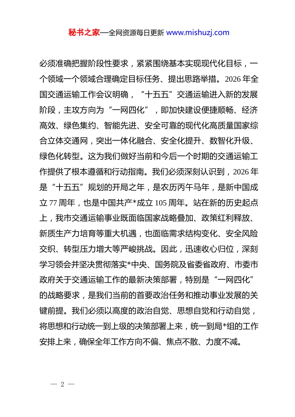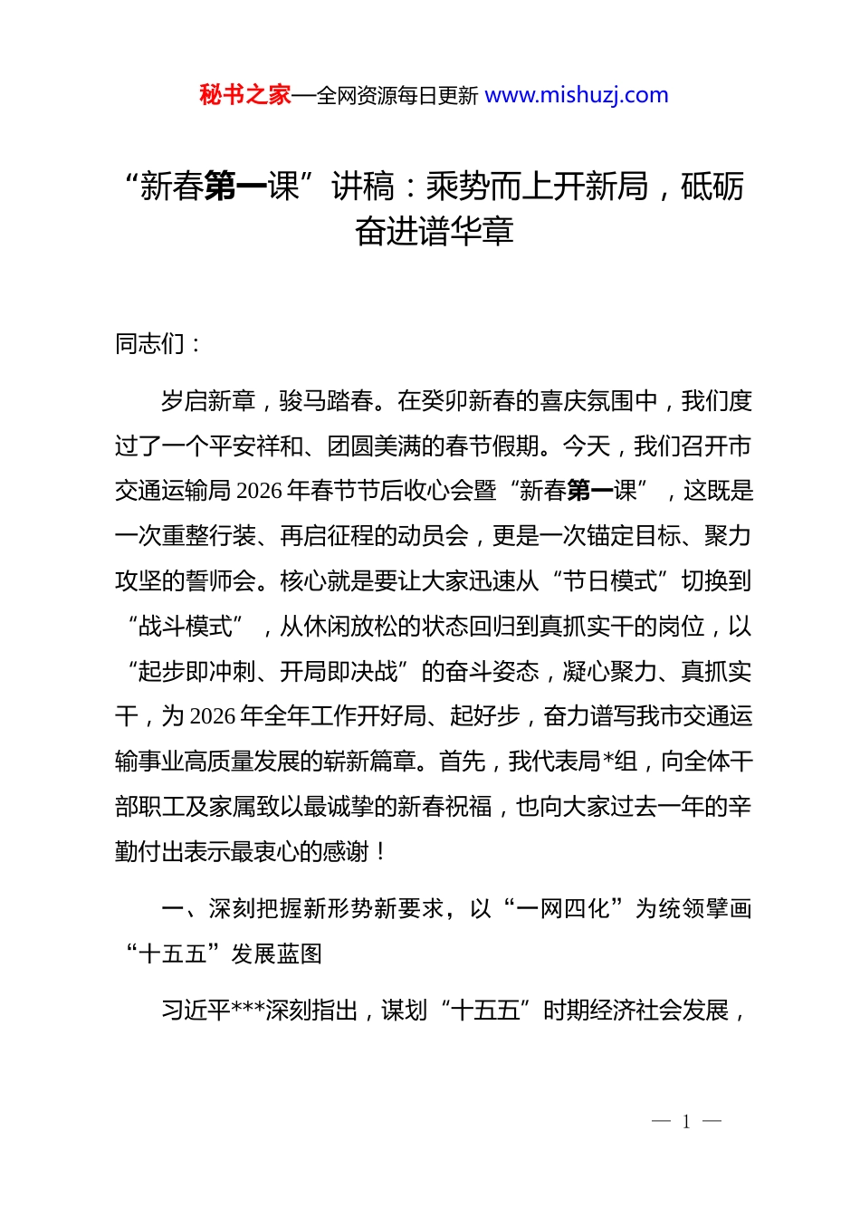 秘书之家—全网资源每日更新 www.mishuzj.com“新春第一课”讲稿:乘势而上开新局,砥砺奋进谱华章同志们:岁启新章,骏马踏春。在癸卯新春的喜庆氛围中,我们度过了一个平安祥和、团圆美满的春节假期。今天,我们召开市交通运输局 2026 年春节节后收心会暨“新春第一课”,这既是一次重整行装、再启征程的动员会,更是一次锚定目标、聚力攻坚的誓师会。核心就是要让大家迅速从“节日模式”切换到“战斗模式”,从休闲放松的状态回归到真抓实干的岗位,以“起步即冲刺、开局即决战”的奋斗姿态,凝心聚力、真抓实干,为 2026 年全年工作开好局、起好步,奋力谱写我市交通运输事业高质量发展的崭新篇章。首先,我代表局*组,向全体干部职工及家属致以最诚挚的新春祝福,也向大家过去一年的辛勤付出表示最衷心的感谢!一、深刻把握新形势新要求,以“一网四化”为统领擘画“十五五”发展蓝图习近平***深刻指出,谋划“十五五”时期经济社会发展,— 1 —秘书之家—全网资源每日更新 www.mishuzj.com必须准确把握阶段性要求,紧紧围绕基本实现现代化目标,一个领域一个领域合理确定目标任务、提出思路举措。2026 年全国交通运输工作会议明确,“十五五”交通运输进入新的发展阶段,主攻方向为“一网四化”,即加快建设便捷顺畅、经济高效、绿色集约、智能先进、安全可靠的现代化高质量国家综合立体交通网,突出一体化融合、安全化提升、数智化升级、绿色化转型。这为我们做好当前和今后一个时期的交通运输工作提供了根本遵循和行动指南。我们必须深刻认识到,2026 年是“十五五”规划的开局之年,是农历丙午马年,是新中国成立 77 周年,也是中国共产*成立 105 周年。站在新的历史起点上,我市交通运输事业既面临国家战略叠加、政策红利释放、新质生产力培育等重大机遇,也面临需求结构变化、安全风险交织、转型压力增大等严峻挑战。因此,迅速收心归位,深刻学习领会并坚决贯彻落实*中央、国务院及省委省政府、市委市政府关于交通运输工作的最新决策部署,特别是“一网四化”的战略要求,是我们当前的首要政治任务和推动事业发展的关键前提。我们必须以高度的政治自觉、思想自觉和行动自觉,将思想和行动统一到上级的决策部署上来,统一到局*组的工作安排上来,确保全年工作方向不偏、焦点不散、力度不减。— 2 —秘书之家—全网资源每日更新 www.mishuzj.com(一)聚焦“一体化融合”,构建高效协同的综合运输体系一体化融合是提升交通运输整体效能和核心竞争力的关键路径。习近平***强调,要建设安全、便捷、高效、绿色、经济、包容、韧性的可持续交通体系,支撑服务经济社会高质量发展。这要求我们必须打破各种运输方式之间的壁垒,推动基础设施、运输服务、信息数据、管理规则的一体化衔接。首先,在基础设施硬联通方面,我们要紧密对接国家综合立体交通网主骨架布局,加快推动我市境内高速公路网、普通国省干线公路网的贯通提质。重点推进*高速与*铁路枢纽、*港区的无缝衔接工程,优化城市快速路与高速公路出入口的衔接转换效率。同时,要大力实施“四好农村路”高质量发展工程,推动农村公路与国省干线、产业园区、旅游景区有效连接,服务乡村全面振兴。其次,在运输服务软联通方面,要深入实施多式联运攻坚行动。以*物流枢纽为核心,大力发展“公铁水空”多式联运,培育具有全程供应链组织能力的多式联运经营主体。要优化调整运输结构,大力推进大宗货物和中长距离货物运输“公转铁”、“公转水”,力争到 2026 年底,全市铁路、水路承担的大宗货物运输量比重较 2025 年提升 2 个百分点。要完善城乡客运服务— 3 —秘书之家—全网资源每日更新 www.mishuzj.com体系,推动城市公共交通向周边城镇延伸,促进城乡交通运输一体化发展,让人民群众出行更便捷、更经济。最后,在规则标准与信息联通方面,要积极参与并推动区域综合交通运输标准协同,在票务联程、安检互认、数据共享等方面取得实质性突破。要加快建设我市综合交通运输信息平台,整合公路、铁路、水运、民航、邮政等各类运行数据,实现跨方式、跨区域、跨层级的综合运输协同调度与应急指挥...