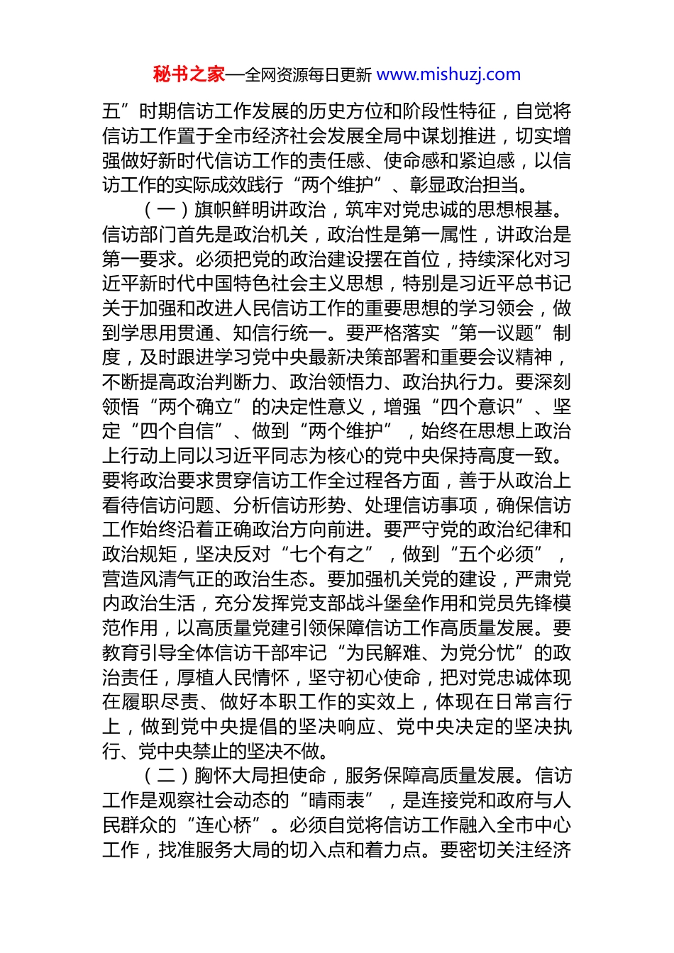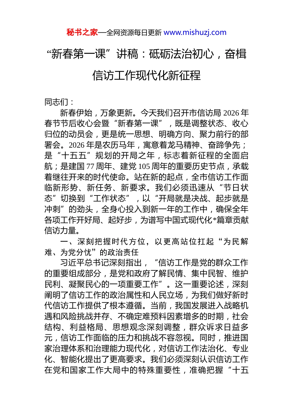 秘书之家—全网资源每日更新 www.mishuzj.com“新春第一课”讲稿:砥砺法治初心,奋楫信访工作现代化新征程同志们:新春伊始,万象更新。今天我们召开市信访局 2026 年春节节后收心会暨“新春第一课”,既是调整状态、收心归位的动员会,更是统一思想、明确方向、聚力前行的部署会。2026 年是农历马年,寓意着龙马精神、奋蹄争先;是“十五五”规划的开局之年,标志着新征程的全面启航;是建国 77 周年、建党 105 周年的重要历史节点,承载着继往开来的时代使命。站在新的起点,全市信访工作面临新形势、新任务、新要求。我们必须迅速从“节日状态”切换到“工作状态”,以“开局就是决战、起步就是冲刺”的劲头,全身心投入到新一年的工作中,确保全年各项工作开好局、起好步,为谱写中国式现代化*篇章贡献信访力量。一、深刻把握时代方位,以更高站位扛起“为民解难、为党分忧”的政治责任习近平总书记深刻指出,“信访工作是党的群众工作的重要组成部分,是党和政府了解民情、集中民智、维护民利、凝聚民心的一项重要工作”。这一重要论述,深刻阐明了信访工作的政治属性和人民立场,为我们做好新时代信访工作提供了根本遵循。当前,我国发展进入战略机遇和风险挑战并存、不确定难预料因素增多的时期,社会结构、利益格局、思想观念深刻调整,群众诉求日益多元,信访工作面临的压力和挑战不容忽视。同时,推进国家治理体系和治理能力现代化,对信访工作法治化、专业化、智能化提出了更高要求。我们必须深刻认识信访工作在党和国家工作大局中的特殊重要性,准确把握“十五秘书之家—全网资源每日更新 www.mishuzj.com五”时期信访工作发展的历史方位和阶段性特征,自觉将信访工作置于全市经济社会发展全局中谋划推进,切实增强做好新时代信访工作的责任感、使命感和紧迫感,以信访工作的实际成效践行“两个维护”、彰显政治担当。(一)旗帜鲜明讲政治,筑牢对党忠诚的思想根基。信访部门首先是政治机关,政治性是第一属性,讲政治是第一要求。必须把党的政治建设摆在首位,持续深化对习近平新时代中国特色社会主义思想,特别是习近平总书记关于加强和改进人民信访工作的重要思想的学习领会,做到学思用贯通、知信行统一。要严格落实“第一议题”制度,及时跟进学习党中央最新决策部署和重要会议精神,不断提高政治判断力、政治领悟力、政治执行力。要深刻领悟“两个确立”的决定性意义,增强“四个意识”、坚定“四个自信”、做到“两个维护”,始终在思想上政治上行动上同以习近平同志为核心的党中央保持高度一致。要将政治要求贯穿信访工作全过程各方面,善于从政治上看待信访问题、分析信访形势、处理信访事项,确保信访工作始终沿着正确政治方向前进。要严守党的政治纪律和政治规矩,坚决反对“七个有之”,做到“五个必须”,营造风清气正的政治生态。要加强机关党的建设,严肃党内政治生活,充分发挥党支部战斗堡垒作用和党员先锋模范作用,以高质量党建引领保障信访工作高质量发展。要教育引导全体信访干部牢记“为民解难、为党分忧”的政治责任,厚植人民情怀,坚守初心使命,把对党忠诚体现在履职尽责、做好本职工作的实效上,体现在日常言行上,做到党中央提倡的坚决响应、党中央决定的坚决执行、党中央禁止的坚决不做。(二)胸怀大局担使命,服务保障高质量发展。信访工作是观察社会动态的“晴雨表”,是连接党和政府与人民群众的“连心桥”。必须自觉将信访工作融入全市中心工作,找准服务大局的切入点和着力点。要密切关注经济秘书之家—全网资源每日更新 www.mishuzj.com社会发展中的苗头性、倾向性问题,特别是围绕重大项目建设、重点领域改革、民生政策调整等可能引发的社会风险,加强分析研判,及时预警提示,为党委政府科学决策提供参考。要畅通和规范群众诉求表达、利益协调、权益保障通道,完善人民建议征集工作机制,广泛吸纳民意、汇集民智,推动人民群众的“金点子”转化为社会治理的“金钥匙”。要着力化解影响营商环境的信访突出问题,依法保护各类市场主体合法权益,为经济持续健康发展营造稳定公平透明可预期的法治环境。要积极参与市域...