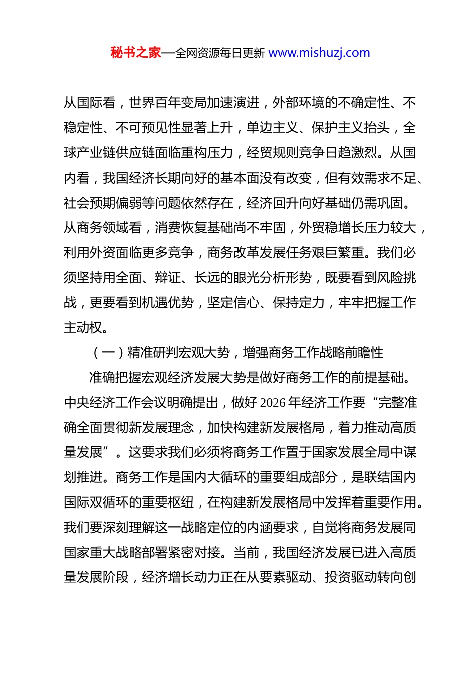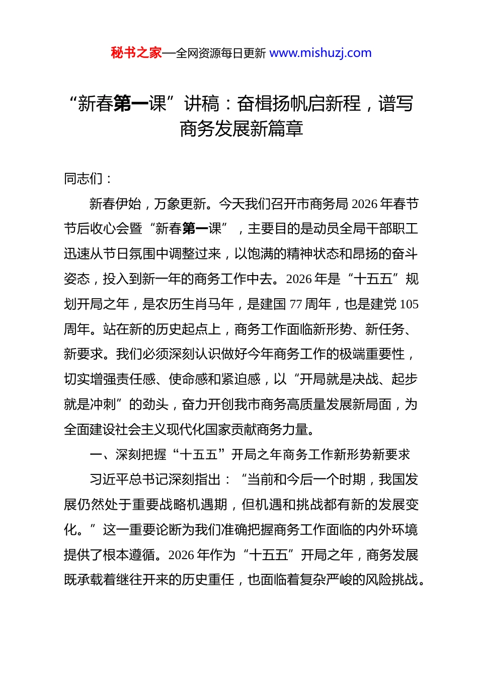 秘书之家—全网资源每日更新 www.mishuzj.com“新春第一课”讲稿:奋楫扬帆启新程,谱写商务发展新篇章 同志们:新春伊始,万象更新。今天我们召开市商务局 2026 年春节节后收心会暨“新春第一课”,主要目的是动员全局干部职工迅速从节日氛围中调整过来,以饱满的精神状态和昂扬的奋斗姿态,投入到新一年的商务工作中去。2026 年是“十五五”规划开局之年,是农历生肖马年,是建国 77 周年,也是建党 105周年。站在新的历史起点上,商务工作面临新形势、新任务、新要求。我们必须深刻认识做好今年商务工作的极端重要性,切实增强责任感、使命感和紧迫感,以“开局就是决战、起步就是冲刺”的劲头,奋力开创我市商务高质量发展新局面,为全面建设社会主义现代化国家贡献商务力量。一、深刻把握“十五五”开局之年商务工作新形势新要求习近平总书记深刻指出:“当前和今后一个时期,我国发展仍然处于重要战略机遇期,但机遇和挑战都有新的发展变化。”这一重要论断为我们准确把握商务工作面临的内外环境提供了根本遵循。2026 年作为“十五五”开局之年,商务发展既承载着继往开来的历史重任,也面临着复杂严峻的风险挑战。秘书之家—全网资源每日更新 www.mishuzj.com从国际看,世界百年变局加速演进,外部环境的不确定性、不稳定性、不可预见性显著上升,单边主义、保护主义抬头,全球产业链供应链面临重构压力,经贸规则竞争日趋激烈。从国内看,我国经济长期向好的基本面没有改变,但有效需求不足、社会预期偏弱等问题依然存在,经济回升向好基础仍需巩固。从商务领域看,消费恢复基础尚不牢固,外贸稳增长压力较大,利用外资面临更多竞争,商务改革发展任务艰巨繁重。我们必须坚持用全面、辩证、长远的眼光分析形势,既要看到风险挑战,更要看到机遇优势,坚定信心、保持定力,牢牢把握工作主动权。(一)精准研判宏观大势,增强商务工作战略前瞻性准确把握宏观经济发展大势是做好商务工作的前提基础。中央经济工作会议明确提出,做好 2026 年经济工作要“完整准确全面贯彻新发展理念,加快构建新发展格局,着力推动高质量发展”。这要求我们必须将商务工作置于国家发展全局中谋划推进。商务工作是国内大循环的重要组成部分,是联结国内国际双循环的重要枢纽,在构建新发展格局中发挥着重要作用。我们要深刻理解这一战略定位的内涵要求,自觉将商务发展同国家重大战略部署紧密对接。当前,我国经济发展已进入高质量发展阶段,经济增长动力正在从要素驱动、投资驱动转向创秘书之家—全网资源每日更新 www.mishuzj.com新驱动。商务领域必须顺应这一趋势,加快推动发展方式转变。要着力提升商务发展质量和效益,更加注重结构优化、效率提升和动力转换。要统筹好扩大内需和深化供给侧结构性改革的关系,通过商务工作有效衔接生产、分配、流通、消费各环节,畅通国民经济循环。要密切关注宏观经济政策取向,加强政策预研储备,增强商务工作的针对性和有效性。要深入研究区域协调发展、新型城镇化、乡村振兴等国家战略对商务工作提出的新要求,找准商务服务的切入点和着力点。要加强经济形势分析研判,建立健全商务运行监测预警体系,及时掌握市场动态变化,提高商务决策的科学化水平。要增强风险意识,树立底线思维,有效防范化解商务领域各类风险隐患,确保商务发展行稳致远。(二)全面对接国家部署,明确商务工作目标任务国家商务主管部门已对 2026 年商务工作作出全面部署,明确了八个方面的重点任务。我们必须认真学习领会,结合我市实际抓好贯彻落实。要深入实施提振消费专项行动,着力打造“购在中国”品牌。这要求我们把恢复和扩大消费摆在优先位置,采取更加有力有效的措施激发消费潜力。要健全现代市场和流通体系,推进全国统一大市场建设。这要求我们深化流通体制改革,完善商贸流通基础设施,降低制度性交易成本。要秘书之家—全网资源每日更新 www.mishuzj.com推动贸易创新发展,打响“出口中国”品牌。这要求我们优化贸易结构,培育竞争新优势,推动外贸稳规模、优结构。要塑造吸引外资新优势,擦亮“投资中国”品牌。这要求我们扩大高水平对外开放,...
