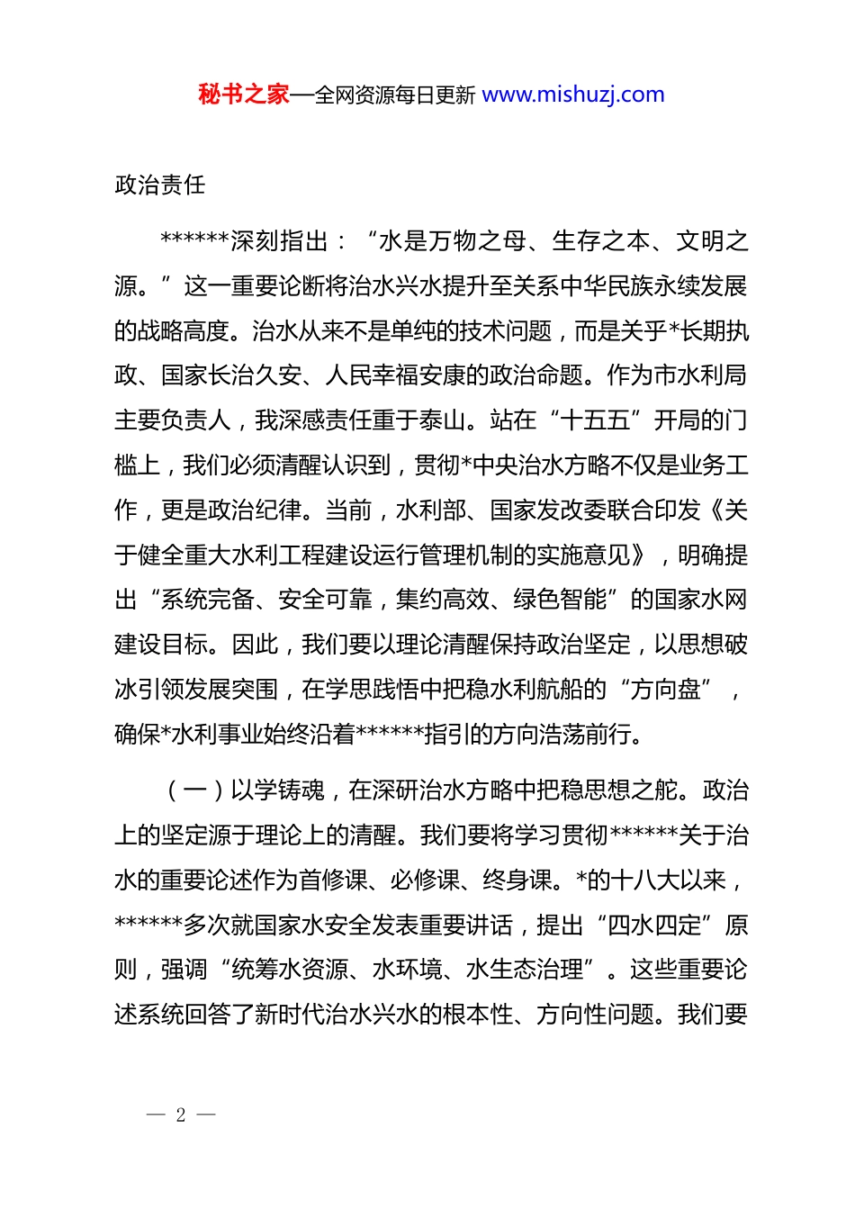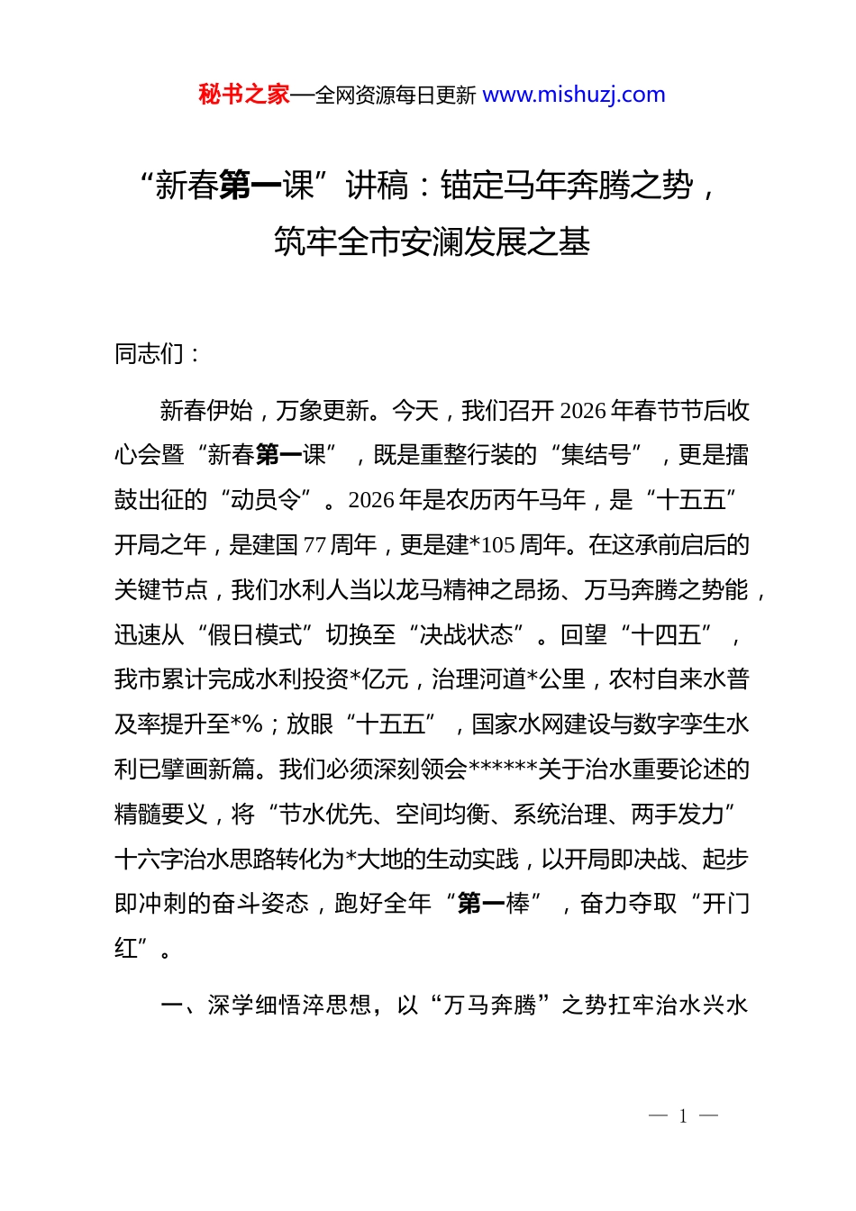 秘书之家—全网资源每日更新 www.mishuzj.com“新春第一课”讲稿:锚定马年奔腾之势,筑牢全市安澜发展之基同志们:新春伊始,万象更新。今天,我们召开 2026 年春节节后收心会暨“新春第一课”,既是重整行装的“集结号”,更是擂鼓出征的“动员令”。2026 年是农历丙午马年,是“十五五”开局之年,是建国 77 周年,更是建*105 周年。在这承前启后的关键节点,我们水利人当以龙马精神之昂扬、万马奔腾之势能,迅速从“假日模式”切换至“决战状态”。回望“十四五”,我市累计完成水利投资*亿元,治理河道*公里,农村自来水普及率提升至*%;放眼“十五五”,国家水网建设与数字孪生水利已擘画新篇。我们必须深刻领会******关于治水重要论述的精髓要义,将“节水优先、空间均衡、系统治理、两手发力”十六字治水思路转化为*大地的生动实践,以开局即决战、起步即冲刺的奋斗姿态,跑好全年“第一棒”,奋力夺取“开门红”。一、深学细悟淬思想,以“万马奔腾”之势扛牢治水兴水— 1 —秘书之家—全网资源每日更新 www.mishuzj.com政治责任******深刻指出:“水是万物之母、生存之本、文明之源。”这一重要论断将治水兴水提升至关系中华民族永续发展的战略高度。治水从来不是单纯的技术问题,而是关乎*长期执政、国家长治久安、人民幸福安康的政治命题。作为市水利局主要负责人,我深感责任重于泰山。站在“十五五”开局的门槛上,我们必须清醒认识到,贯彻*中央治水方略不仅是业务工作,更是政治纪律。当前,水利部、国家发改委联合印发《关于健全重大水利工程建设运行管理机制的实施意见》,明确提出“系统完备、安全可靠,集约高效、绿色智能”的国家水网建设目标。因此,我们要以理论清醒保持政治坚定,以思想破冰引领发展突围,在学思践悟中把稳水利航船的“方向盘”,确保*水利事业始终沿着******指引的方向浩荡前行。(一)以学铸魂,在深研治水方略中把稳思想之舵。政治上的坚定源于理论上的清醒。我们要将学习贯彻******关于治水的重要论述作为首修课、必修课、终身课。*的十八大以来,******多次就国家水安全发表重要讲话,提出“四水四定”原则,强调“统筹水资源、水环境、水生态治理”。这些重要论述系统回答了新时代治水兴水的根本性、方向性问题。我们要— 2 —秘书之家—全网资源每日更新 www.mishuzj.com坚持读原著、学原文、悟原理,将《***关于治水论述摘编》作为案头卷、工具书,深刻把握“节水优先”的战略定位,认识到节水并非权宜之计而是根本出路;深刻把握“空间均衡”的底线要求,认识到水资源承载能力直接决定城市发展上限;深刻把握“系统治理”的方法路径,认识到山水林田湖草沙是生命共同体;深刻把握“两手发力”的动力源泉,认识到市场机制与政府作用须协同发力。局*组理论学习中心组要发挥头雁效应,全年开展治水专题研学不少于 4 次,各*支部要通过“三会一课”、主题*日等形式开展全覆盖学习研讨。我们要把学习成果转化为捍卫“两个确立”、做到“两个维护”的高度自觉,坚决防止“七个有之”,坚决做到“五个必须”,确保中央、省委、市委关于水利工作的各项决策部署在*水利系统不折不扣落地生根。(二)以思增信,在对标国家战略中校准前行航向。思深方益远,谋定而后动。2026 年全国水利工作会议系统部署了“十五五”六项战略任务,要求基本实现水旱灾害防御体系和能力现代化取得决定性进展,加快建设现代化水网。这是国家层面的顶层设计,也是我们市级水利部门的行动总纲。我们要跳出水利看水利,站在全市经济社会发展全局的高度审视水利— 3 —秘书之家—全网资源每日更新 www.mishuzj.com定位。当前,我市正处在产业转型升级的关键期,水资源刚性约束与高质量发展的矛盾依然突出。我们要主动对接黄河流域生态保护和高质量发展、长江经济带发展等国家战略,将水利工作融入市委“*战略”大盘子。在谋划“十五五”水安全保障规划时,不能仅仅满足于修堤筑坝,而要系统考虑水灾害防御、水资源配置、水生态修复、水文化传承的有机统一。要深刻反思:我们的防洪工程体系是否能抵御极端天气事件?我们的供水管网是否能保障城...