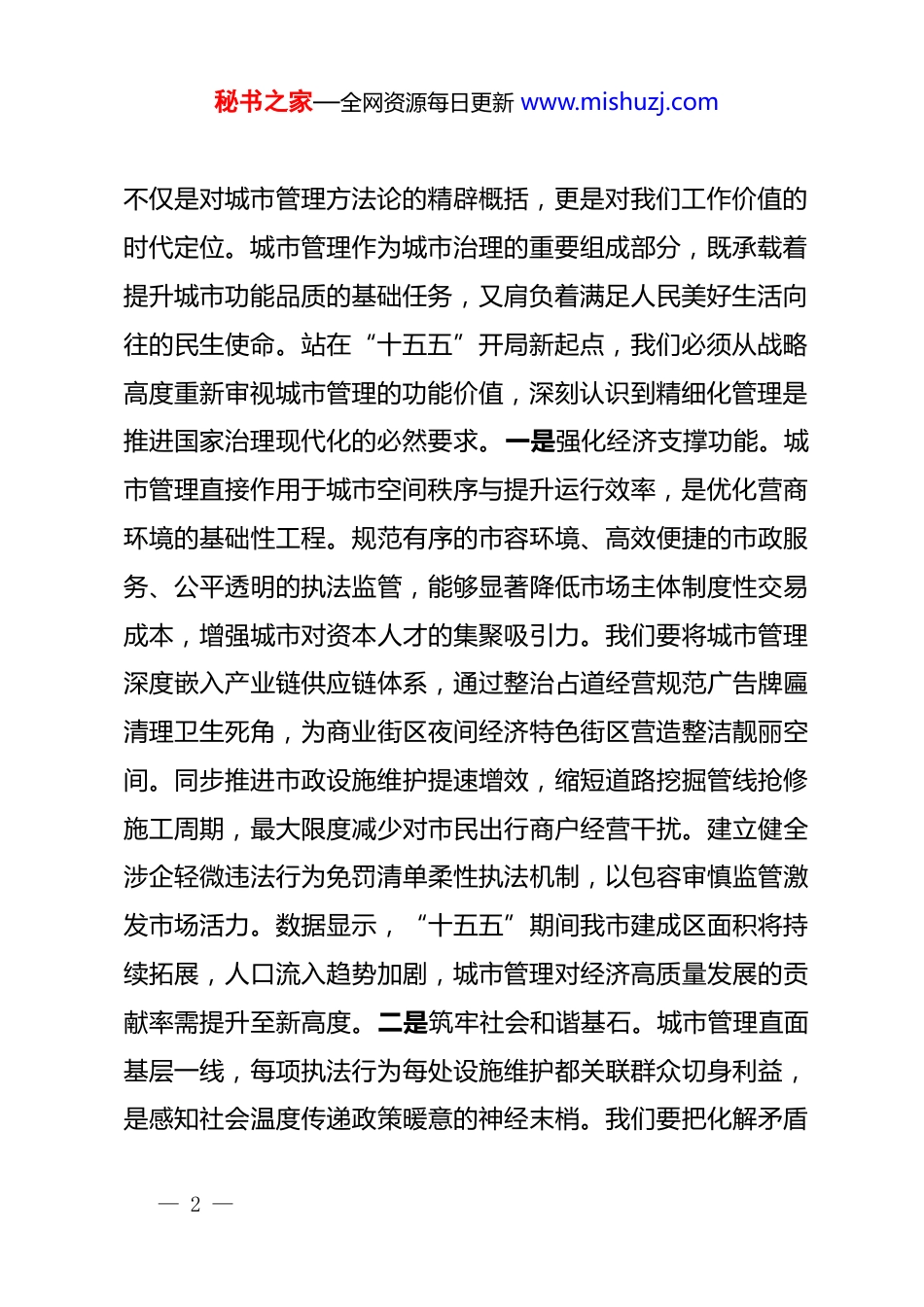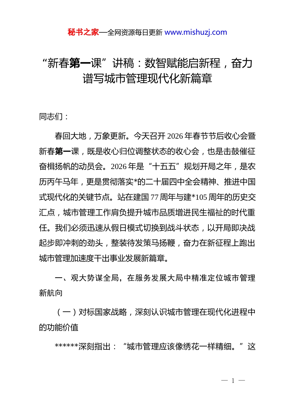 秘书之家—全网资源每日更新 www.mishuzj.com“新春第一课”讲稿:数智赋能启新程,奋力谱写城市管理现代化新篇章同志们:春回大地,万象更新。今天召开 2026 年春节节后收心会暨新春第一课,既是收心归位调整状态的收心会,也是击鼓催征奋楫扬帆的动员会。2026 年是“十五五”规划开局之年,是农历丙午马年,更是贯彻落实*的二十届四中全会精神、推进中国式现代化的关键节点。站在建国 77 周年与建*105 周年的历史交汇点,城市管理工作肩负提升城市品质增进民生福祉的时代重任。我们必须迅速从假日模式切换到战斗状态,以开局即决战起步即冲刺的劲头,整装待发策马扬鞭,奋力在新征程上跑出城市管理加速度干出事业发展新篇章。一、观大势谋全局,在服务发展大局中精准定位城市管理新航向(一)对标国家战略,深刻认识城市管理在现代化进程中的功能价值******深刻指出:“城市管理应该像绣花一样精细。”这— 1 —秘书之家—全网资源每日更新 www.mishuzj.com不仅是对城市管理方法论的精辟概括,更是对我们工作价值的时代定位。城市管理作为城市治理的重要组成部分,既承载着提升城市功能品质的基础任务,又肩负着满足人民美好生活向往的民生使命。站在“十五五”开局新起点,我们必须从战略高度重新审视城市管理的功能价值,深刻认识到精细化管理是推进国家治理现代化的必然要求。一是强化经济支撑功能。城市管理直接作用于城市空间秩序与提升运行效率,是优化营商环境的基础性工程。规范有序的市容环境、高效便捷的市政服务、公平透明的执法监管,能够显著降低市场主体制度性交易成本,增强城市对资本人才的集聚吸引力。我们要将城市管理深度嵌入产业链供应链体系,通过整治占道经营规范广告牌匾清理卫生死角,为商业街区夜间经济特色街区营造整洁靓丽空间。同步推进市政设施维护提速增效,缩短道路挖掘管线抢修施工周期,最大限度减少对市民出行商户经营干扰。建立健全涉企轻微违法行为免罚清单柔性执法机制,以包容审慎监管激发市场活力。数据显示,“十五五”期间我市建成区面积将持续拓展,人口流入趋势加剧,城市管理对经济高质量发展的贡献率需提升至新高度。二是筑牢社会和谐基石。城市管理直面基层一线,每项执法行为每处设施维护都关联群众切身利益,是感知社会温度传递政策暖意的神经末梢。我们要把化解矛盾— 2 —秘书之家—全网资源每日更新 www.mishuzj.com纠纷增进社会认同贯穿管理全过程,从源头上预防因流动摊贩管理、小区违建处置、噪音油烟扰民等问题引发的对立情绪。推行一线执法人员言行规范标准化,在强制措施实施前强化沟通解释程序,避免简单粗暴激化矛盾。依托社区网格化管理平台,整合城管队员社区工作者和志愿者力量,建立前端感知快速响应联合调处机制,将市容环境类投诉举报化解在萌芽状态。强化市政公用设施适老化适儿化改造,盲道整治无障碍设施维护体现城市人文关怀,让不同群体在共享城市发展成果中增强归属感。三是传承城市文化记忆。城市管理不仅是对物理空间的秩序维护,更是对历史文脉景观风貌的守护延续。在户外广告店招设计、公共空间艺术装置、街景照明布置中,需融入地域文化元素建筑美学语言,避免千城一面万店同招。严格保护历史文化街区历史建筑传统风貌区,细化修缮改造周边环境整治的城管执法标准,杜绝大拆大建式过度干预。规范临时性节庆活动商业促销展演空间审批流程,平衡文化传承与商业开发关系。通过精细化管理留住城市基因,让老街巷老字号老地标在现代化进程中焕发新活力,使城市管理成为文化自信的实践载体。四是驱动绿色低碳转型。城市管理是生态文明建设的重要防线,承担着生活垃圾分类建筑垃圾处置扬尘管控等硬任务。我们要将绿色低碳理念贯穿环卫保洁园林绿化市容整治全过程,— 3 —秘书之家—全网资源每日更新 www.mishuzj.com提升垃圾焚烧发电厂厨余垃圾处理厂运营效能,推动再生资源回收网络与环卫清运网络两网融合。深化建筑垃圾产生运输处置全链条闭环监管,严厉打击非法倾倒遗撒污染。优化城市绿地布局,推进口袋公园小微绿地立体绿化建设,增加碳汇空间。实施城市照明智慧调控,推广节能灯具...