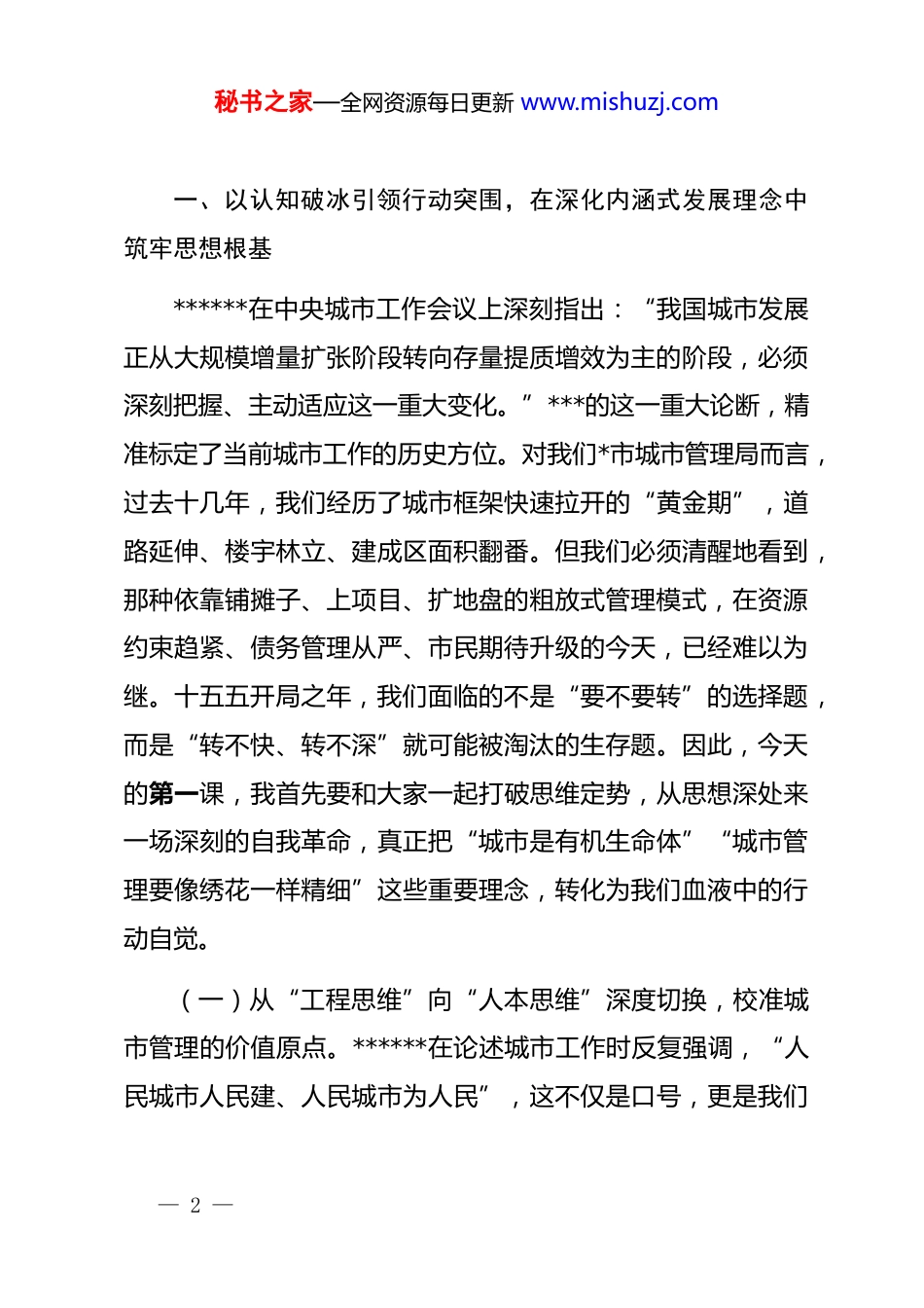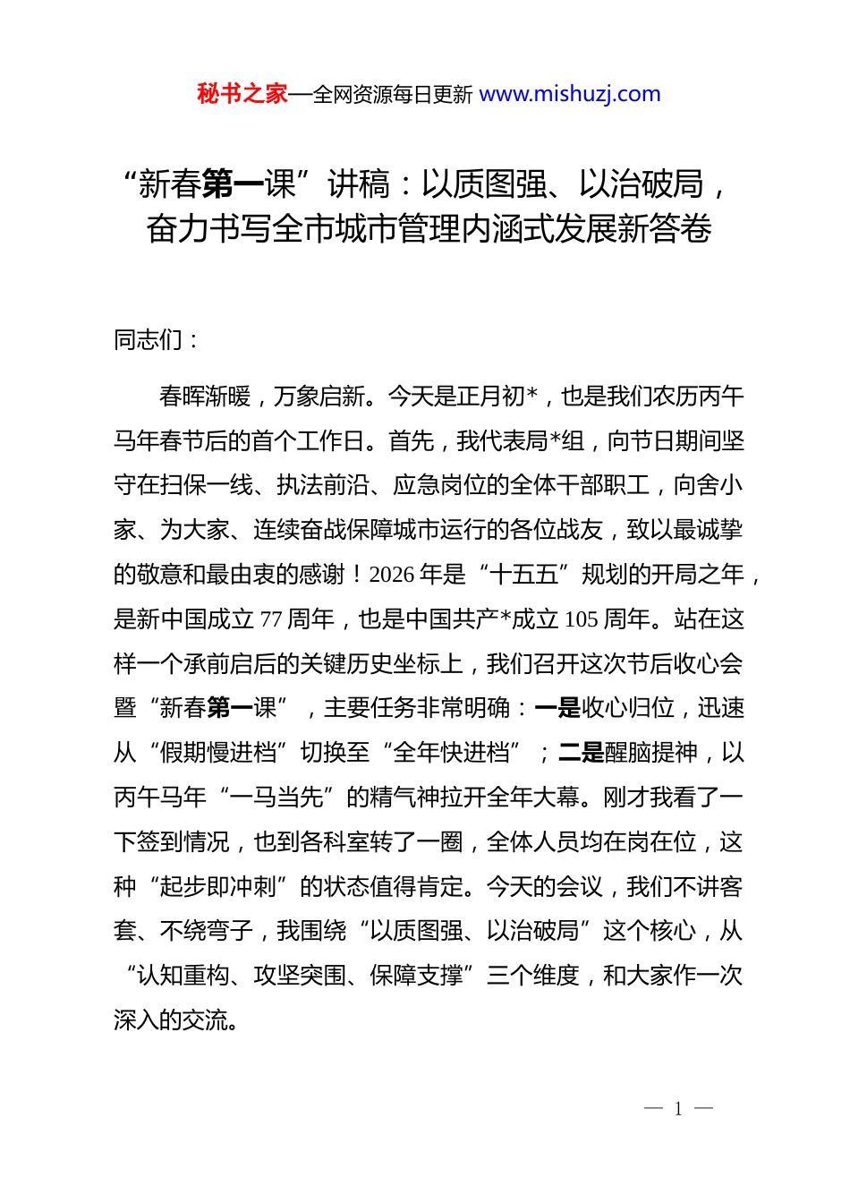 秘书之家—全网资源每日更新 www.mishuzj.com“新春第一课”讲稿:以质图强、以治破局,奋力书写全市城市管理内涵式发展新答卷同志们:春晖渐暖,万象启新。今天是正月初*,也是我们农历丙午马年春节后的首个工作日。首先,我代表局*组,向节日期间坚守在扫保一线、执法前沿、应急岗位的全体干部职工,向舍小家、为大家、连续奋战保障城市运行的各位战友,致以最诚挚的敬意和最由衷的感谢!2026 年是“十五五”规划的开局之年,是新中国成立 77 周年,也是中国共产*成立 105 周年。站在这样一个承前启后的关键历史坐标上,我们召开这次节后收心会暨“新春第一课”,主要任务非常明确:一是收心归位,迅速从“假期慢进档”切换至“全年快进档”;二是醒脑提神,以丙午马年“一马当先”的精气神拉开全年大幕。刚才我看了一下签到情况,也到各科室转了一圈,全体人员均在岗在位,这种“起步即冲刺”的状态值得肯定。今天的会议,我们不讲客套、不绕弯子,我围绕“以质图强、以治破局”这个核心,从“认知重构、攻坚突围、保障支撑”三个维度,和大家作一次深入的交流。— 1 —秘书之家—全网资源每日更新 www.mishuzj.com一、以认知破冰引领行动突围,在深化内涵式发展理念中筑牢思想根基******在中央城市工作会议上深刻指出:“我国城市发展正从大规模增量扩张阶段转向存量提质增效为主的阶段,必须深刻把握、主动适应这一重大变化。”***的这一重大论断,精准标定了当前城市工作的历史方位。对我们*市城市管理局而言,过去十几年,我们经历了城市框架快速拉开的“黄金期”,道路延伸、楼宇林立、建成区面积翻番。但我们必须清醒地看到,那种依靠铺摊子、上项目、扩地盘的粗放式管理模式,在资源约束趋紧、债务管理从严、市民期待升级的今天,已经难以为继。十五五开局之年,我们面临的不是“要不要转”的选择题,而是“转不快、转不深”就可能被淘汰的生存题。因此,今天的第一课,我首先要和大家一起打破思维定势,从思想深处来一场深刻的自我革命,真正把“城市是有机生命体”“城市管理要像绣花一样精细”这些重要理念,转化为我们血液中的行动自觉。(一)从“工程思维”向“人本思维”深度切换,校准城市管理的价值原点。******在论述城市工作时反复强调,“人民城市人民建、人民城市为人民”,这不仅是口号,更是我们— 2 —秘书之家—全网资源每日更新 www.mishuzj.com衡量一切工作得失的根本标准。过去我们容易陷入“技术主义”的窠臼,往往把道路修得宽不宽、灯光亮不亮、垃圾清得及不及时作为工作的全部,这当然重要,但这只是“物”的层面。真正的城市管理,核心是对“人”的服务和对“人”的尊重。一是必须把“用户体验”作为城市管理的首要评价维度。我们要彻底扭转“我管你从”的单向强制逻辑,建立“需求导向”的服务逻辑。2026 年,全局所有业务处室在制定整治方案、审批许可事项、实施行政处罚前,都要前置性地开展市民需求调研。要通过市民服务热线、社区网格员反馈、网络舆情监测等多源数据,精准绘制*市民在城市管理领域的“急难愁盼”热力图。无论是公厕 24 小时开放的具体点位选取,还是夏季瓜果临时摊点的疏导区设置,抑或是老旧小区周边夜间停车位的错时共享,决策权不能只停留在办公桌上,而要真正交到市民手中。二是要将“全龄友好”理念贯穿城市规划管理全过程。当前我市人口结构呈现老龄化与“三孩”政策效应叠加的特征,“一老一小”对城市空间的需求具有高度特异性。我们在人行天桥加装电梯、道路无障碍设施改造、公园绿地适儿化设计等具体项目中,不能再沿用“成年人标准尺码”一刀切。要对全市既有市政设施进行全口径无障碍排查,建立问题清单并纳入2026 年民生实事倒排工期。要让轮椅能畅行、婴儿车能通过、— 3 —秘书之家—全网资源每日更新 www.mishuzj.com老年人有座椅歇脚,这才是城市文明真正的底色。三是要把“情绪价值”纳入城市界面治理的考量范畴。城市不仅仅是物理空间,更是情感空间。我们整治户外广告、规范店招店牌,不能简单地“拆字当先、一铲了之”。2026 年要全面推行“设计师进街区”制度,每个街道都要配...