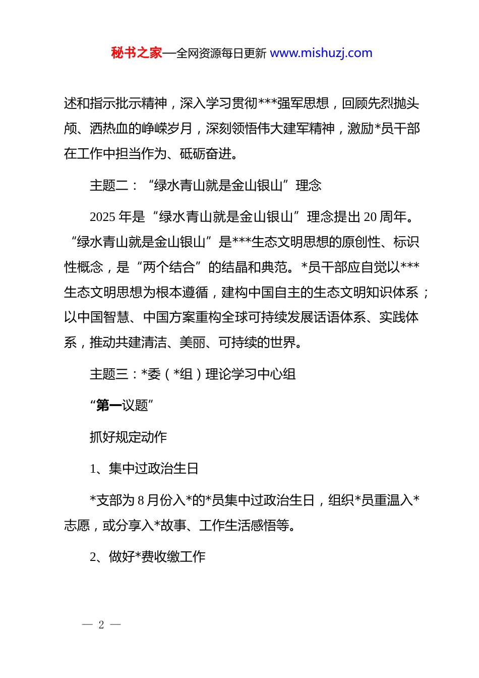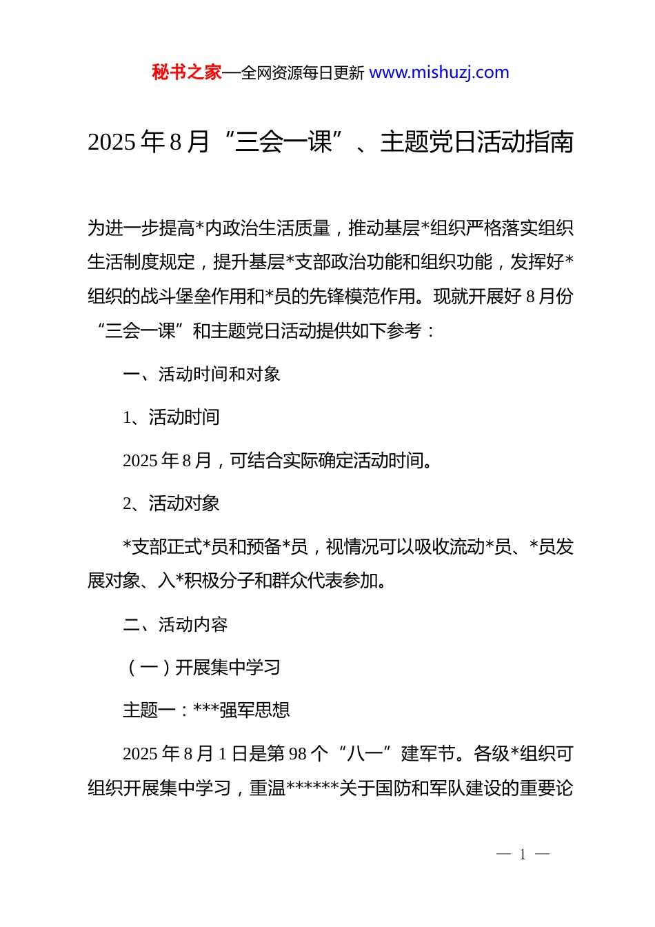 秘书之家—全网资源每日更新 www.mishuzj.com2025 年 8 月“三会一课”、主题党日活动指南为进一步提高*内政治生活质量,推动基层*组织严格落实组织生活制度规定,提升基层*支部政治功能和组织功能,发挥好*组织的战斗堡垒作用和*员的先锋模范作用。现就开展好 8 月份“三会一课”和主题党日活动提供如下参考:一、活动时间和对象1、活动时间2025 年 8 月,可结合实际确定活动时间。2、活动对象*支部正式*员和预备*员,视情况可以吸收流动*员、*员发展对象、入*积极分子和群众代表参加。二、活动内容(一)开展集中学习主题一:***强军思想2025 年 8 月 1 日是第 98 个“八一”建军节。各级*组织可组织开展集中学习,重温******关于国防和军队建设的重要论— 1 —秘书之家—全网资源每日更新 www.mishuzj.com述和指示批示精神,深入学习贯彻***强军思想,回顾先烈抛头颅、洒热血的峥嵘岁月,深刻领悟伟大建军精神,激励*员干部在工作中担当作为、砥砺奋进。主题二:“绿水青山就是金山银山”理念2025 年是“绿水青山就是金山银山”理念提出 20 周年。“绿水青山就是金山银山”是***生态文明思想的原创性、标识性概念,是“两个结合”的结晶和典范。*员干部应自觉以***生态文明思想为根本遵循,建构中国自主的生态文明知识体系;以中国智慧、中国方案重构全球可持续发展话语体系、实践体系,推动共建清洁、美丽、可持续的世界。主题三:*委(*组)理论学习中心组“第一议题”抓好规定动作1、集中过政治生日*支部为 8 月份入*的*员集中过政治生日,组织*员重温入*志愿,或分享入*故事、工作生活感悟等。2、做好*费收缴工作— 2 —秘书之家—全网资源每日更新 www.mishuzj.com按时足额缴纳 8 月份*费。3、其他根据工作需要,研究入*积极分子和发展对象的培养教育、预备*员的教育考察以及预备*员转正等;讨论决定对*员的表彰和处分;讨论决定其他重要事项。还可加入重温入*誓词、谈心谈话、推行*务公开、民主议事等内容。三、开展主题党日活动结合本月重要纪念日、活动日开展主题明确、形式丰富的主题党日活动,切实提高主题党日活动吸引力。四、主题党日实践活动参考主题:1、庆祝中国人民解放军建军 98 周年每年 8 月 1 日是中国人民解放军建军纪念日,由中国人民革命军事委员会设立,旨在纪念中国工农红军成立。中国人民解放军的精神和传统是我们的宝贵财富,激励着我们奋勇前进。为庆祝这一节日,各级*组织可以开展“重温军史悟初心”观影活动,组织*员观看《建军大业》《长津湖》等反映我军历史的影片,并撰写观后感;还可举办“致敬英雄”革命故事宣讲会,邀请模范退役军人分享革命故事,弘扬革命精神,传承红色基— 3 —秘书之家—全网资源每日更新 www.mishuzj.com因。宣讲结束后,可组织*员为老兵送锦旗、鲜花并合影留念,同时将宣讲内容录制成视频分享至线上平台,进一步加强爱国主义教育。2、纪念革命先烈方志敏牺牲 90 周年方志敏是伟大的无产阶级革命家、军事家,土地革命战争时期赣东北和闽浙赣革命根据地的创建人,1935 年英勇就义。在狱中,他写下《可爱的中国》等重要文稿,留下“敌人只能砍下我们的头颅,决不能动摇我们的信仰”的遗言。为弘扬方志敏精神,*组织可开展以下活动:一是讲一堂以方志敏革命精神为主题的*课,介绍其一生,引导*员内化“信仰、爱国、创造、清贫、奉献”精神;二是开展读书分享或红色诵读活动,*员分享方志敏文章章节,感悟其斗争精神和爱国情怀;三是组织观看电影《信仰者》,观影后研讨,追寻革命先烈精神坐标,坚定信仰信念。3、“全民健身日”主题活动2025 年 8 月 8 日是第 17 个“全民健身日”。*组织可组织*员深入学习贯彻******关于体育强国、健康中国的重要论述,并因地制宜开展群众身边的赛事、科学健身指导、全民健身志— 4 —秘书之家—全网资源每日更新 www.mishuzj.com愿服务等活动。具体包括:一是邀请专业人士开展“科学健身大讲堂”,推广科学健身方法,提高*员和群众的参与度;二是根据*员年龄和健康状况,组织健步走、绿色骑行、健身操、趣味运动会等活动,设置“...
