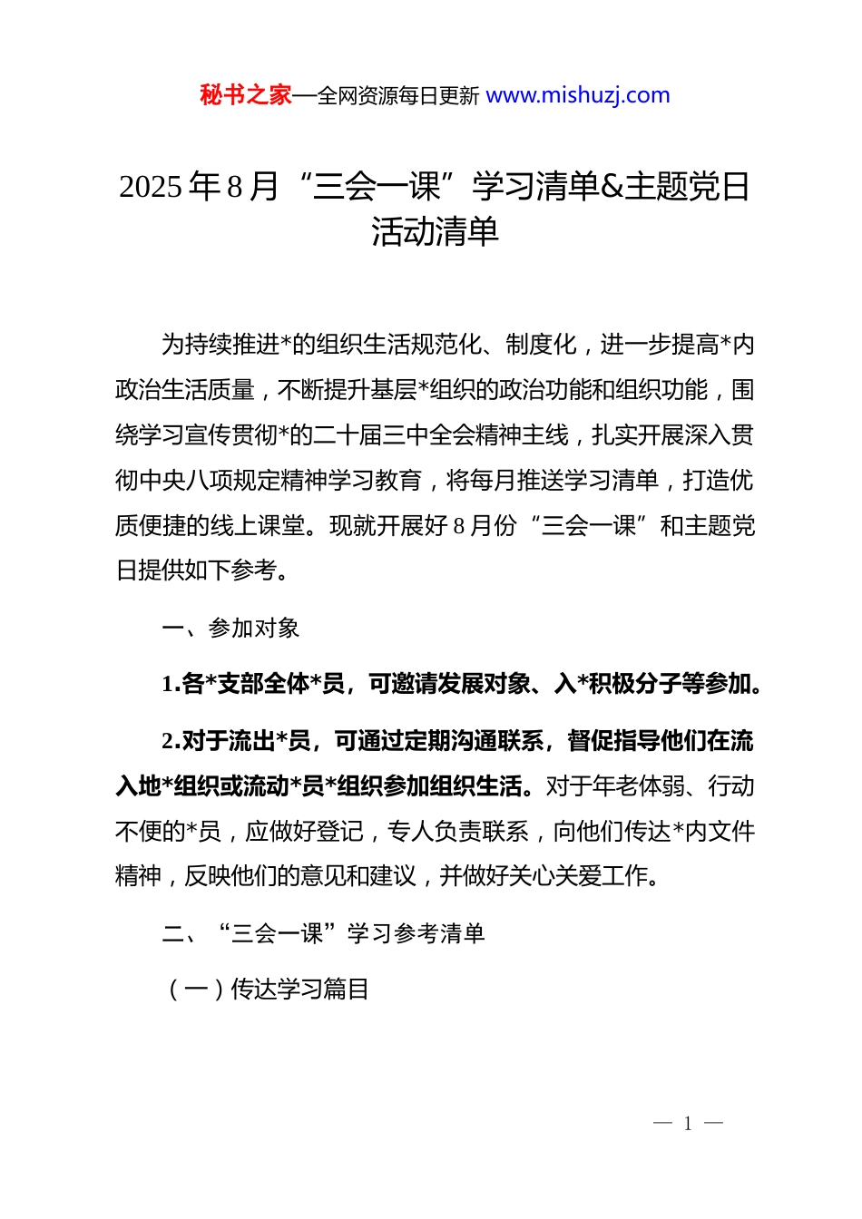 秘书之家—全网资源每日更新 www.mishuzj.com2025 年 8 月“三会一课”学习清单&主题党日活动清单为持续推进*的组织生活规范化、制度化,进一步提高*内政治生活质量,不断提升基层*组织的政治功能和组织功能,围绕学习宣传贯彻*的二十届三中全会精神主线,扎实开展深入贯彻中央八项规定精神学习教育,将每月推送学习清单,打造优质便捷的线上课堂。现就开展好 8 月份“三会一课”和主题党日提供如下参考。一、参加对象1.各*支部全体*员,可邀请发展对象、入*积极分子等参加。2.对于流出*员,可通过定期沟通联系,督促指导他们在流入地*组织或流动*员*组织参加组织生活。对于年老体弱、行动不便的*员,应做好登记,专人负责联系,向他们传达*内文件精神,反映他们的意见和建议,并做好关心关爱工作。二、“三会一课”学习参考清单(一)传达学习篇目— 1 —秘书之家—全网资源每日更新 www.mishuzj.com1.“第一议题”学习内容①***在山西考察时强调努力在推动资源型经济转型发展上迈出新步伐奋力谱写三晋大地推进中国式现代化新篇章②***:坚持从抓作风入手推进全面从严治*把新时代*的自我革命要求进一步落实到位③ 中央城市工作会议在北京举行***发表重要讲话④***对防汛救灾工作作出****⑤ 中共中央政治局召开会议决定召开二十届四中全会分析研究当前经济形势和经济工作中共中央******主持会议2.其他学习内容①《地方*政领导干部生态环境保护责任制规定(试行)》印发②3 起整治形式主义为基层减负典型问题被通报③ 深入贯彻中央八项规定精神学习教育分领域调研座谈会召开④ 中国共产*江西省第十五届委员会第八次全体会议决议⑤**专题听取全省学习教育“回头看”情况汇报— 2 —秘书之家—全网资源每日更新 www.mishuzj.com⑥ 我省举行庆祝中国共产*成立 104 周年座谈会,**代表省委向全省广大*员致以节日问候⑦ 全省巩固拓展脱贫攻坚成果同乡村振兴有效衔接工作会议召开**讲话***主持⑧**在《学习时报》撰文:以作风建设新气象打开现代化建设新天地⑨ 传承红色基因锻造新时代“苏区干部好作风”(二)视频学习篇目1.不负“娘的心”2.红军三过单家集 3.央视《焦点访谈》报道我省 dj 引领基层治理做法三、主题党日安排参考清单主题党日是*支部每月相对固定 1 天开展的*员活动,旨在组织*员集中学习、过组织生活、进行民主议事和志愿服务等。(一)时间要求原则上每月第一周周五开展主题党日。(二)参与对象— 3 —秘书之家—全网资源每日更新 www.mishuzj.com各*支部全体*员,可邀请发展对象、入*积极分子、群众代表等参加。(三)规定动作1.学习*章。原原本本、逐字逐句学习*章,深刻领会*章精神,把握*章的核心要义。2.重温入*誓词。支部书记领誓,全体*员面向*旗庄严宣誓,以铿锵誓言铭记入*初心、坚定理想信念。3.收缴*费。按时足额交纳 8 月份*费。(四)其他动作1.集中过政治生日。*支部为 8 月份入*的*员集中过政治生日,组织*员重温入*志愿,或分享入*故事、工作生活感悟等。2.根据工作需要,研究入*积极分子和发展对象的培养教育、预备*员的教育考察以及预备*员转正等;讨论决定对*员的表彰和处分;讨论决定其他重要事项。还可加入谈心谈话、推行*务公开、民主议事等内容。(五)活动主题建议1.持续推进深入贯彻中央八项规定精神学习教育。深入学— 4 —秘书之家—全网资源每日更新 www.mishuzj.com习贯彻******关于加强*的作风建设的重要论述和*中央最新决策部署,真正把中央八项规定及其实施细则精神领会深、把握准、落实好。将立行立改、集中整治的措施成效及时向*员干部通报,让他们充分了解改了什么、改得怎么样。同时积极征求*员干部对贯彻中央八项规定及其实施细则精神的意见建议,总结开展学习教育期间的好做法、好经验,推进作风建设常态化长效化。2.深入开展庆祝八一建军节主题活动。以“八一”建军节为契机,组织*员开展观看红色影片、邀请模范退役军人宣讲、关怀慰问老兵、参观红色教育基地等活动,回顾革命先烈的峥嵘岁月,引导广大*员继承和发扬*的优良革命传统和作风,涵养爱国奉献的家国情怀,激励广大*员在工作中...