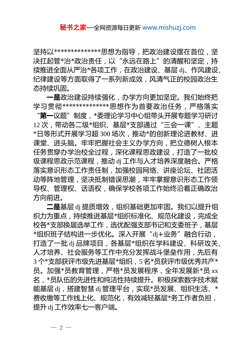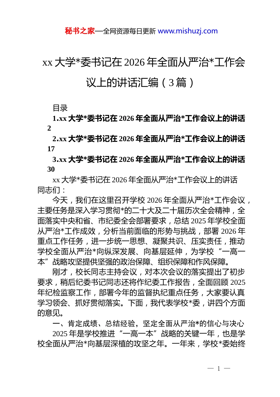 秘书之家—全网资源每日更新 www.mishuzj.comxx 大学*委书记在 2026 年全面从严治*工作会议上的讲话汇编(3 篇)目录1.xx 大学*委书记在 2026 年全面从严治*工作会议上的讲话22.xx 大学*委书记在 2026 年全面从严治*工作会议上的讲话173.xx 大学*委书记在 2026 年全面从严治*工作会议上的讲话30xx 大学*委书记在 2026 年全面从严治*工作会议上的讲话同志们:今天,我们在这里召开学校 2026 年全面从严治*工作会议,主要任务是深入学习贯彻*的二十大及二十届历次全会精神,全面落实中央和省、市纪委全会部署要求,总结 2025 年学校全面从严治*工作成效,分析当前面临的形势与挑战,部署 2026 年重点工作任务,进一步统一思想、凝聚共识、压实责任,推动学校全面从严治*向纵深发展、向基层延伸,为学校“一高一本”战略攻坚提供坚强的政治保障、组织保障和作风保障。刚才,校长同志主持会议,对本次会议的落实提出了初步要求,稍后纪委书记同志还将作纪委工作报告,全面回顾 2025年纪检监察工作,部署今年的监督执纪重点任务,大家要认真学习领会、抓好贯彻落实。下面,我代表学校*委,讲四个方面的意见。一、肯定成绩、总结经验,坚定全面从严治*的信心与决心2025 年是学校推进“一高一本”战略的关键一年,也是学校全面从严治*向基层深植的攻坚之年。一年来,学校*委始终— 1 —秘书之家—全网资源每日更新 www.mishuzj.com坚持以**************思想为指导,把政治建设摆在首位,坚决扛起管*治*政治责任,以“永远在路上”的清醒和坚定,持续推进全面从严治*各项工作,在政治建设、基层 dj、作风建设、纪律建设等方面取得了一系列新成效,风清气正的校园政治生态持续巩固。一是政治建设持续强化,办学方向更加坚定。我们始终把学习贯彻**************思想作为首要政治任务,严格落实“第一议题”制度,*委理论学习中心组带头开展专题学习研讨12 次,带动各二级*组织、基层*支部通过“三会一课”、主题*日等形式开展学习超 300 场次,推动*的创新理论进教材、进课堂、进头脑。牢牢把握社会主义办学方向,把立德树人根本任务贯穿办学治校全过程,深化课程思政建设,打造了一批校级课程思政示范课程,推动 dj 工作与人才培养深度融合。严格落实意识形态工作责任制,加强校园网络、讲座论坛、社团活动等阵地管理,坚决抵制错误思潮,牢牢掌握意识形态工作领导权、管理权、话语权,确保学校各项工作始终沿着正确政治方向前进。二是基层 dj 提质增效,组织基础更加牢固。我们以提升组织力为重点,持续推进基层*组织标准化、规范化建设,完成全校各*支部换届选举工作,选优配强支部书记和支委班子,基层*组织班子结构进一步优化。深入开展“dj+业务”融合行动,打造了一批 dj 品牌项目,各基层*组织在学科建设、科研攻关、人才培养、社会服务等工作中充分发挥战斗堡垒作用,先后有3 个*支部获评市级先进基层*组织,5 名*员获评市级优秀共产*员。加强*员教育管理,严格*员发展程序,全年发展新*员 xx名,*员队伍的先进性和纯洁性持续提升。积极探索数字技术赋能基层 dj,搭建智慧 dj 管理平台,实现*员发展、组织生活、*费收缴等工作线上化、规范化,有效减轻基层*务工作者负担,提升 dj 工作效率七一客户端。— 2 —秘书之家—全网资源每日更新 www.mishuzj.com三是作风建设不断深化,校风教风更加清朗。我们始终坚持严的基调,持续落实中央八项规定及其实施细则精神,深入开展贯彻落实中央八项规定精神学习教育,通过专题读书班、警示教育、案例研讨等形式,引导全体*员干部增强作风建设的思想自觉和行动自觉教育部。坚决纠治“四风”问题,紧盯节假日等重要节点,开展作风建设专项督查 4 次,对苗头性、倾向性问题及时提醒、坚决纠正,全年未发生违反中央八项规定精神的典型问题。大力弘扬求真务实、真抓实干的工作作风,校领导带头深入院系、师生开展调查研究,解决师生急难愁盼问题 xx 件;各职能部门持续优化服务流程,推进“一站式”服务大厅建设,师生办事效率和满意度显著提升。四是纪律建设扎实推进,廉政防线更加坚实。我...