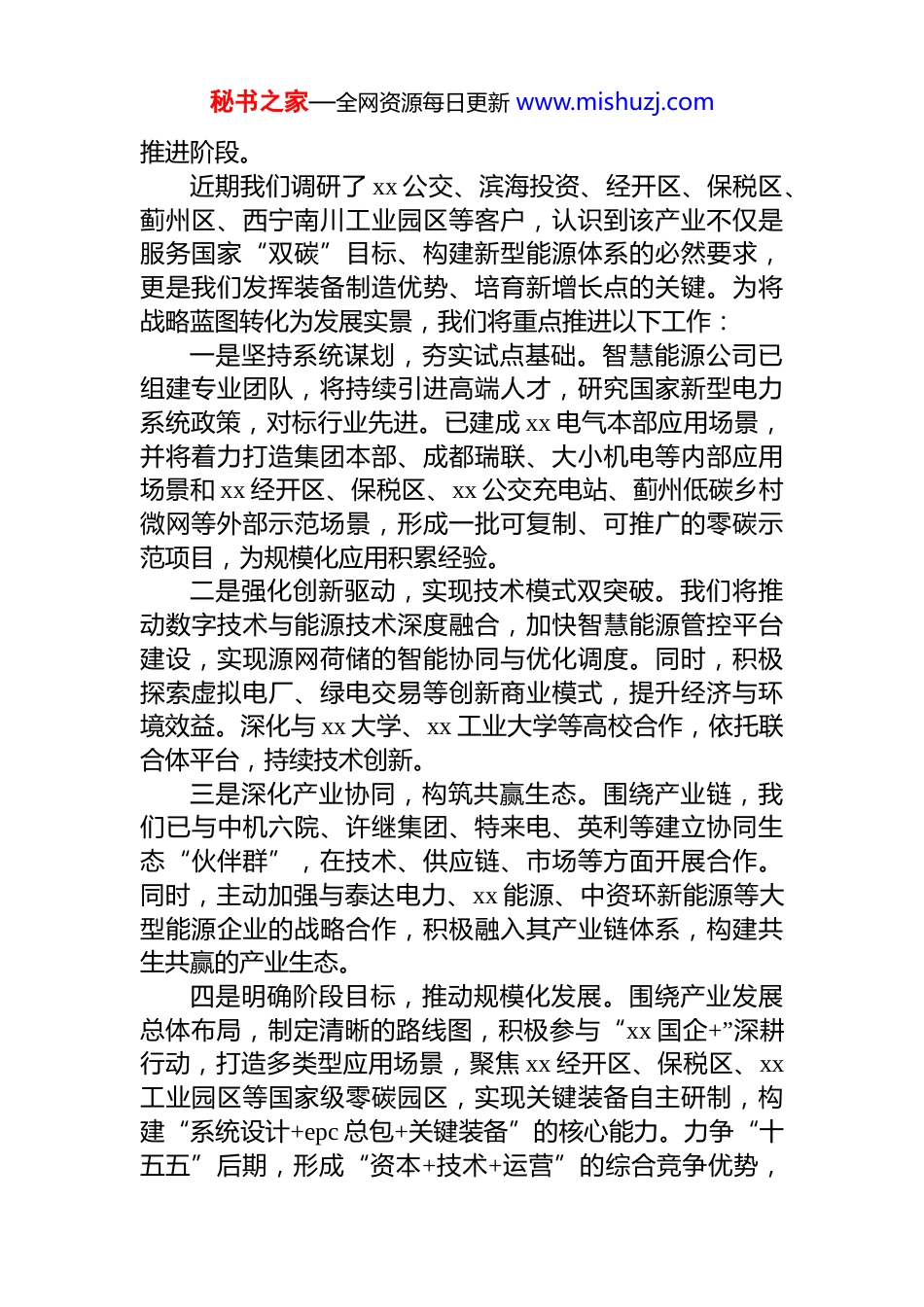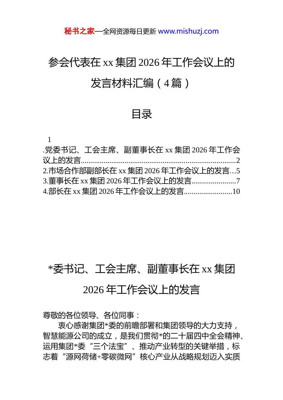 秘书之家—全网资源每日更新 www.mishuzj.com参会代表在 xx 集团 2026 年工作会议上的发言材料汇编(4 篇)目录1.党委书记、工会主席、副董事长在 xx 集团 2026 年工作会议上的发言.................................................................................22.市场合作部副部长在 xx 集团 2026 年工作会议上的发言...53.董事长在 xx 集团 2026 年工作会议上的发言.......................74.部长在 xx 集团 2026 年工作会议上的发言.........................10*委书记、工会主席、副董事长在 xx 集团2026 年工作会议上的发言尊敬的各位领导、各位同事:衷心感谢集团*委的前瞻部署和集团领导的大力支持,智慧能源公司的成立,是我们贯彻*的二十届四中全会精神、运用集团*委“三个法宝”、推动产业转型的关键举措,标志着“源网荷储+零碳微网”核心产业从战略规划迈入实质秘书之家—全网资源每日更新 www.mishuzj.com推进阶段。近期我们调研了 xx 公交、滨海投资、经开区、保税区、蓟州区、西宁南川工业园区等客户,认识到该产业不仅是服务国家“双碳”目标、构建新型能源体系的必然要求,更是我们发挥装备制造优势、培育新增长点的关键。为将战略蓝图转化为发展实景,我们将重点推进以下工作:一是坚持系统谋划,夯实试点基础。智慧能源公司已组建专业团队,将持续引进高端人才,研究国家新型电力系统政策,对标行业先进。已建成 xx 电气本部应用场景,并将着力打造集团本部、成都瑞联、大小机电等内部应用场景和 xx 经开区、保税区、xx 公交充电站、蓟州低碳乡村微网等外部示范场景,形成一批可复制、可推广的零碳示范项目,为规模化应用积累经验。二是强化创新驱动,实现技术模式双突破。我们将推动数字技术与能源技术深度融合,加快智慧能源管控平台建设,实现源网荷储的智能协同与优化调度。同时,积极探索虚拟电厂、绿电交易等创新商业模式,提升经济与环境效益。深化与 xx 大学、xx 工业大学等高校合作,依托联合体平台,持续技术创新。三是深化产业协同,构筑共赢生态。围绕产业链,我们已与中机六院、许继集团、特来电、英利等建立协同生态“伙伴群”,在技术、供应链、市场等方面开展合作。同时,主动加强与泰达电力、xx 能源、中资环新能源等大型能源企业的战略合作,积极融入其产业链体系,构建共生共赢的产业生态。四是明确阶段目标,推动规模化发展。围绕产业发展总体布局,制定清晰的路线图,积极参与“xx 国企+”深耕行动,打造多类型应用场景,聚焦 xx 经开区、保税区、xx工业园区等国家级零碳园区,实现关键装备自主研制,构建“系统设计+epc 总包+关键装备”的核心能力。力争“十五五”后期,形成“资本+技术+运营”的综合竞争优势,秘书之家—全网资源每日更新 www.mishuzj.com打造全国影响力品牌。“源网荷储+零碳微网”是 xx 电气转型发展的战略突破口,也是公司未来的重要方向与支撑。下一步,我们将以智慧能源公司为平台,聚力深耕该产业,拓展智能微电网电能质量治理、智慧配用电解决方案及关键装备制造、泵系统全生命周期服务等业务板块,持续增强战新产业和未来产业综合实力。坚持 dj 引领、改革攻坚、创新赋能、市场开拓协同发力,全面提升公司核心竞争力与行业影响力。新征程催人奋进,新使命重任在肩。我们坚信,在集团*委的坚强领导与统筹支持下,通过全体同仁的协同发力、实干担当,xx 电气一定能在传统产业转型升级与新兴产业发展上取得新突破,全力打造国内一流的新型电力系统装备与综合能源服务商,为集团开创绿色低碳高质量发展新局面作出更大贡献!市场合作部副部长在 xx 集团 2026 年工作会议上的发言尊敬的各位领导、各位同事:上午,聆听了 xx 书记的讲话和 xx 同志的报告,我感触颇深。杰军书记强调,集团“十四五”特别是新班子调整以来的三年是 xx 发展历史上极为特殊的时期,并用三个关键词“稳”“进”“好”,高度凝练了这一特殊时期的特点,发出了“重走长征路、重整行装再出发”的号角,这让我深刻认识到,集团在这三年里,面对复杂多变的市场环境和诸多挑战...