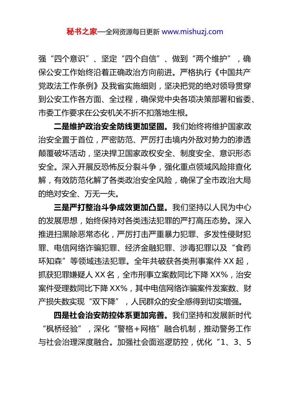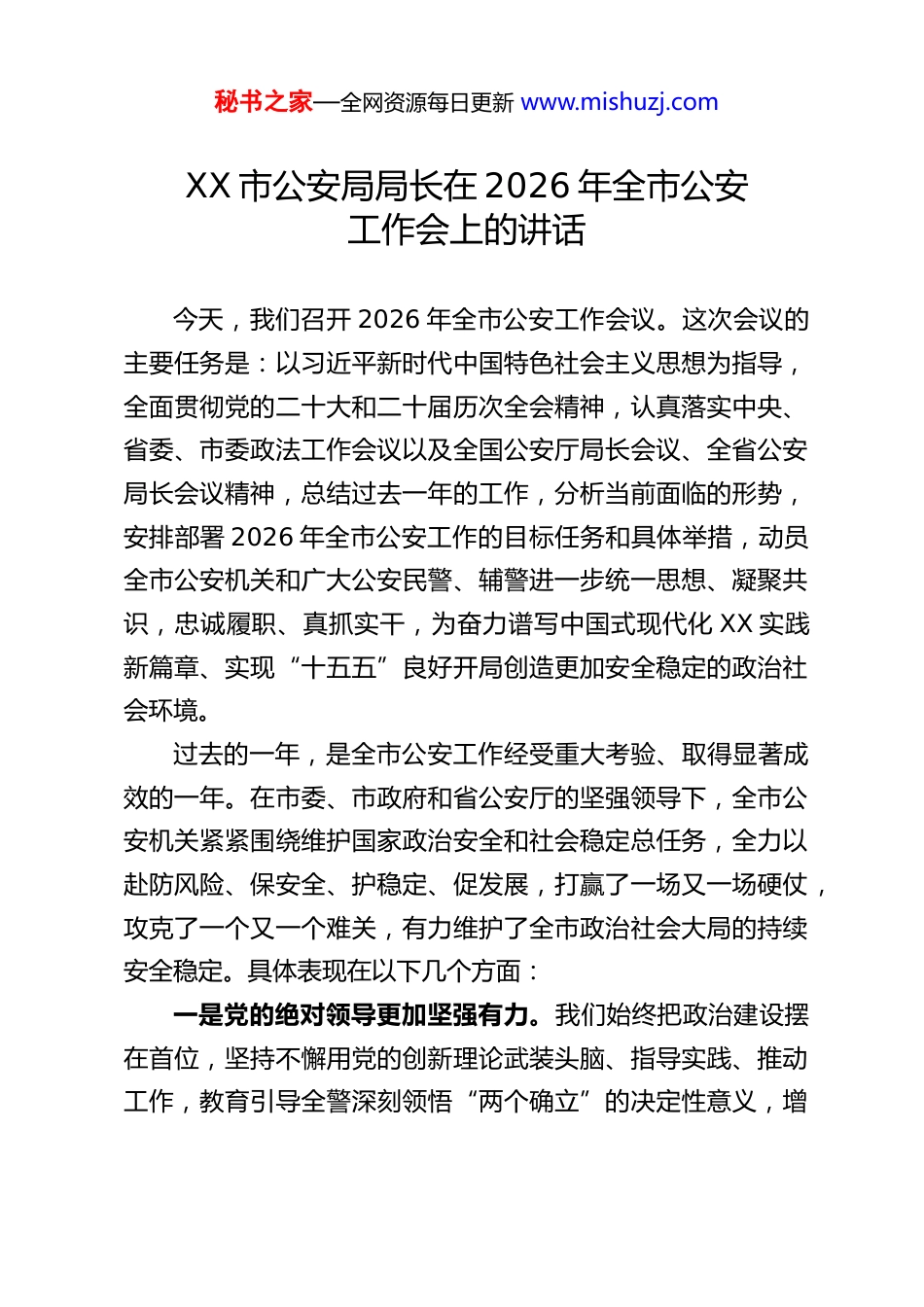 秘书之家—全网资源每日更新 www.mishuzj.comXX 市公安局局长在 2026 年全市公安工作会上的讲话今天,我们召开 2026 年全市公安工作会议。这次会议的主要任务是:以习近平新时代中国特色社会主义思想为指导,全面贯彻党的二十大和二十届历次全会精神,认真落实中央、省委、市委政法工作会议以及全国公安厅局长会议、全省公安局长会议精神,总结过去一年的工作,分析当前面临的形势,安排部署 2026 年全市公安工作的目标任务和具体举措,动员全市公安机关和广大公安民警、辅警进一步统一思想、凝聚共识,忠诚履职、真抓实干,为奋力谱写中国式现代化 XX 实践新篇章、实现“十五五”良好开局创造更加安全稳定的政治社会环境。过去的一年,是全市公安工作经受重大考验、取得显著成效的一年。在市委、市政府和省公安厅的坚强领导下,全市公安机关紧紧围绕维护国家政治安全和社会稳定总任务,全力以赴防风险、保安全、护稳定、促发展,打赢了一场又一场硬仗,攻克了一个又一个难关,有力维护了全市政治社会大局的持续安全稳定。具体表现在以下几个方面:一是党的绝对领导更加坚强有力。我们始终把政治建设摆在首位,坚持不懈用党的创新理论武装头脑、指导实践、推动工作,教育引导全警深刻领悟“两个确立”的决定性意义,增秘书之家—全网资源每日更新 www.mishuzj.com强“四个意识”、坚定“四个自信”、做到“两个维护”,确保公安工作始终沿着正确政治方向前进。严格执行《中国共产党政法工作条例》及我省实施细则,坚决把党的绝对领导贯穿到公安工作各方面、全过程,确保党中央各项决策部署和省委、市委工作要求在公安机关不折不扣落地生根。二是维护政治安全防线更加坚固。我们始终将维护国家政治安全置于首位,严密防范、严厉打击境内外敌对势力的渗透颠覆破坏活动,坚决捍卫国家政权安全、制度安全、意识形态安全。深入开展反恐怖反分裂斗争,强化重点领域风险排查化解,有效防范化解了各类政治安全风险,确保了全市政治大局的绝对安全、万无一失。三是严打整治斗争成效更加凸显。我们坚持以人民为中心的发展思想,始终保持对各类违法犯罪的严打高压态势。深入推进扫黑除恶常态化,严厉打击严重暴力犯罪、多发性侵财犯罪、电信网络诈骗犯罪、经济金融犯罪、涉毒犯罪以及“食药环知森”等领域违法犯罪。全年共破获各类刑事案件 XX 起,抓获犯罪嫌疑人 XX 名,全市刑事立案数同比下降 XX%,治安案件受理数同比下降 XX%,其中电信网络诈骗案件发案数、财产损失数实现“双下降”,人民群众的安全感得到切实增强。四是社会治安防控体系更加完善。我们坚持和发展新时代“枫桥经验”,深化“警格+网格”融合机制,推动警务工作与社会治理深度融合。加强社会面巡逻防控,优化“1、3、5秘书之家—全网资源每日更新 www.mishuzj.com分钟”快速反应机制,提高见警率、管事率和控制力、震慑力。强化重点行业、重点场所、重点物品的安全监管,排查整治各类安全隐患 XX 处。特别是面对去年我市文旅市场阶段性“流量出圈”带来的巨大安保压力,我们超前谋划、周密部署、全警动员,实现了重大活动、重要节点“零差错、零事故、零负面舆情”,确保了社会面秩序平稳有序。五是警务运行机制改革更加深入。我们聚焦战斗力标准,立足实战化要求,持续深化警务运行机制改革。优化“情指行”一体化运行机制,提升预测预警预防和应急处突能力。推动派出所“两队一室”改革提质增效,夯实基层基础。深化“放管服”改革,推出了一系列便民利企新举措,在户籍、交管、出入境等领域实现了更多事项“网上办、掌上办、一次办”,群众和企业办事更加便捷高效,服务经济社会发展的成色更足。六是公安铁军队伍建设更加扎实。我们严格落实全面从严管党治警要求,扎实开展主题教育,强化纪律作风教育整顿。加强实战化教育训练,组织开展各类专业培训和比武竞赛,队伍履职能力得到新提升。坚持严管厚爱结合、激励约束并重,落实从优待警各项措施,队伍的凝聚力、向心力、战斗力进一步增强。在各项急难险重任务面前,广大民警辅警冲锋在前、无私奉献,涌现出一大批先进集体和先进个人,充分展现了...