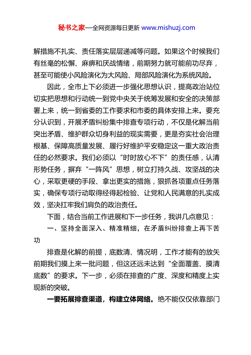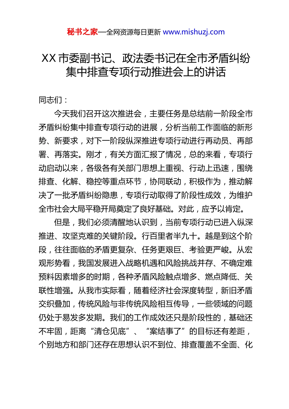 秘书之家—全网资源每日更新 www.mishuzj.comXX 市委副书记、政法委书记在全市矛盾纠纷集中排查专项行动推进会上的讲话同志们:今天我们召开这次推进会,主要任务是总结前一阶段全市矛盾纠纷集中排查专项行动的进展,分析当前工作面临的新形势、新要求,对下一阶段纵深推进专项行动进行再动员、再部署、再落实。刚才,有关方面汇报了情况,总的来看,专项行动启动以来,各级各有关部门思想上重视、行动上迅速,围绕排查、化解、稳控等重点环节,协同联动,积极作为,推动解决了一批矛盾纠纷隐患,专项行动取得了阶段性成效,为维护全市社会大局平稳开局奠定了良好基础。对此,应予以肯定。但是,我们必须清醒地认识到,当前专项行动已进入纵深推进、攻坚克难的关键阶段。行百里者半九十。越是到这个阶段,往往面临的矛盾更复杂、任务更艰巨、考验更严峻。从宏观形势看,我国发展进入战略机遇和风险挑战并存、不确定难预料因素增多的时期,各种矛盾风险触点增多、燃点降低、关联性增强。从我市实际看,随着经济社会深度转型,新旧矛盾交织叠加,传统风险与非传统风险相互传导,一些领域的问题仍处于易发多发期。我们的工作成效还只是阶段性的,基础还不牢固,距离“清仓见底”、“案结事了”的目标还有差距,个别地方和部门还存在思想认识不到位、排查覆盖不全面、化秘书之家—全网资源每日更新 www.mishuzj.com解措施不扎实、责任落实层层递减等问题。如果这个时候我们有丝毫的松懈、麻痹和厌战情绪,前期努力就可能前功尽弃,甚至可能使小风险演化为大风险、局部风险演化为系统风险。因此,全市上下必须进一步强化思想认识,提高政治站位切实把思想和行动统一到党中央关于统筹发展和安全的决策部署上来,统一到省委的工作要求和市委的具体安排上来。要充分认识到,开展矛盾纠纷集中排查专项行动,不仅是化解当前突出矛盾、维护群众切身利益的现实需要,更是夯实社会治理根基、保障高质量发展、履行好维护平安稳定这一重大政治责任的必然要求。我们必须以“时时放心不下”的责任感,认清形势任务,摒弃“一阵风”思想,树立打持久战、攻坚战的决心,采取更硬的手段、拿出更实的措施,狠抓各项重点任务落实,确保专项行动取得经得起检验、让党和人民满意的扎实成效,坚决扛牢我们肩负的政治责任。下面,结合当前工作进展和下一步任务,我讲几点意见:一、坚持全面深入、精准精细,在矛盾纠纷排查上再下苦功排查是化解的前提,底数清、情况明,工作才能有的放矢前期我们摸上来一批问题,但这还远未达到“全面覆盖、摸清底数”的要求。下一步,必须在排查的广度、深度和精度上实现新的突破。一要拓展排查渠道,构建立体网络。绝不能仅仅依靠部门秘书之家—全网资源每日更新 www.mishuzj.com自查、坐等上报。要推动排查力量下沉、关口前移。充分发挥“网格化”管理的基础性作用,将网格员、楼栋长、村民小组长等力量全面发动起来,成为感知风险的“神经末梢”。要深化“线上+线下”结合,线上要善于运用大数据、信息化手段,加强对网络舆情、热线投诉、信访平台等各类信息的动态监测和关联分析,敏锐捕捉苗头性、倾向性问题;线下要组织干部常态化开展入户走访、现场调研、座谈交流,深入田间地头、厂矿企业、社区家庭,与群众面对面,听真话、察实情。要拓宽社会参与渠道,完善有奖举报、信息员等制度,鼓励群众和各行各业从业人员主动反映身边的风险隐患。总之,要织密一张横向到边、纵向到底、人技结合、专群联动的排查网络,确保不留下任何死角盲区。二要丰富排查手段,提升专业能力。排查不是简单的登记造册,而要具备发现隐性矛盾、预判风险等级的专业眼光。要组织开展专项排查,针对征地拆迁、劳动争议、环境保护、金融借贷、房地产、教育医疗等重点领域,以及特定利益群体,开展“拉网式”、“梳篦式”的专项排查清理。要引入风险评估机制,对排查出的矛盾隐患,不能仅仅记录在案,要立即进行初步的风险评估,根据其性质、涉及人数、激烈程度、发展趋势等,划分高、中、低风险等级,建立动态管理台账,为精准施策提供依据。要善于运用法治思维进行分析,判断矛盾的核心诉求...