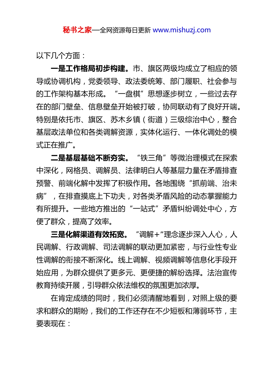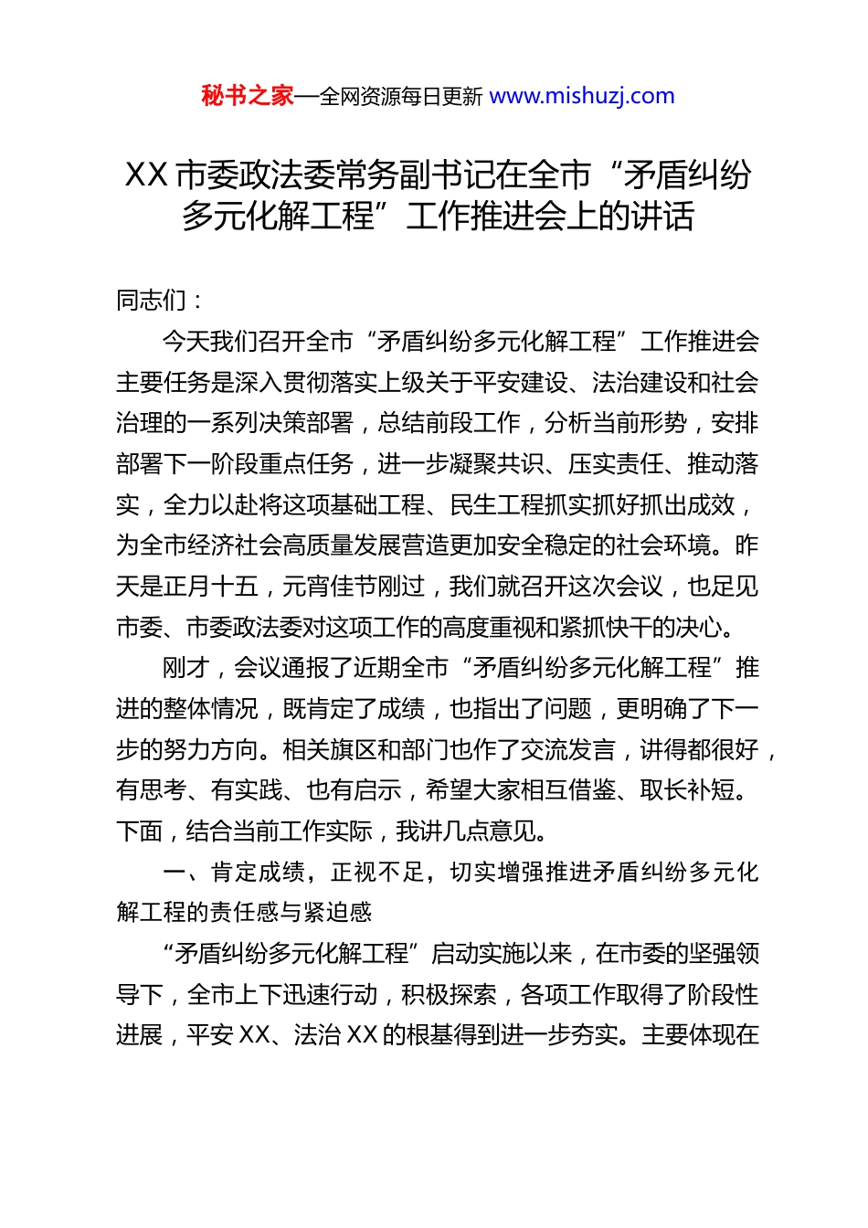 秘书之家—全网资源每日更新 www.mishuzj.comXX 市委政法委常务副书记在全市“矛盾纠纷多元化解工程”工作推进会上的讲话同志们:今天我们召开全市“矛盾纠纷多元化解工程”工作推进会主要任务是深入贯彻落实上级关于平安建设、法治建设和社会治理的一系列决策部署,总结前段工作,分析当前形势,安排部署下一阶段重点任务,进一步凝聚共识、压实责任、推动落实,全力以赴将这项基础工程、民生工程抓实抓好抓出成效,为全市经济社会高质量发展营造更加安全稳定的社会环境。昨天是正月十五,元宵佳节刚过,我们就召开这次会议,也足见市委、市委政法委对这项工作的高度重视和紧抓快干的决心。刚才,会议通报了近期全市“矛盾纠纷多元化解工程”推进的整体情况,既肯定了成绩,也指出了问题,更明确了下一步的努力方向。相关旗区和部门也作了交流发言,讲得都很好,有思考、有实践、也有启示,希望大家相互借鉴、取长补短。下面,结合当前工作实际,我讲几点意见。一、肯定成绩,正视不足,切实增强推进矛盾纠纷多元化解工程的责任感与紧迫感“矛盾纠纷多元化解工程”启动实施以来,在市委的坚强领导下,全市上下迅速行动,积极探索,各项工作取得了阶段性进展,平安 XX、法治 XX 的根基得到进一步夯实。主要体现在秘书之家—全网资源每日更新 www.mishuzj.com以下几个方面:一是工作格局初步构建。市、旗区两级均成立了相应的领导或协调机构,党委领导、政法委统筹、部门履职、社会参与的工作架构基本形成。“一盘棋”思想逐步树立,一些过去存在的部门壁垒、信息壁垒开始被打破,协同联动有了良好开端。特别是依托市、旗区、苏木乡镇(街道)三级综治中心,整合基层政法单位和各类调解资源,实体化运行、一体化调处的模式正在推广。二是基层基础不断夯实。“铁三角”等微治理模式在探索中深化,网格员、调解员、法律明白人等基层力量在矛盾排查预警、前端化解中发挥了积极作用。各地围绕“抓前端、治未病”,在排查摸底上下功夫,对各类矛盾风险的动态掌握能力有所提升。一些地方推出的“一站式”矛盾纠纷调处中心,方便了群众,提高了效率。三是化解渠道有效拓宽。“调解+”理念逐步深入人心,人民调解、行政调解、司法调解的联动更加紧密,与行业性专业性调解的衔接不断深化。线上调解、视频调解等信息化手段开始应用,为群众提供了更多元、更便捷的解纷选择。法治宣传教育持续开展,引导群众依法维权的氛围更加浓厚。在肯定成绩的同时,我们必须清醒地看到,对照上级的要求和群众的期盼,我们的工作还存在不少短板和薄弱环节,主要表现在:秘书之家—全网资源每日更新 www.mishuzj.com一是思想认识有待深化。有的地区、部门对这项工作的极端重要性和基础性地位认识还不够到位,没有真正将其摆在突出位置,与中心工作、业务工作结合不够紧密,“说起来重要、忙起来次要”的现象一定程度上存在。树立和践行正确政绩观,在此项工作中的具体体现还不够充分。二是责任落实有待压实。主体责任、属地责任、部门责任在一些环节还存在虚化、软化的问题。“谁主管谁负责”原则落实不够彻底,一些跨部门、跨地区的复杂矛盾纠纷,推诿扯皮、协同不力的情况仍有发生。压力传导存在层层递减现象,特别是到基层末梢,力量、保障、能力与任务要求不匹配的问题较为突出。三是工作机制有待健全。从排查、预警、受理、分流、调解到化解、反馈、回访的“闭环”管理体系尚未完全形成,各个环节的衔接不够顺畅,存在“断点”。多元化解的联动性、整体性效能尚未充分发挥,资源整合、信息共享、效力确认等方面还存在堵点。考核评价、督导问责等保障机制需要进一步强化和优化。四是能力水平有待提升。部分基层调解组织和调解员的法律政策水平、专业素养、群众工作能力与新形势下的矛盾化解要求相比还有差距,化解新型、复杂矛盾纠纷的办法不多、效果不佳。运用法治思维和法治方式化解矛盾、引导群众的能力需要普遍加强。秘书之家—全网资源每日更新 www.mishuzj.com当前,我国发展进入战略机遇和风险挑战并存、不确定难预料因素增多的时期。具体到我市,改革发展稳定的任务十分繁重,经济转型、...