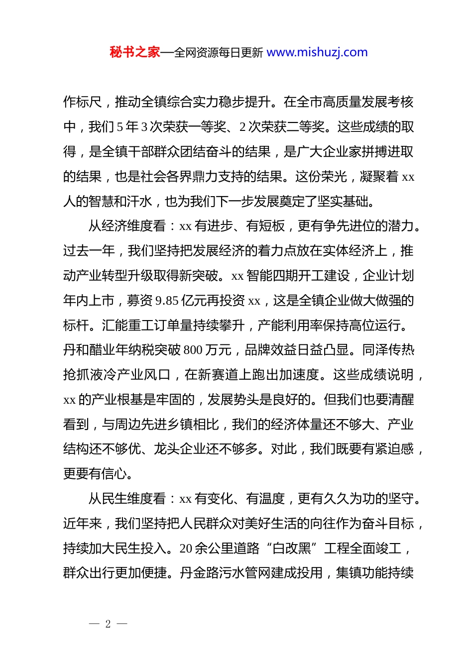 秘书之家—全网资源每日更新 www.mishuzj.com在 xx 镇高质量发展暨实干争先动员大会上的讲话同志们:今天,我们在这里隆重召开 xx 镇高质量发展暨实干争先动员大会。这次会议的主要任务是,全面总结 2025 年度工作成效,表彰先进、鼓舞士气,部署 2026 年高质量发展重点任务,动员全镇上下进一步凝聚实干争先合力,奋力开创 xx 发展新局面。刚才,几位同志作了很好的交流发言,谈思路、讲举措、表决心,听了很受启发。xx 同志就深化作风效能建设、提升执行力作了具体部署,我都赞同。希望各部门、各村、各企业认真抓好落实。借此机会,我讲三点意见,与大家交流。一、回望来路、审视当下,在多维对比中看清 xx 的“位”与“势”“十四五”以来,全镇上下团结一心、攻坚克难,经济社会发展取得了显著成效。回顾这几年的奋斗历程,我们既有成绩的喜悦,也有清醒的认知。从时间维度看:xx 有荣光、有传承,更有接续奋斗的底气。五年来,我们始终坚持高质量发展不动摇,把争先进位作为工— 1 —秘书之家—全网资源每日更新 www.mishuzj.com作标尺,推动全镇综合实力稳步提升。在全市高质量发展考核中,我们 5 年 3 次荣获一等奖、2 次荣获二等奖。这些成绩的取得,是全镇干部群众团结奋斗的结果,是广大企业家拼搏进取的结果,也是社会各界鼎力支持的结果。这份荣光,凝聚着 xx人的智慧和汗水,也为我们下一步发展奠定了坚实基础。从经济维度看:xx 有进步、有短板,更有争先进位的潜力。过去一年,我们坚持把发展经济的着力点放在实体经济上,推动产业转型升级取得新突破。xx 智能四期开工建设,企业计划年内上市,募资 9.85 亿元再投资 xx,这是全镇企业做大做强的标杆。汇能重工订单量持续攀升,产能利用率保持高位运行。丹和醋业年纳税突破 800 万元,品牌效益日益凸显。同泽传热抢抓液冷产业风口,在新赛道上跑出加速度。这些成绩说明,xx 的产业根基是牢固的,发展势头是良好的。但我们也要清醒看到,与周边先进乡镇相比,我们的经济体量还不够大、产业结构还不够优、龙头企业还不够多。对此,我们既要有紧迫感,更要有信心。从民生维度看:xx 有变化、有温度,更有久久为功的坚守。近年来,我们坚持把人民群众对美好生活的向往作为奋斗目标,持续加大民生投入。20 余公里道路“白改黑”工程全面竣工,群众出行更加便捷。丹金路污水管网建成投用,集镇功能持续— 2 —秘书之家—全网资源每日更新 www.mishuzj.com完善。xx 卫生院新住院大楼建成投用,基层医疗条件显著改善。这些看得见、摸得着的变化,让群众切实感受到了发展带来的实惠。同时,我们也要看到,群众对美好生活的期待在不断提高,我们在教育、医疗、养老等领域还存在不少短板,需要持续用劲、久久为功。从文化维度看:xx 有认同、有期盼,更有重塑形象的紧迫。xx 历史悠久、人文荟萃,有着深厚的文化底蕴。香醋酿造技艺代代相传,面粉加工产业特色鲜明,这些都是我们的宝贵财富。但在新时代背景下,如何把资源优势转化为发展优势,把文化底蕴转化为品牌影响力,还需要我们做大量工作。我们鲜明提出:xx 要振兴,必靠产业兴;xx 要进位,必靠项目进!这既是我们的发展理念,更是我们的行动宣言。二、认清机遇、直面挑战,在理性分析中把准 xx 的“时”与“路”当前,xx 发展正处在爬坡过坎、滚石上山的关键时期。我们既要看到难得的历史机遇,也要正视面临的困难挑战,在变局中开新局,在危机中育新机。(一)机遇前所未有,必须抢抓风口、主动作为从区位优势看:重大基础设施项目加速落地,正在重塑 xx的发展格局。丹金高速 xx 段已正式进场施工,这条高速公路是— 3 —秘书之家—全网资源每日更新 www.mishuzj.com国家和江苏省重点交通基础设施项目,设计为双向六车道,设计速度 120 公里/小时,全长约 41 公里,其中丹阳段约 28.6 公里,总投资超过 145 亿元。项目建成后,xx 将实现 15 分钟内便捷上高速,与周边城市联系将更加紧密,物流成本将大幅降低,区域一体化发展将迈出实质性步伐。s358 东延项目也在加快谋划推进,这条一级公路全长约 ...