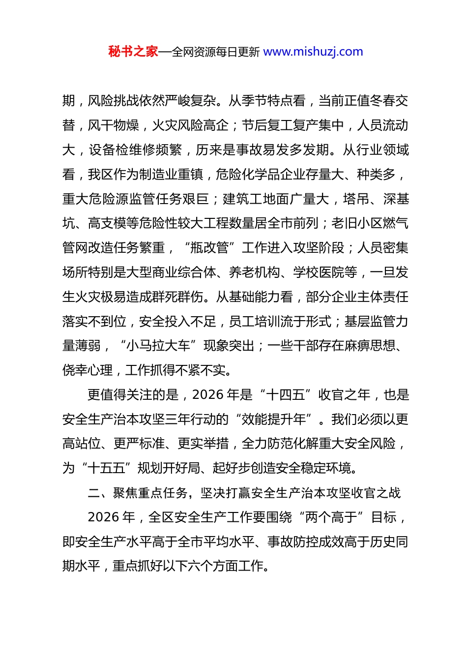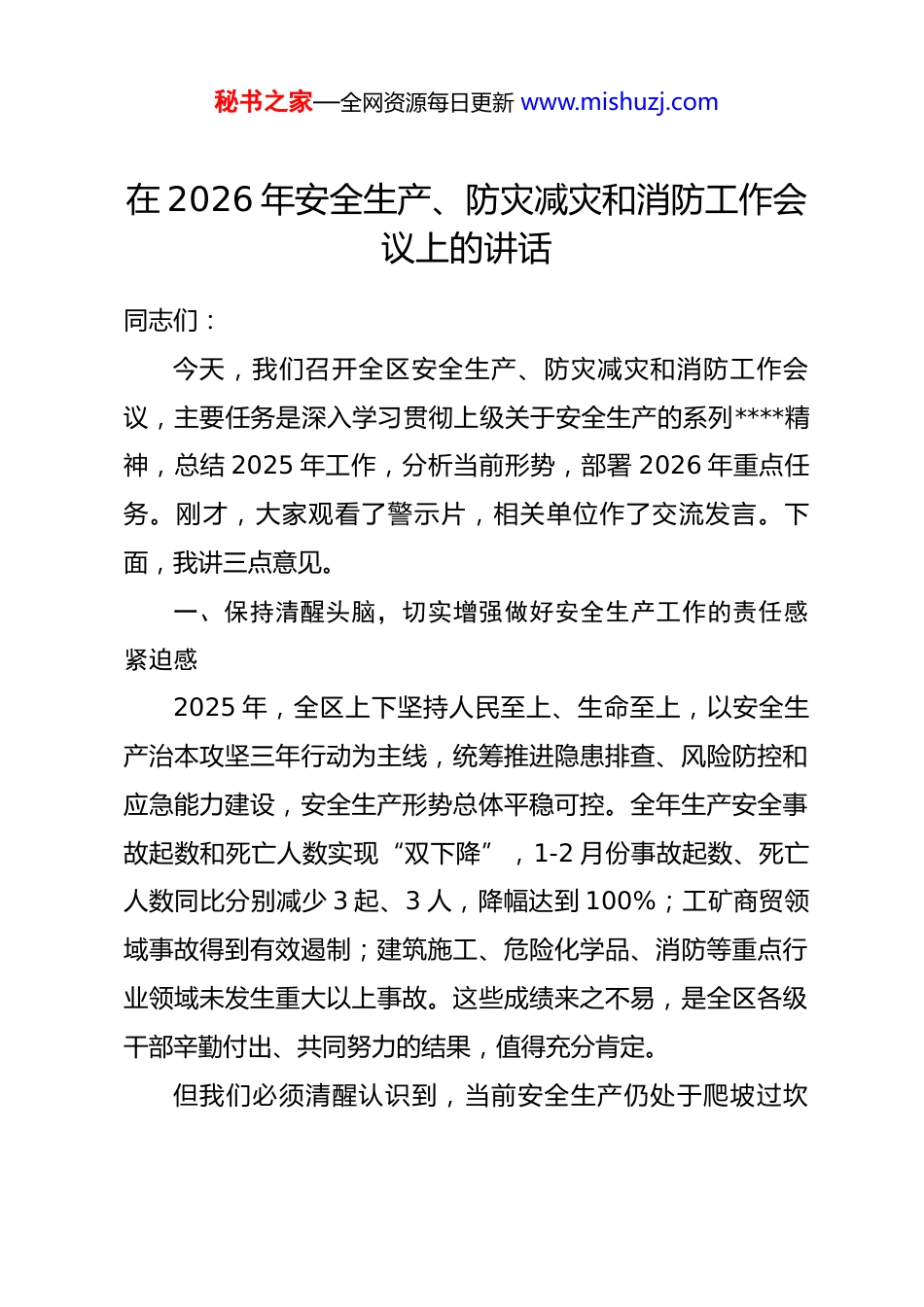 秘书之家—全网资源每日更新 www.mishuzj.com在 2026 年安全生产、防灾减灾和消防工作会议上的讲话同志们:今天,我们召开全区安全生产、防灾减灾和消防工作会议,主要任务是深入学习贯彻上级关于安全生产的系列****精神,总结 2025 年工作,分析当前形势,部署 2026 年重点任务。刚才,大家观看了警示片,相关单位作了交流发言。下面,我讲三点意见。一、保持清醒头脑,切实增强做好安全生产工作的责任感紧迫感2025 年,全区上下坚持人民至上、生命至上,以安全生产治本攻坚三年行动为主线,统筹推进隐患排查、风险防控和应急能力建设,安全生产形势总体平稳可控。全年生产安全事故起数和死亡人数实现“双下降”,1-2 月份事故起数、死亡人数同比分别减少 3 起、3 人,降幅达到 100%;工矿商贸领域事故得到有效遏制;建筑施工、危险化学品、消防等重点行业领域未发生重大以上事故。这些成绩来之不易,是全区各级干部辛勤付出、共同努力的结果,值得充分肯定。但我们必须清醒认识到,当前安全生产仍处于爬坡过坎秘书之家—全网资源每日更新 www.mishuzj.com期,风险挑战依然严峻复杂。从季节特点看,当前正值冬春交替,风干物燥,火灾风险高企;节后复工复产集中,人员流动大,设备检维修频繁,历来是事故易发多发期。从行业领域看,我区作为制造业重镇,危险化学品企业存量大、种类多,重大危险源监管任务艰巨;建筑工地面广量大,塔吊、深基坑、高支模等危险性较大工程数量居全市前列;老旧小区燃气管网改造任务繁重,“瓶改管”工作进入攻坚阶段;人员密集场所特别是大型商业综合体、养老机构、学校医院等,一旦发生火灾极易造成群死群伤。从基础能力看,部分企业主体责任落实不到位,安全投入不足,员工培训流于形式;基层监管力量薄弱,“小马拉大车”现象突出;一些干部存在麻痹思想、侥幸心理,工作抓得不紧不实。更值得关注的是,2026 年是“十四五”收官之年,也是安全生产治本攻坚三年行动的“效能提升年”。我们必须以更高站位、更严标准、更实举措,全力防范化解重大安全风险,为“十五五”规划开好局、起好步创造安全稳定环境。二、聚焦重点任务,坚决打赢安全生产治本攻坚收官之战2026 年,全区安全生产工作要围绕“两个高于”目标,即安全生产水平高于全市平均水平、事故防控成效高于历史同期水平,重点抓好以下六个方面工作。秘书之家—全网资源每日更新 www.mishuzj.com第一,决战决胜三年行动,提升本质安全水平。2026 年是治本攻坚三年行动的收官之年,前期我们部署了“十大行动 ” , 2024 年 隐 患 攻 坚 年 基 本 消 除 了 重 大 事 故 隐 患 存量,2025 年强基固本年夯实了基层基础。今年作为效能提升年,核心任务是固化长效机制,提升治理效能。要全面完成企业主要负责人安全教育培训全覆盖,确保危化、建筑、工贸等重点行业企业“一把手”参训率 100%、考核合格率 100%。要深化安全科技支撑和工程治理行动,推动高危行业领域“机械化换人、自动化减人、智能化无人”改造,年底前危化企业重大危险源在线监测预警系统接入率达到 100%,规模以上工贸企业安全风险分级管控和隐患排查治理双重预防机制建设率达到 95%以上。要强化从业人员素质提升,督促企业依法配备注册安全工程师,特种作业人员持证上岗率必须达到 100%。第二,严管严控高危领域,筑牢风险防范堤坝。危险化学品方面,要依托智慧监管平台,对全区重大危险源实行 24 小时在线监测,运用智能数据模型自动识别库存异常、超期储存等 9 类风险因子,实现“智能预警-在线处置-动态评估”闭环管理。要深化油气储存基地、硝化工艺企业等专项整治,对不符合安全条件的企业坚决予以关闭退出。建筑施工方面,要全面推行“智慧工地”监管系统,实现人员实名制管理、塔吊等秘书之家—全网资源每日更新 www.mishuzj.com大型机械安全监控、扬尘噪声监测、安全隐患在线报送等功能全覆盖。特别要加强对深基坑、高支模、起重机械等危险性较大分部分项工程的专项监管,严格落实“谁施工谁负责、谁监理谁负责”责任。消防方面,要聚焦人员密集场所,持续深化隐...